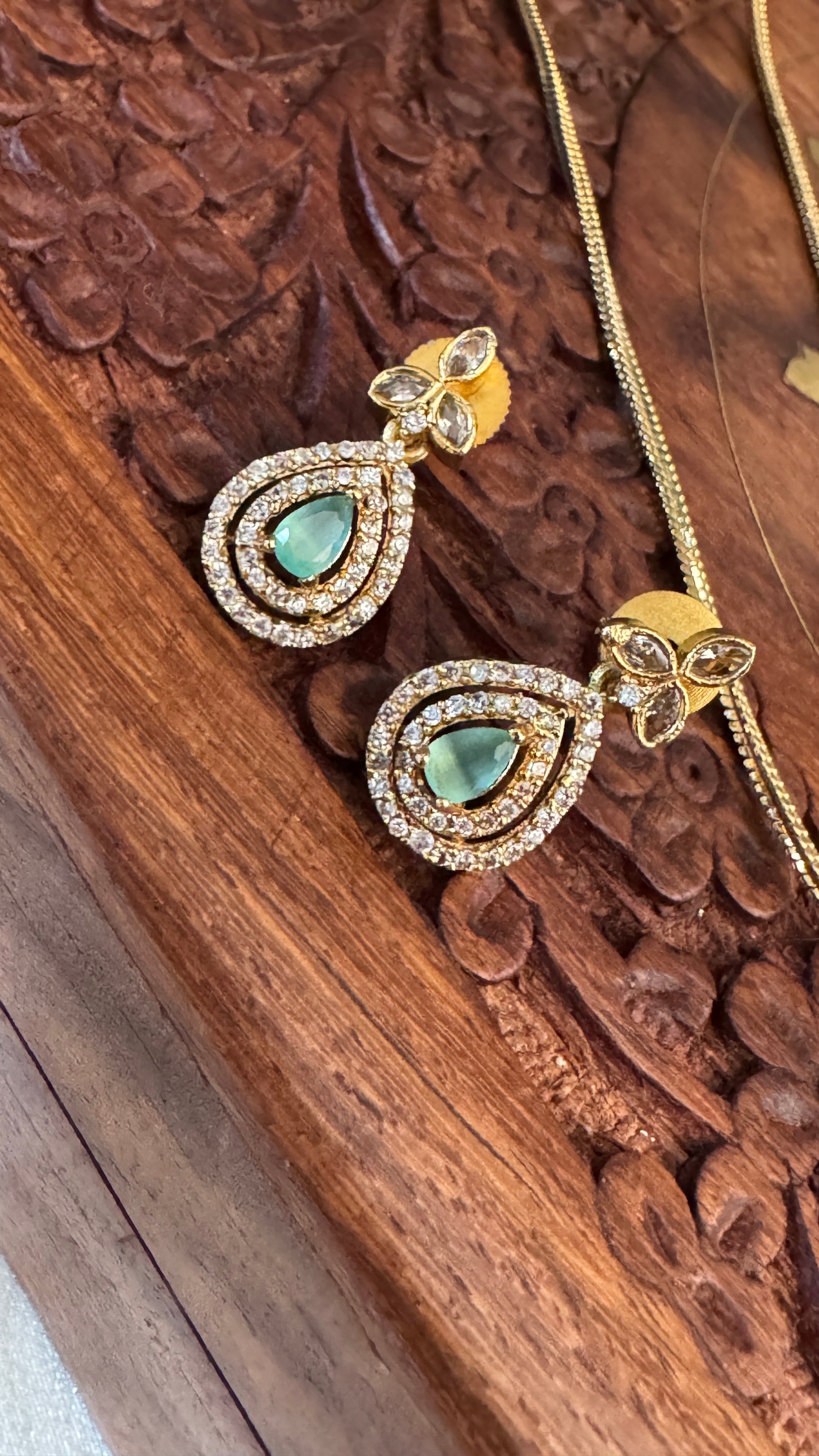 Elevate your style with this exquisite gold-coated necklace set, crafted with premium finishing and timeless design. The set features a delicate chain, leading to a beautifully designed pendant adorned with a mint green stone at its center. The pendant is further enhanced with sparkling accents that add a touch of elegance and shine to the overall look. ✨