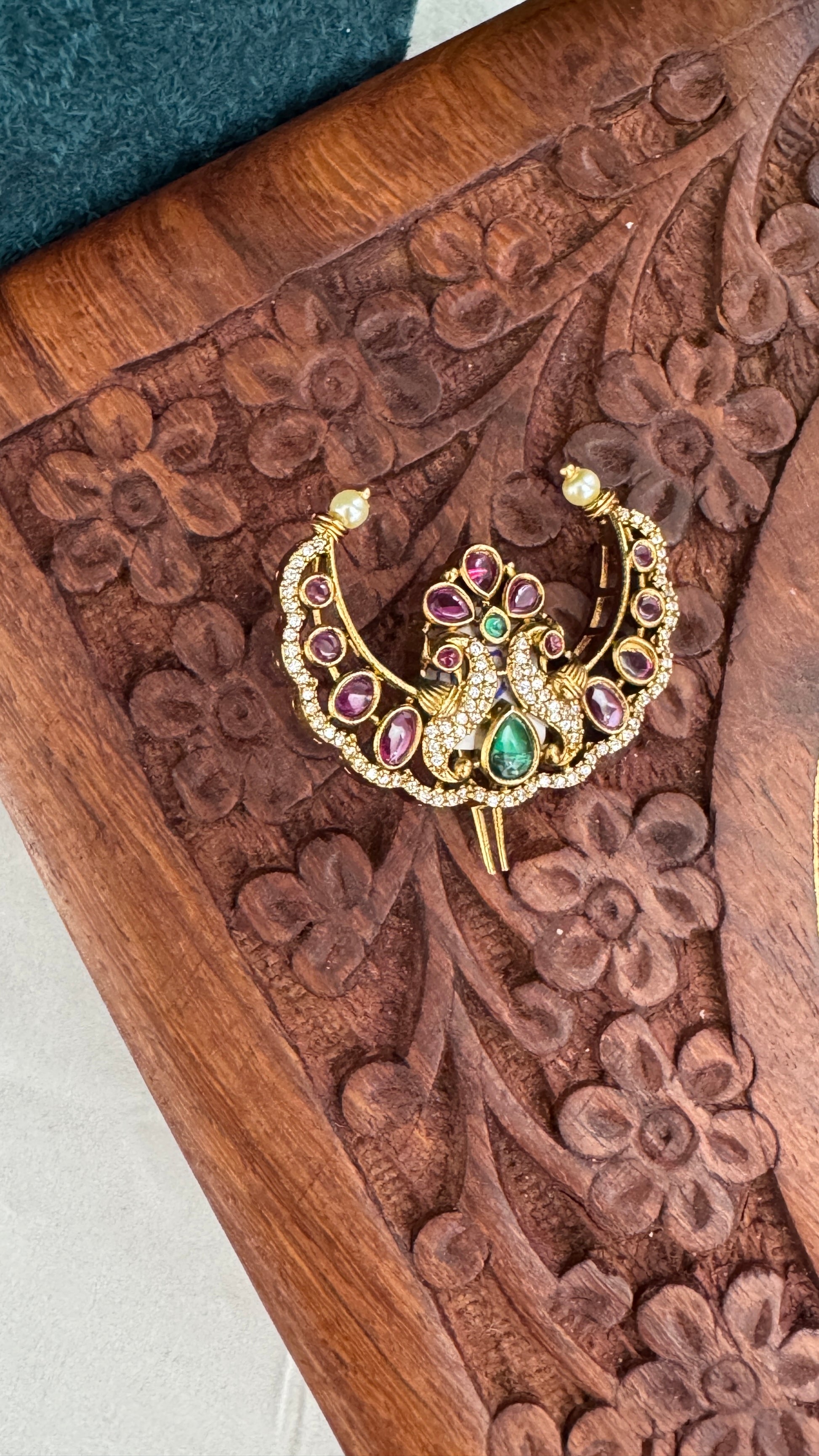 Enhance your hairstyle with this traditional Indian Wedding Hair Brooch (Jadai Billai / Choti Decoration) featuring intricate peacock designs. Crafted with fine detailing, this timeless piece beautifully complements silk sarees, temple jewellery sets, and bridal attire.