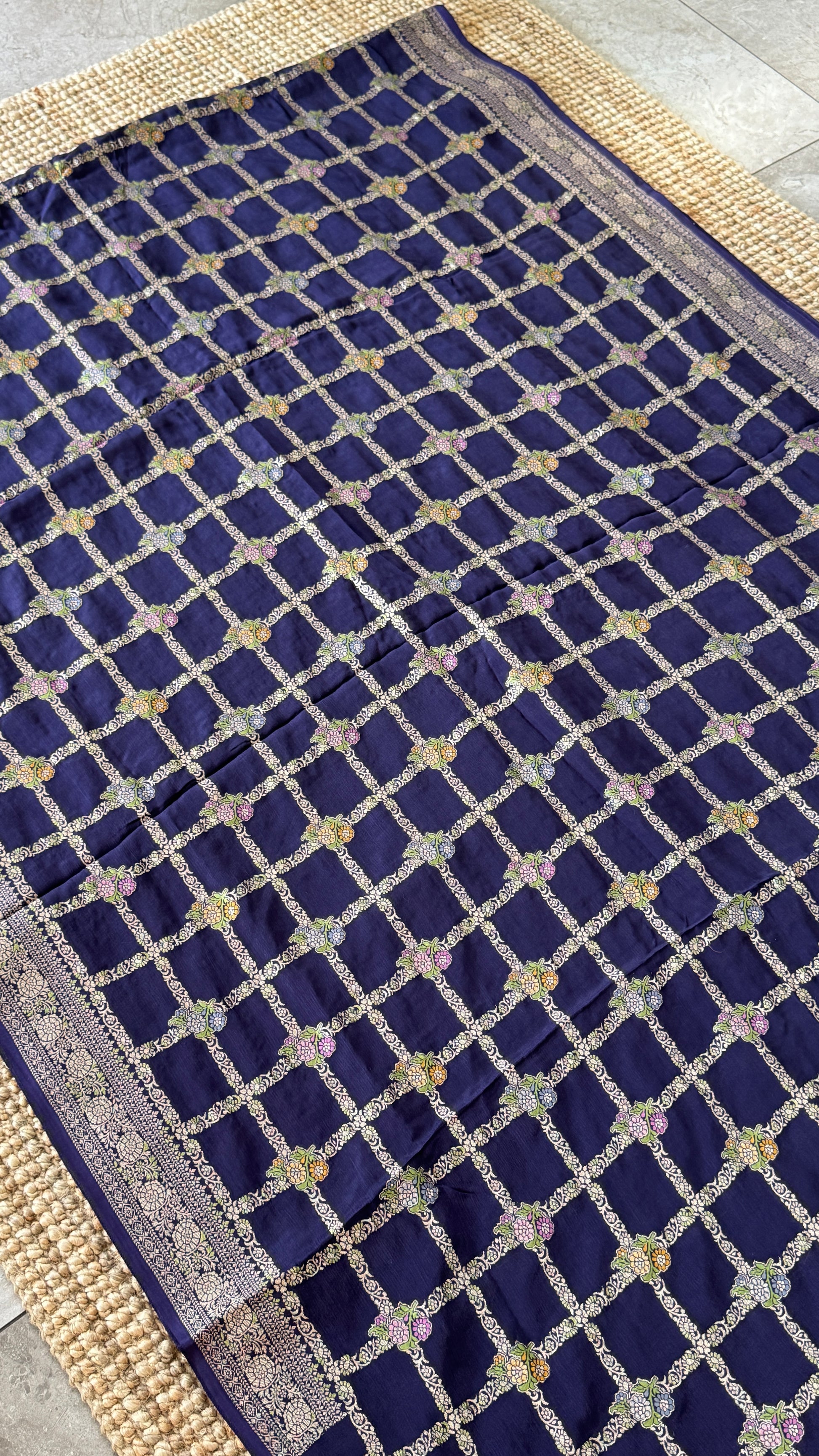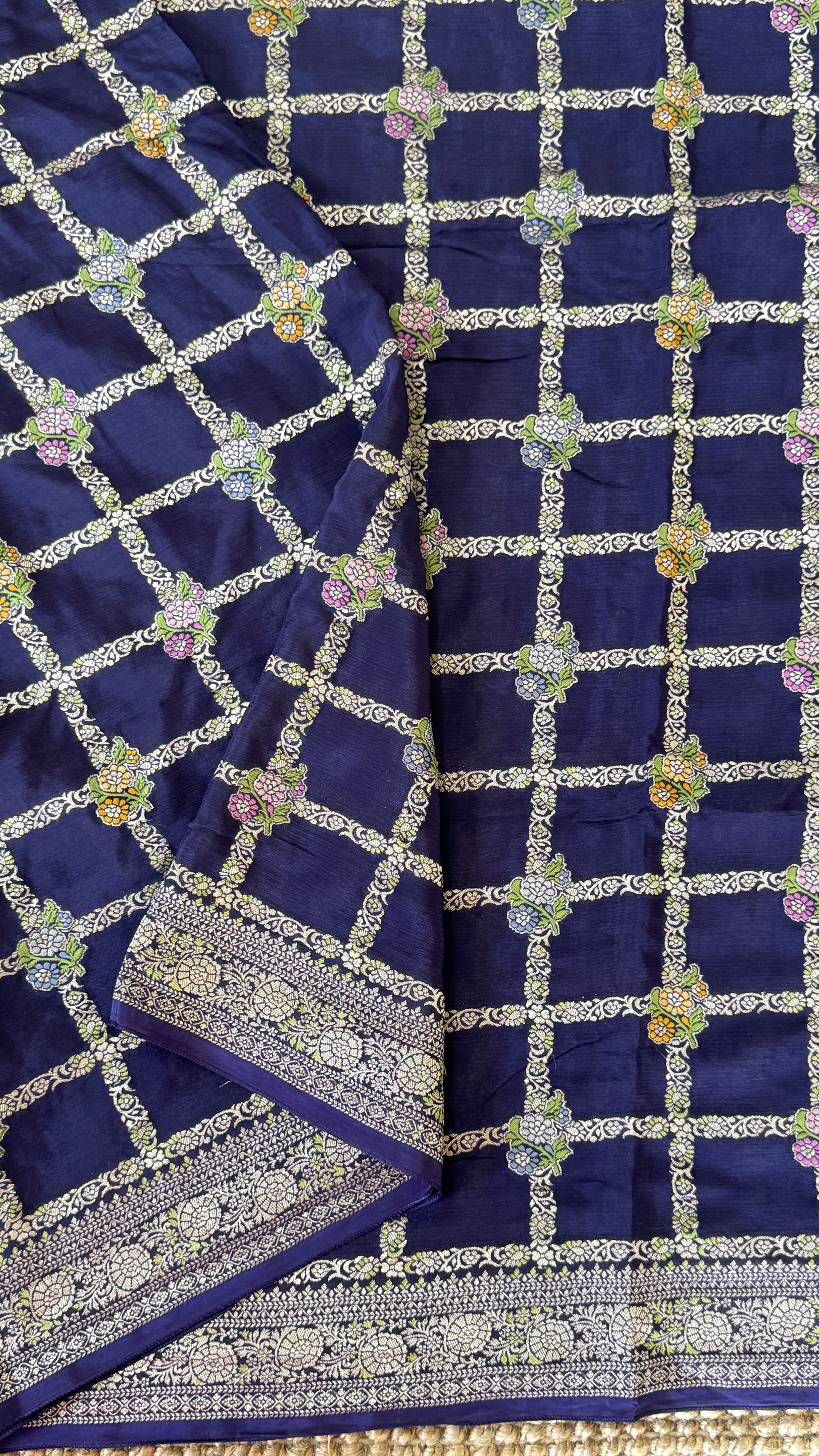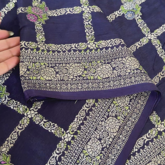A stunning fusion of traditional artistry and timeless sophistication, this Crushed Munga Silk Banarasi Saree in royal navy blue is a true masterpiece of craftsmanship.