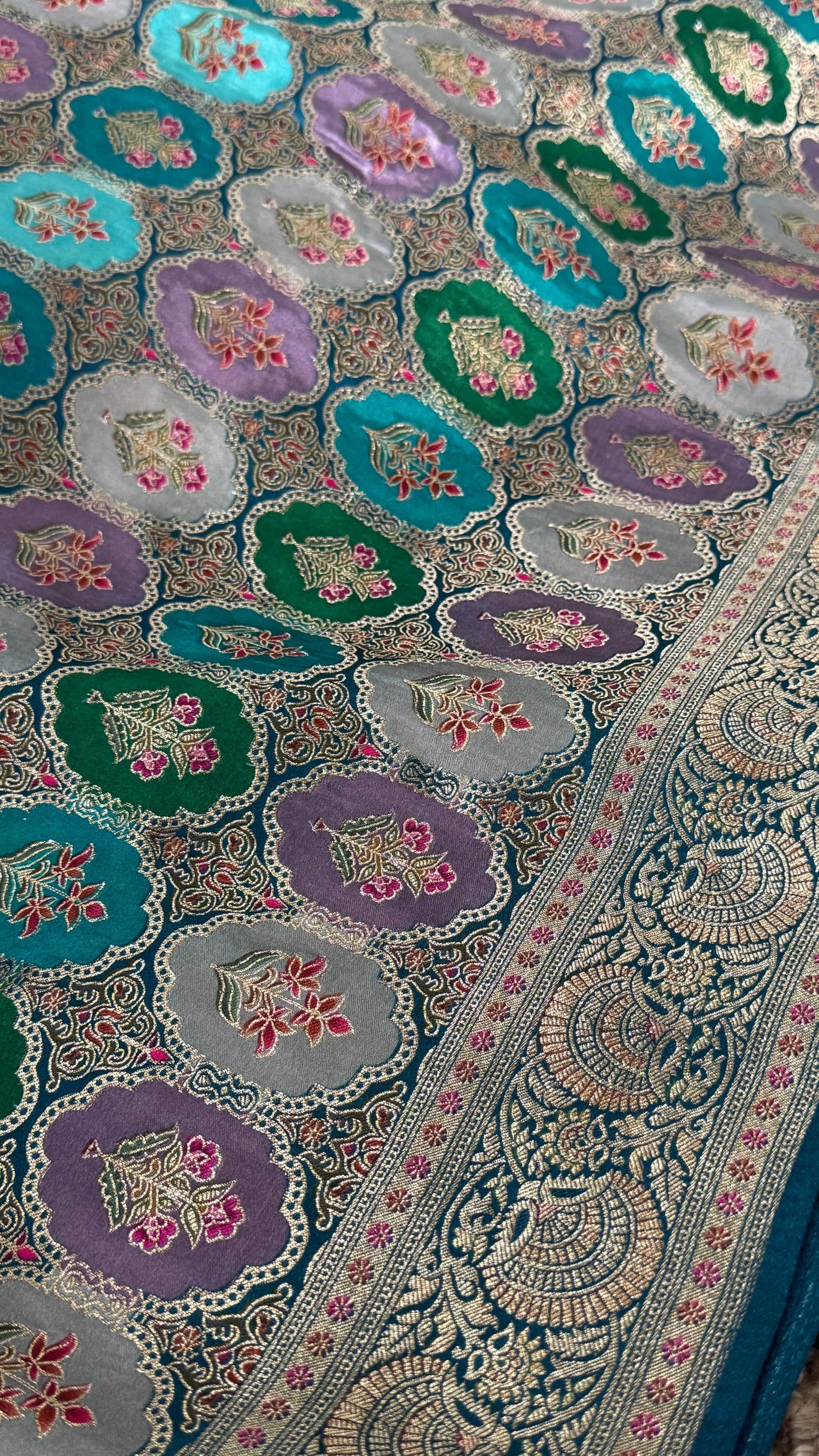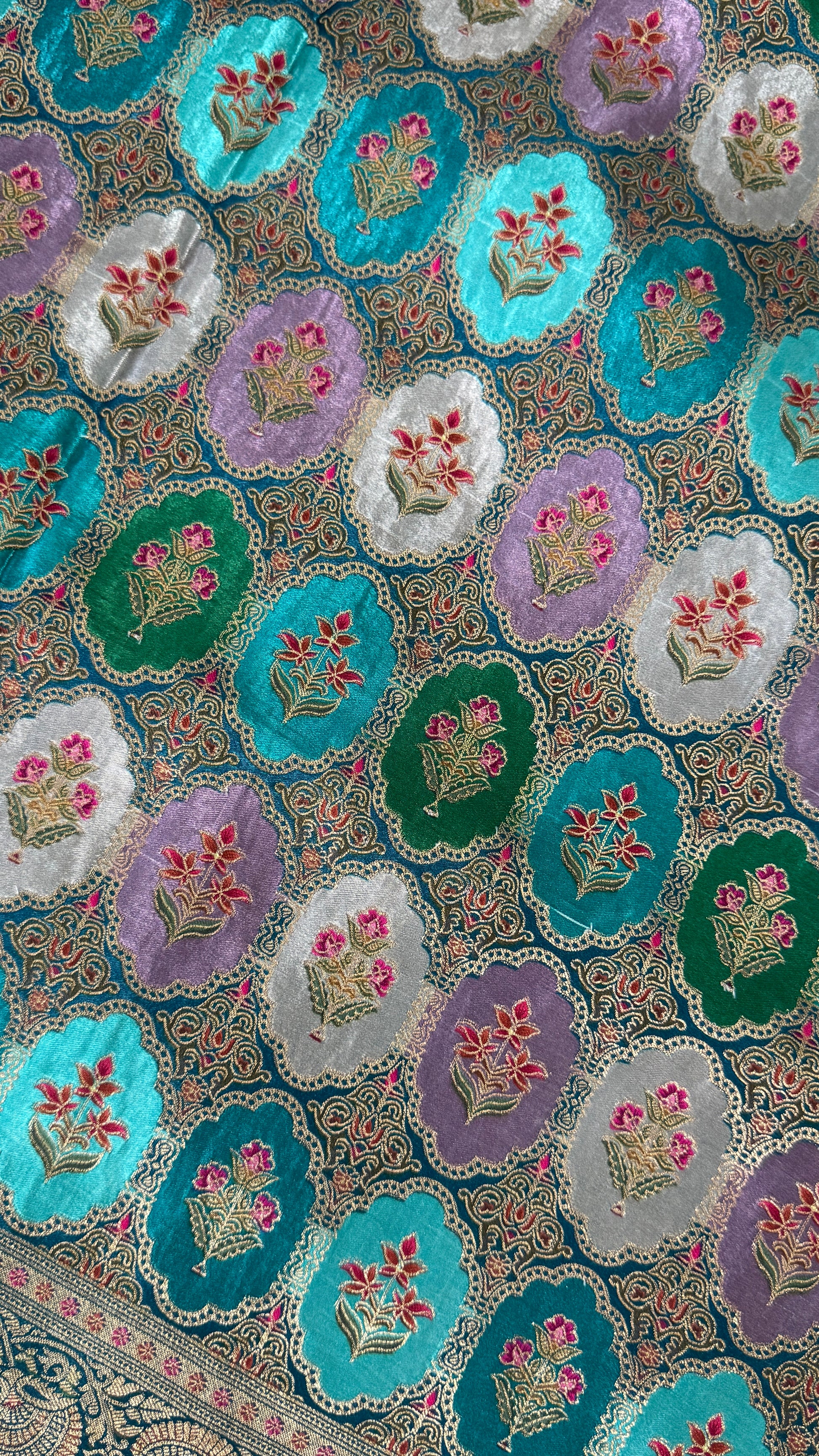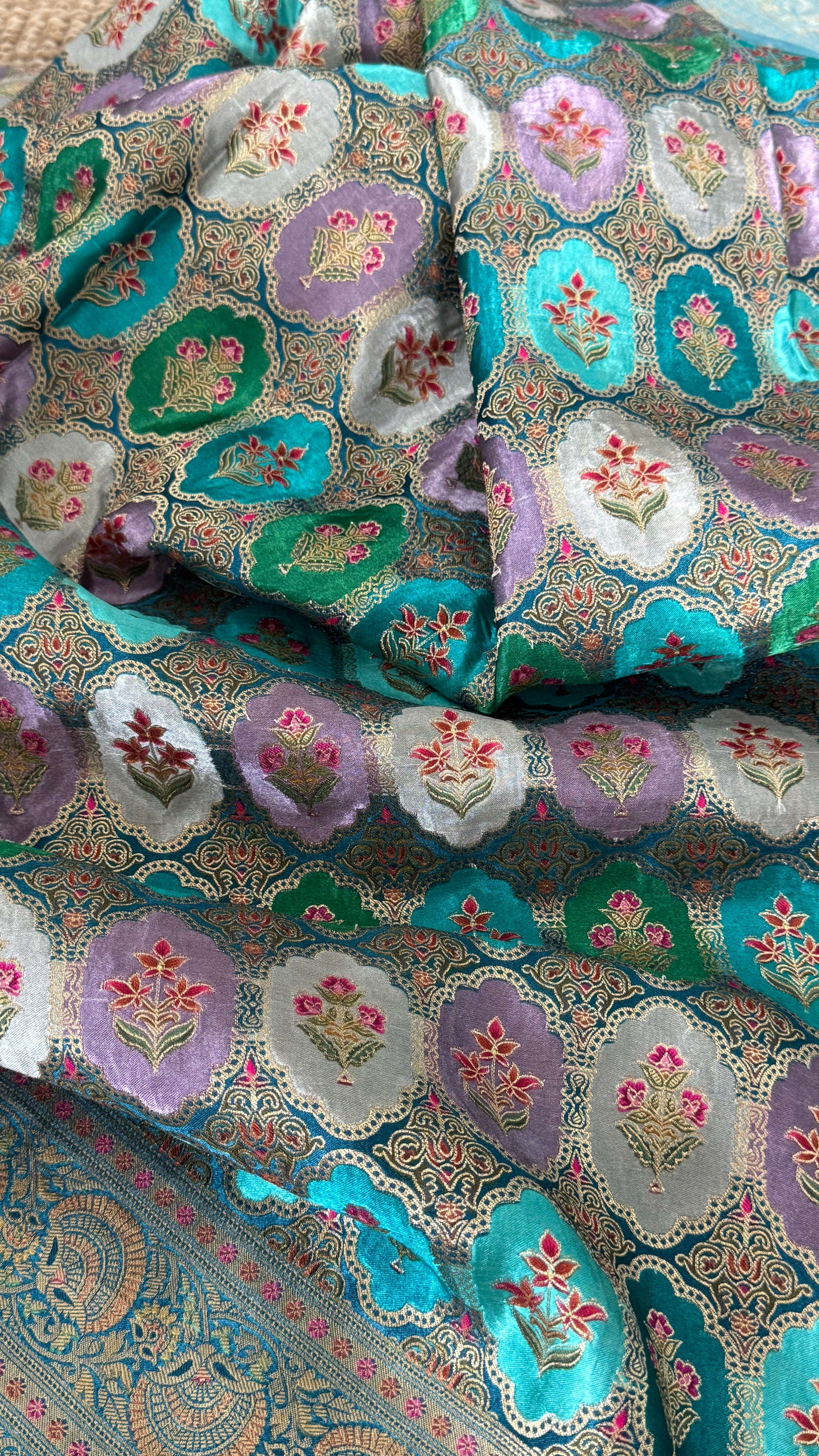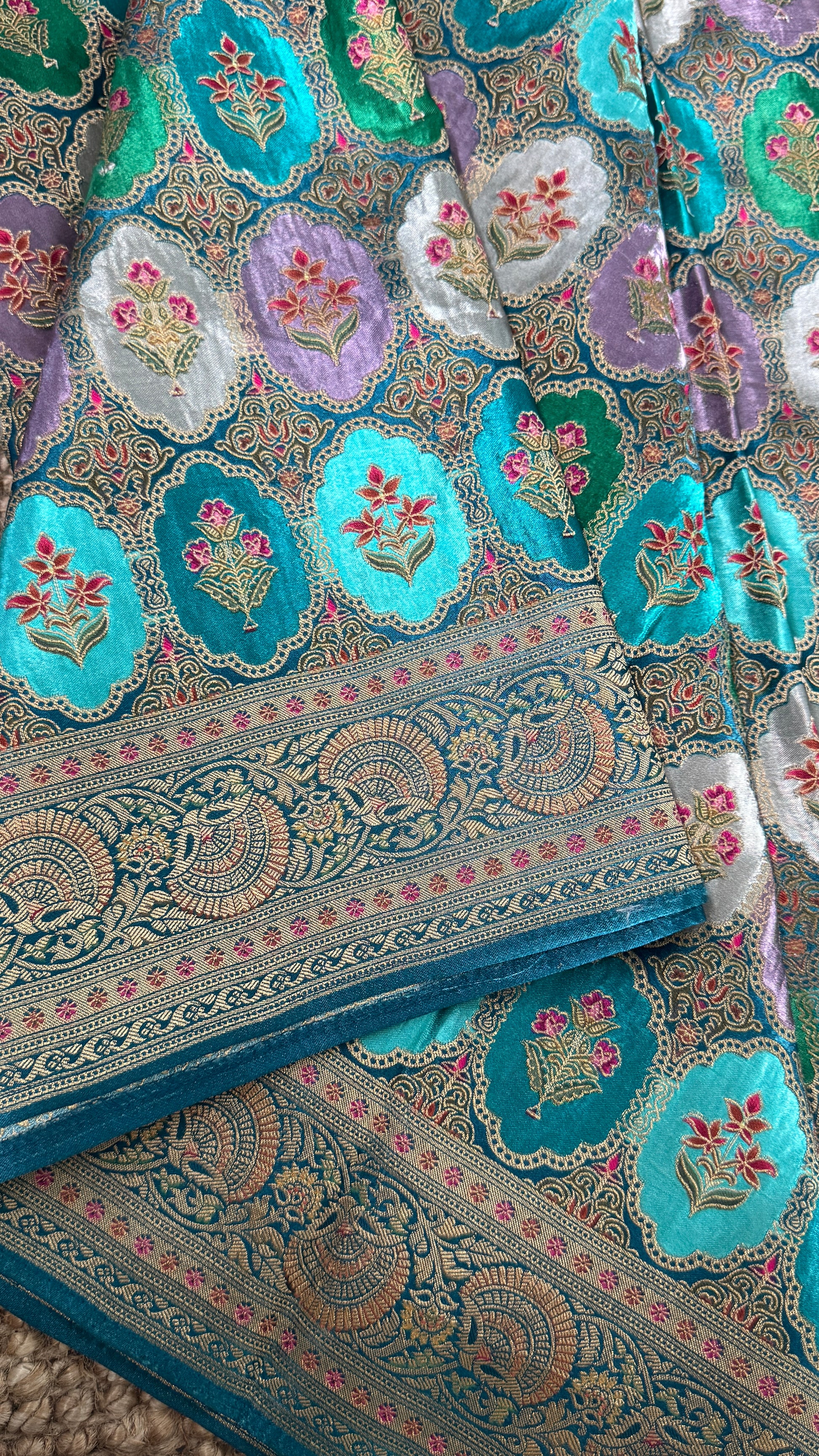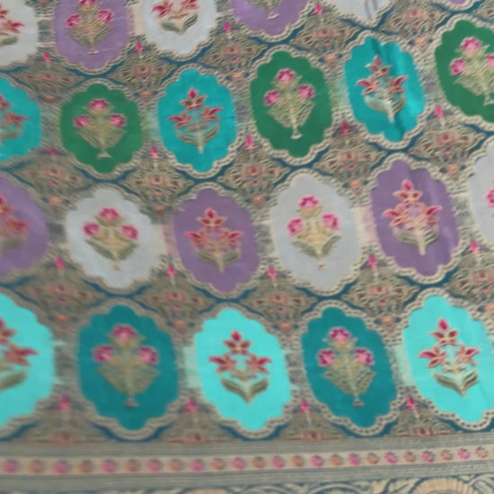 This saree is a pure satin Banaras silk saree in a stunning Teal and Lavender combination.