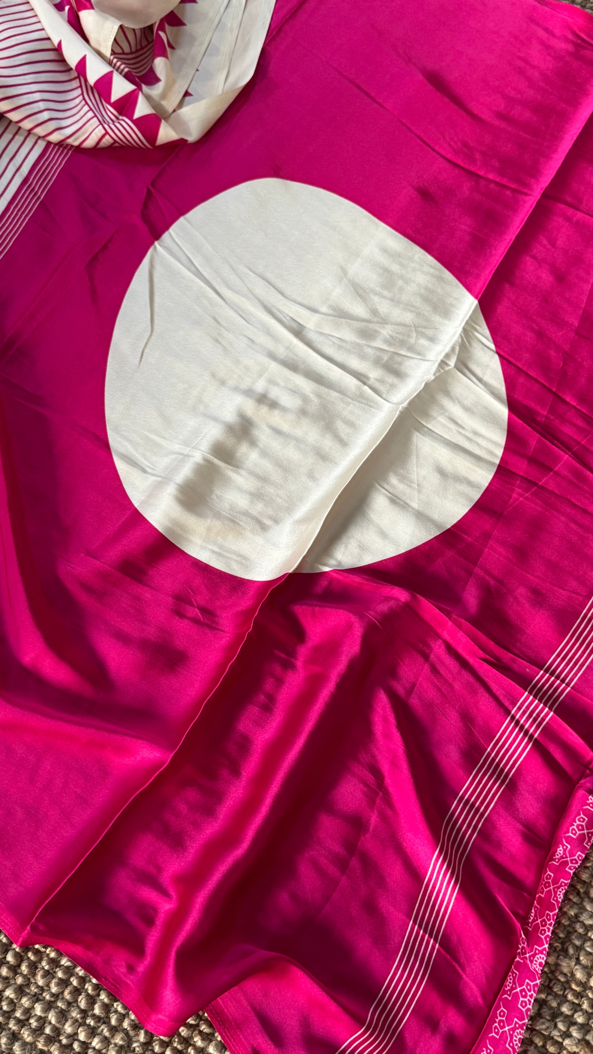 White and Hotpink Modal Satin Saree with Temple Printed Border & Circle Design Pallu