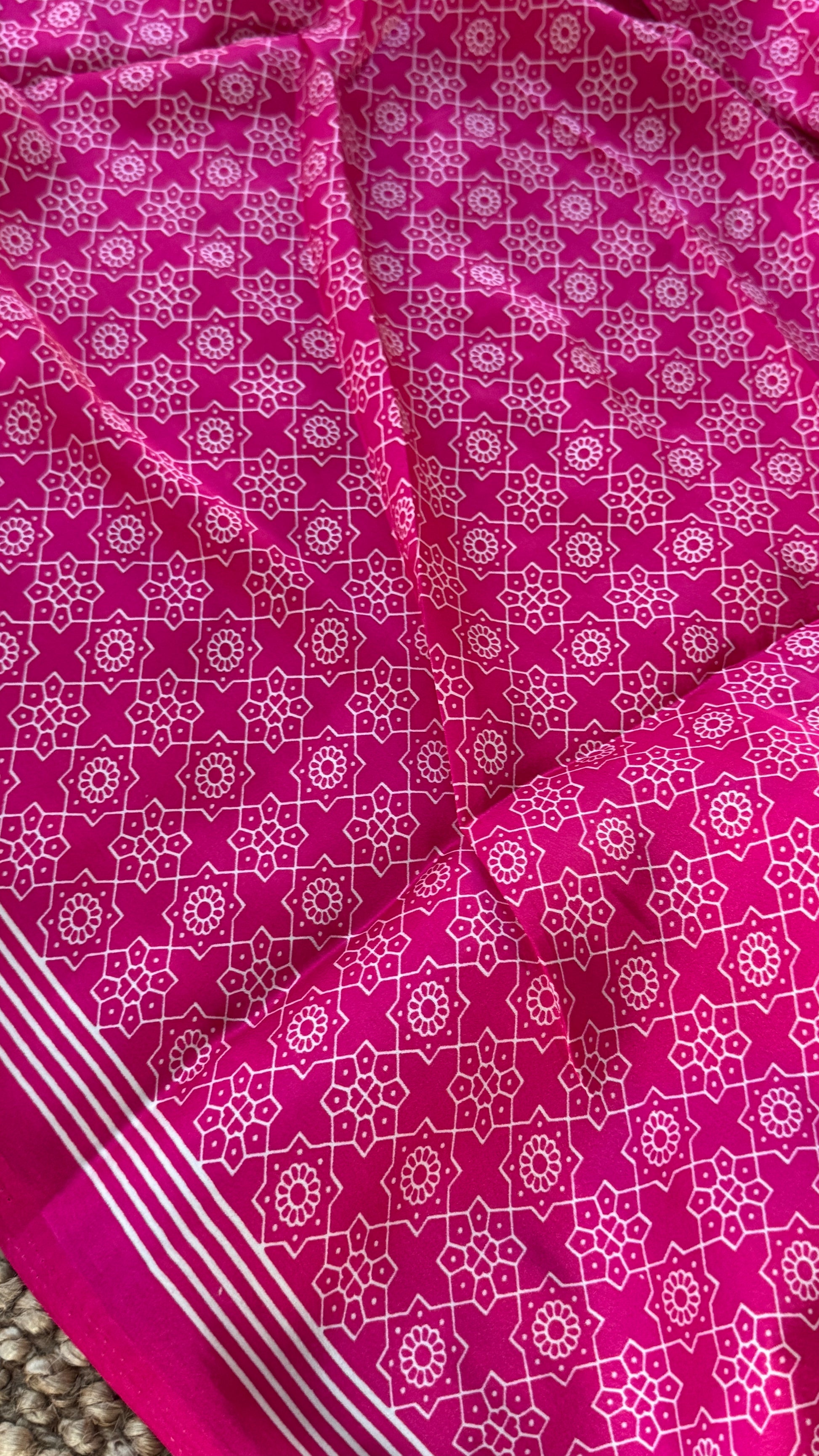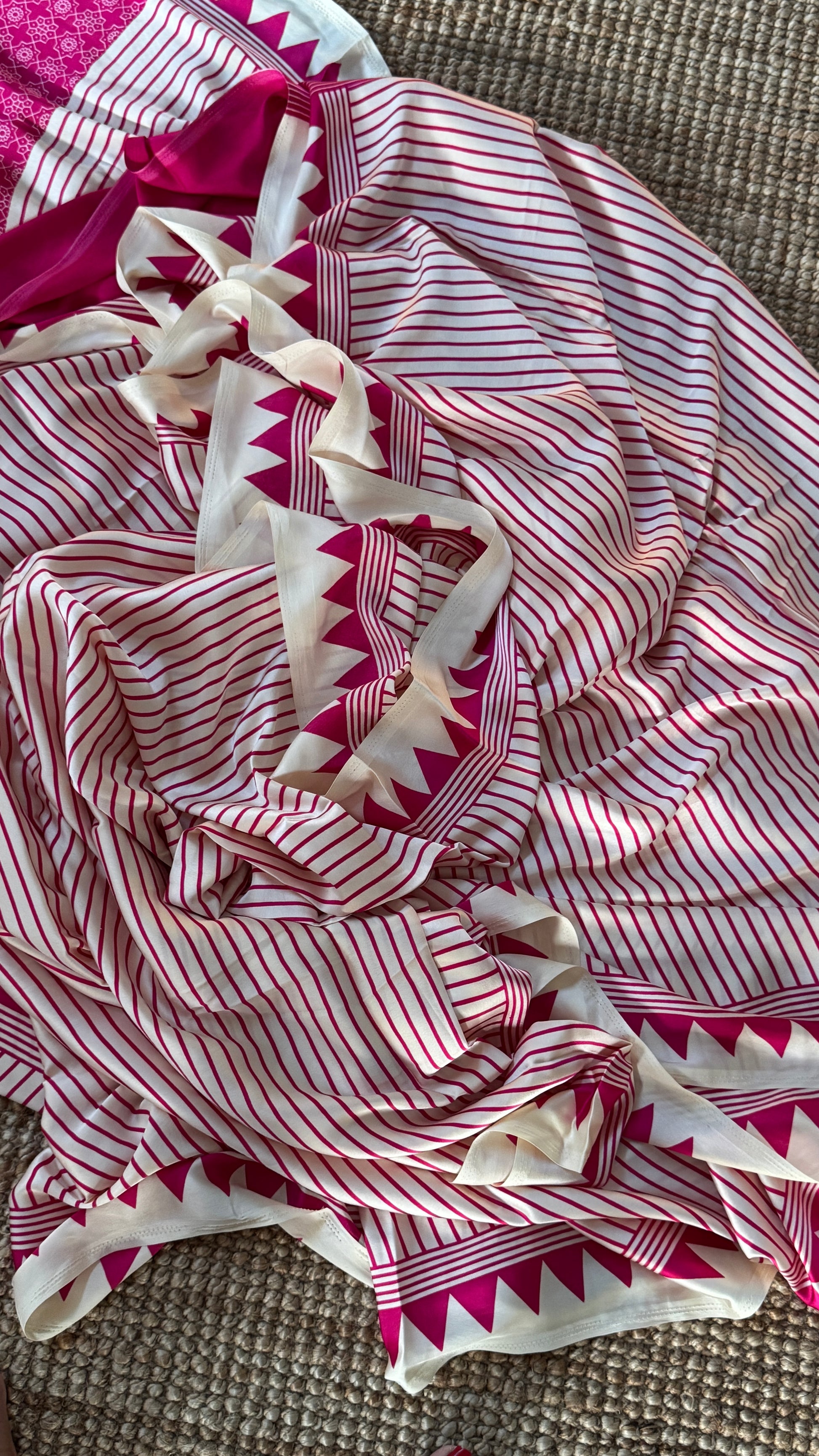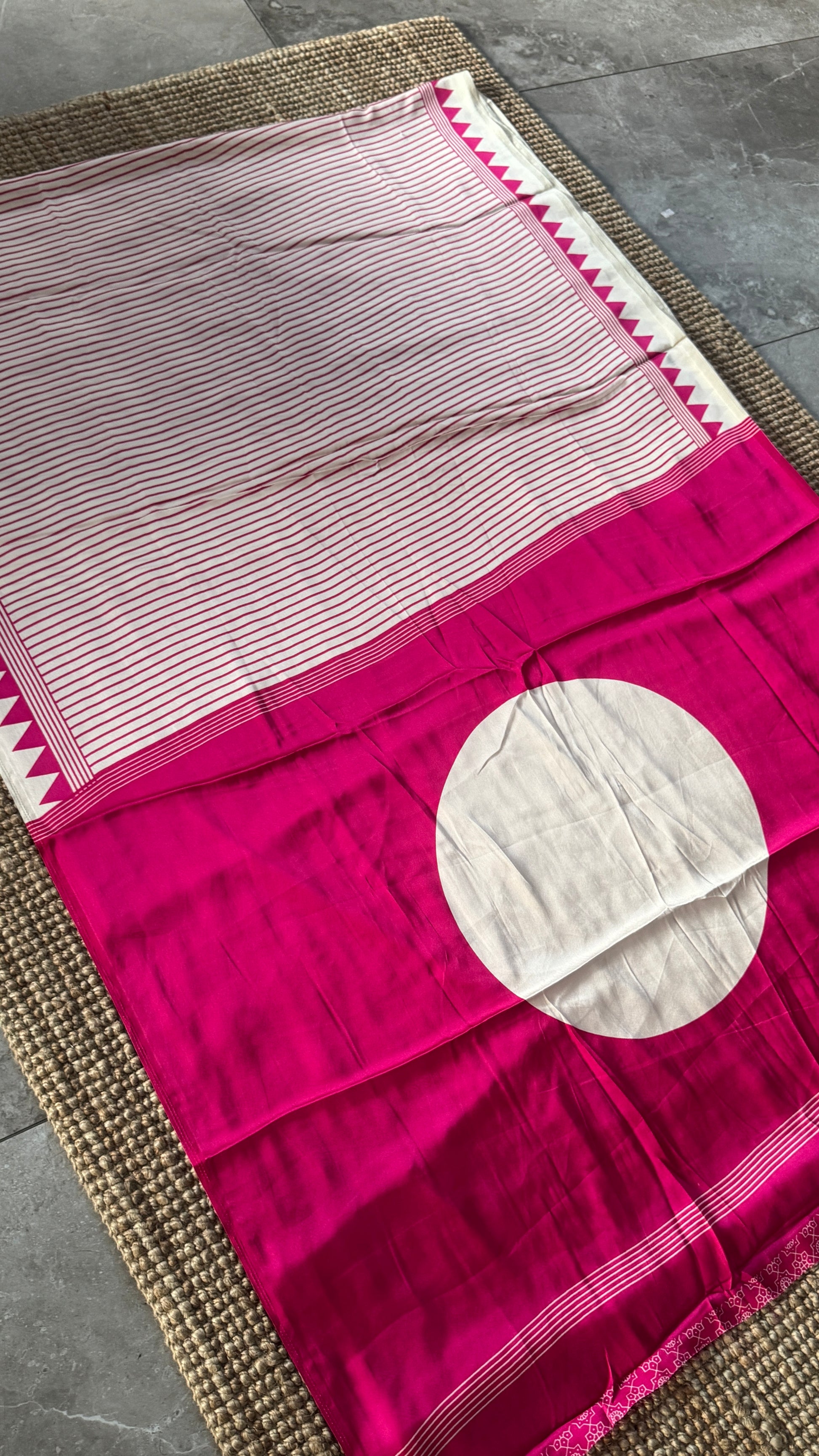 An elegant White and Hot Pink modal satin saree featuring subtle vertical lining designs throughout the body. The saree is accentuated with a beautiful temple-style printed border and a striking big circle design pallu, creating a perfect balance of tradition and modern artistry.