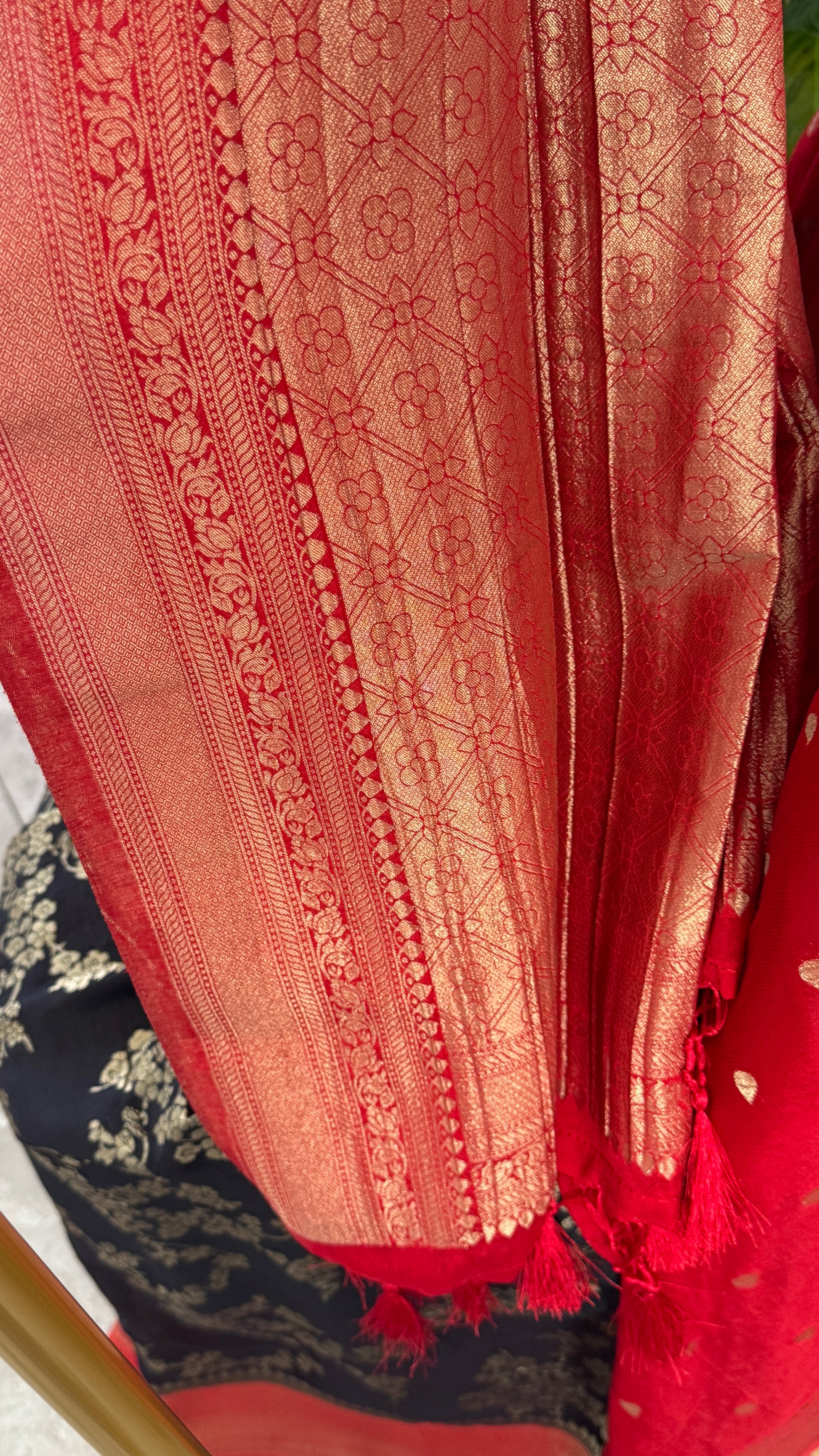 Georgette Silk Crushed Banarasi Saree – Black with Red Border