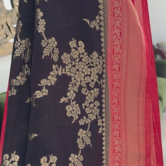 The Pure Georgette Silk Banarasi Saree in Black with Red Border from Kanchi Australia is a refined blend of traditional craftsmanship and contemporary elegance