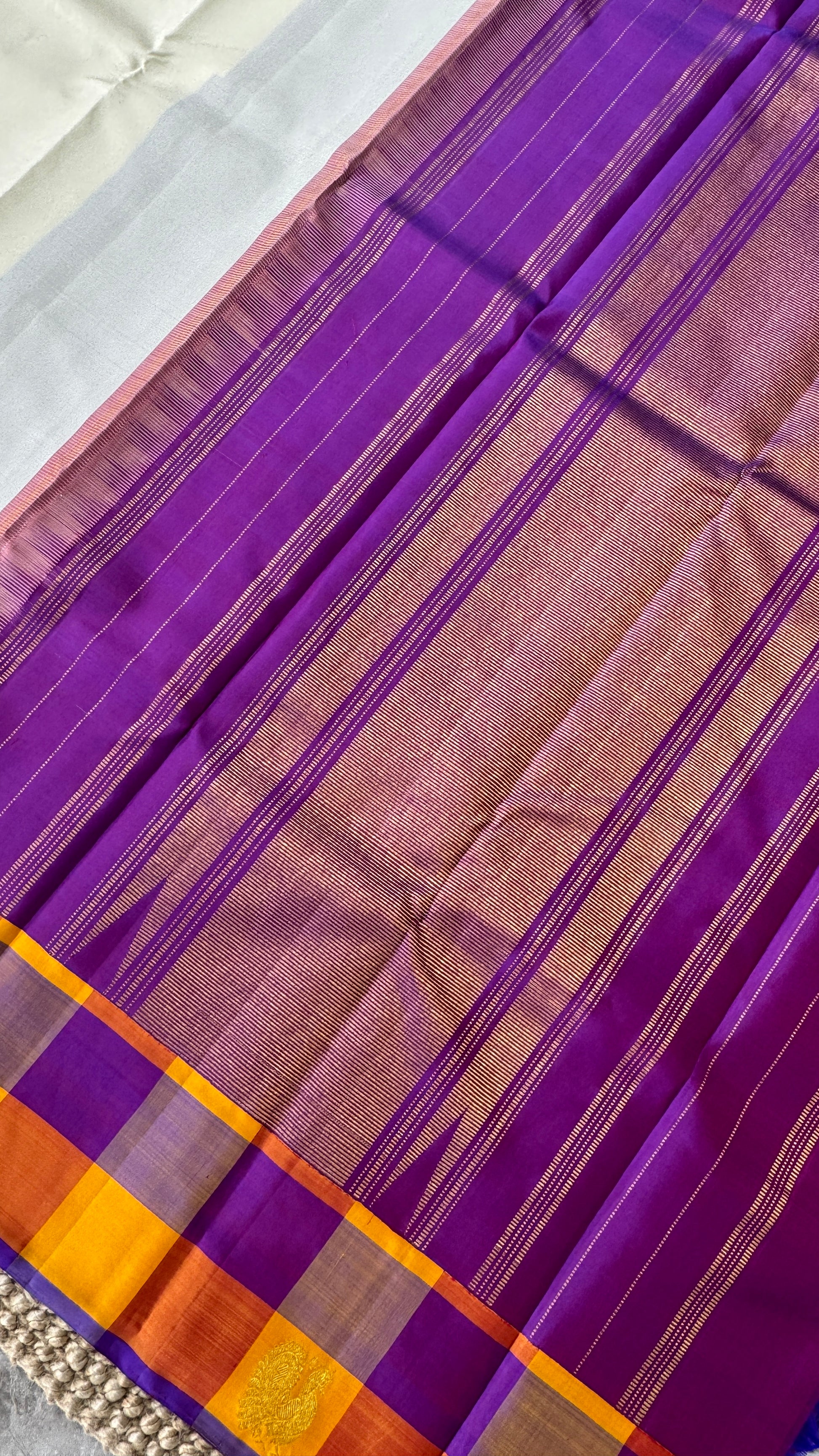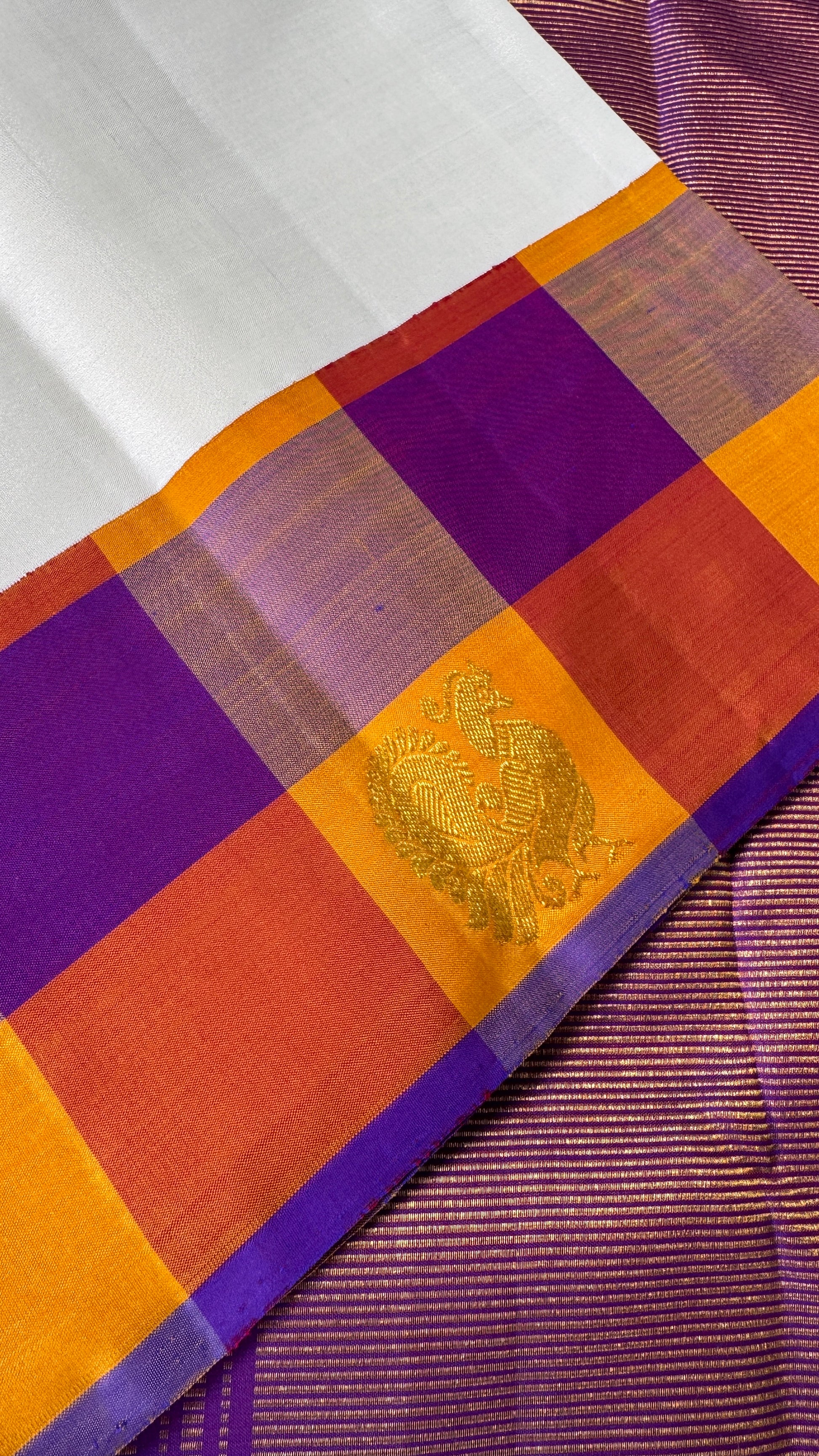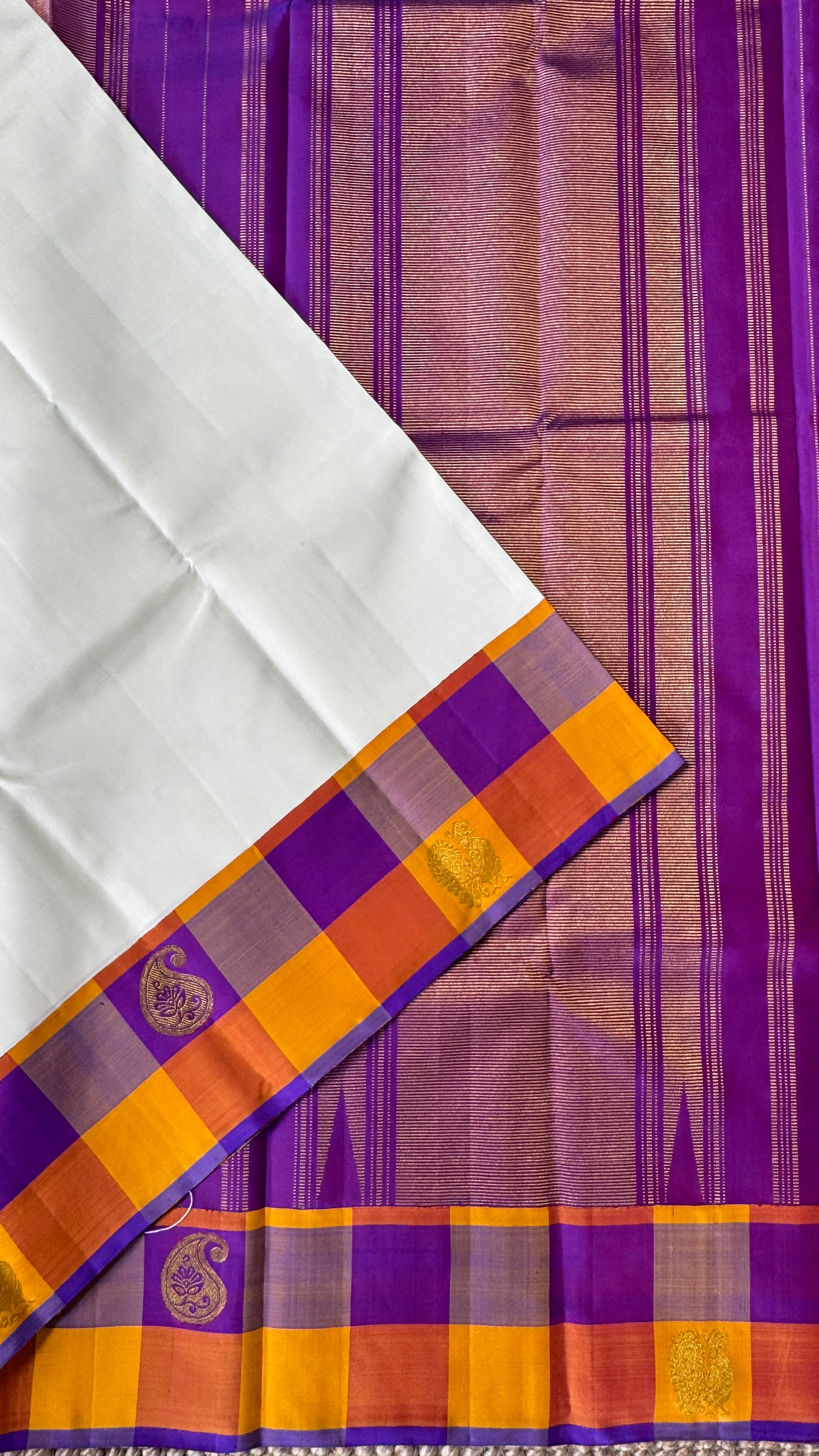The saree features a graceful half-white body, symbolizing purity and sophistication, beautifully contrasted with a vibrant multicolor border and a rich purple pallu. The border is intricately woven with alternating mango and peacock motifs, symbolizing prosperity and beauty—two iconic elements of Kanjivaram artistry.