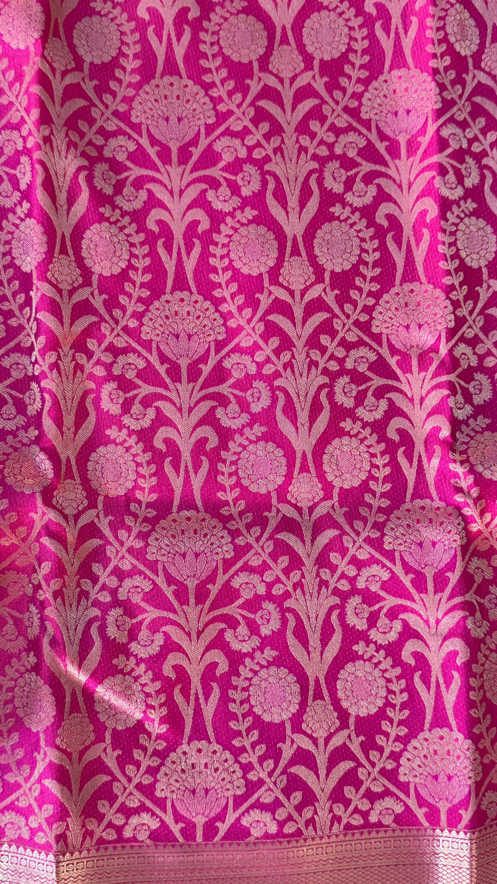 The saree features a mesmerizing pink hue, beautifully complemented by opulent gold zari brocade intricately woven throughout the body. The floral jaal pattern, rendered in gleaming zari, adds depth and richness, creating an enchanting texture that glows under any light. Every inch of this drape speaks of regal splendor, making it an heirloom-worthy piece for the discerning connoisseur.