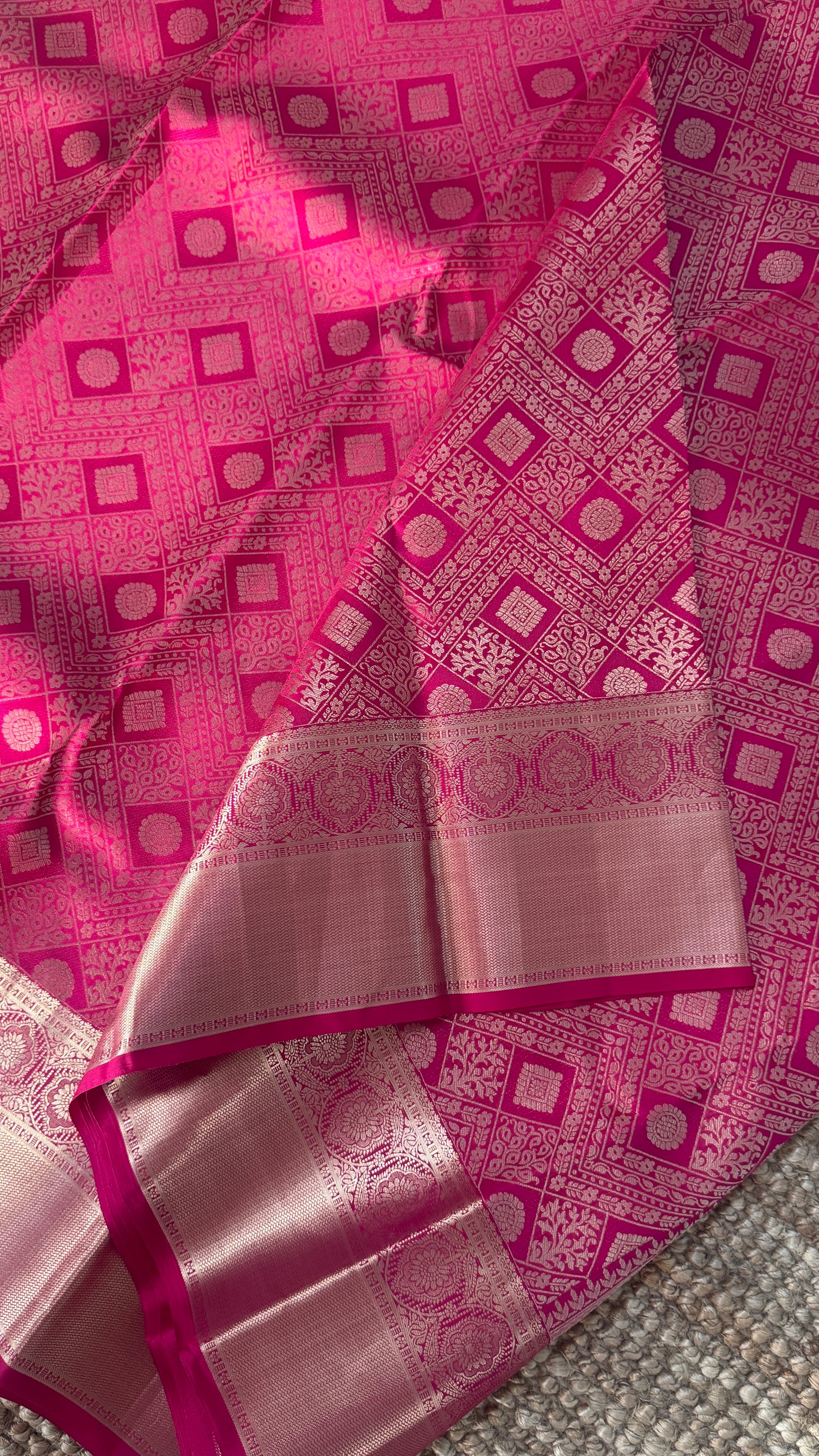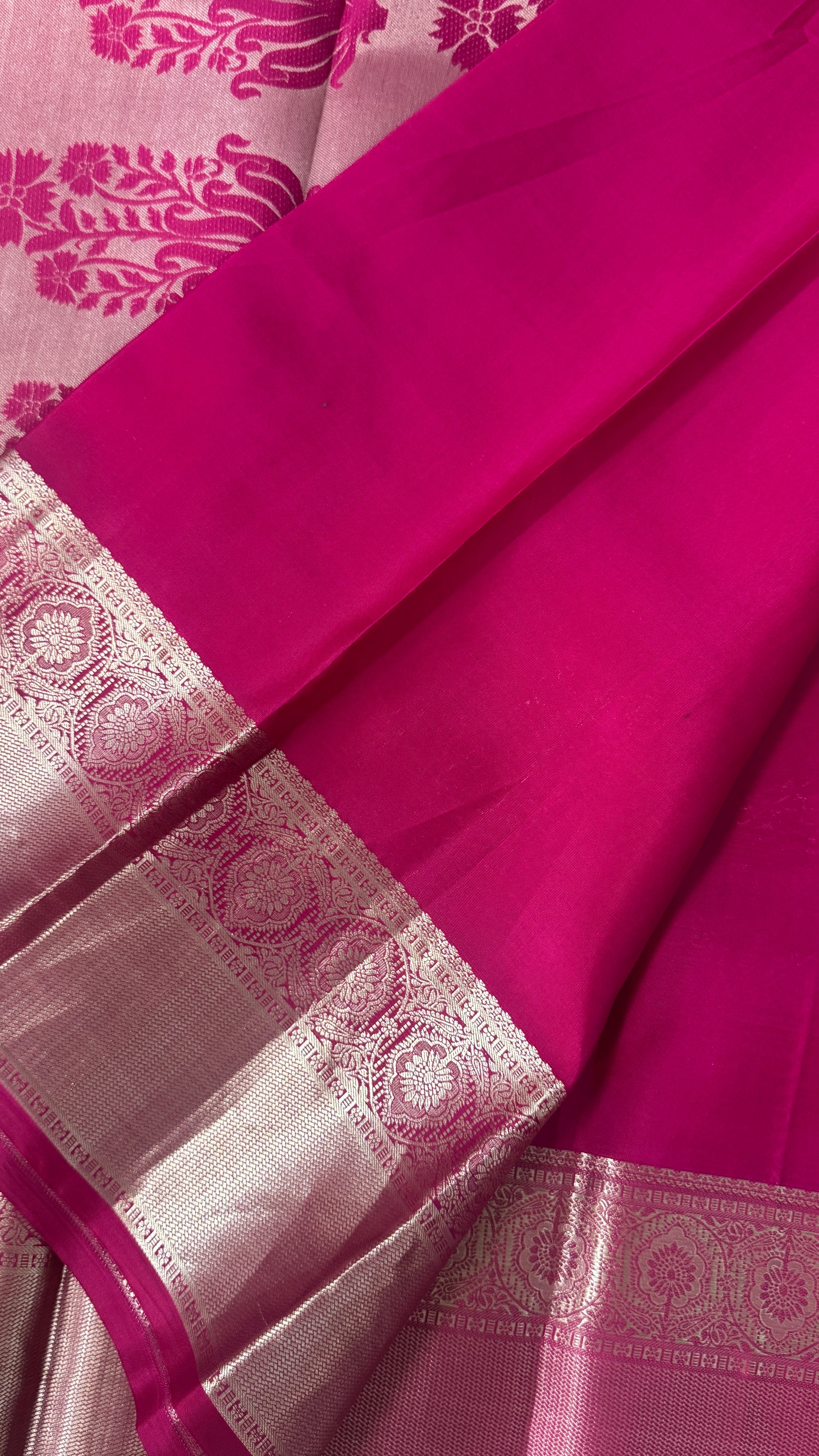 The border and pallu of the saree are adorned with detailed zari motifs—delicate floral vines and ornamental patterns that enhance its grandeur. The shimmering gold zari border, highlighted with a Pink undertone, perfectly frames the saree, lending it an aura of refinement and tradition. The pallu, luxuriously woven in gold, adds a touch of magnificence that completes the ensemble.