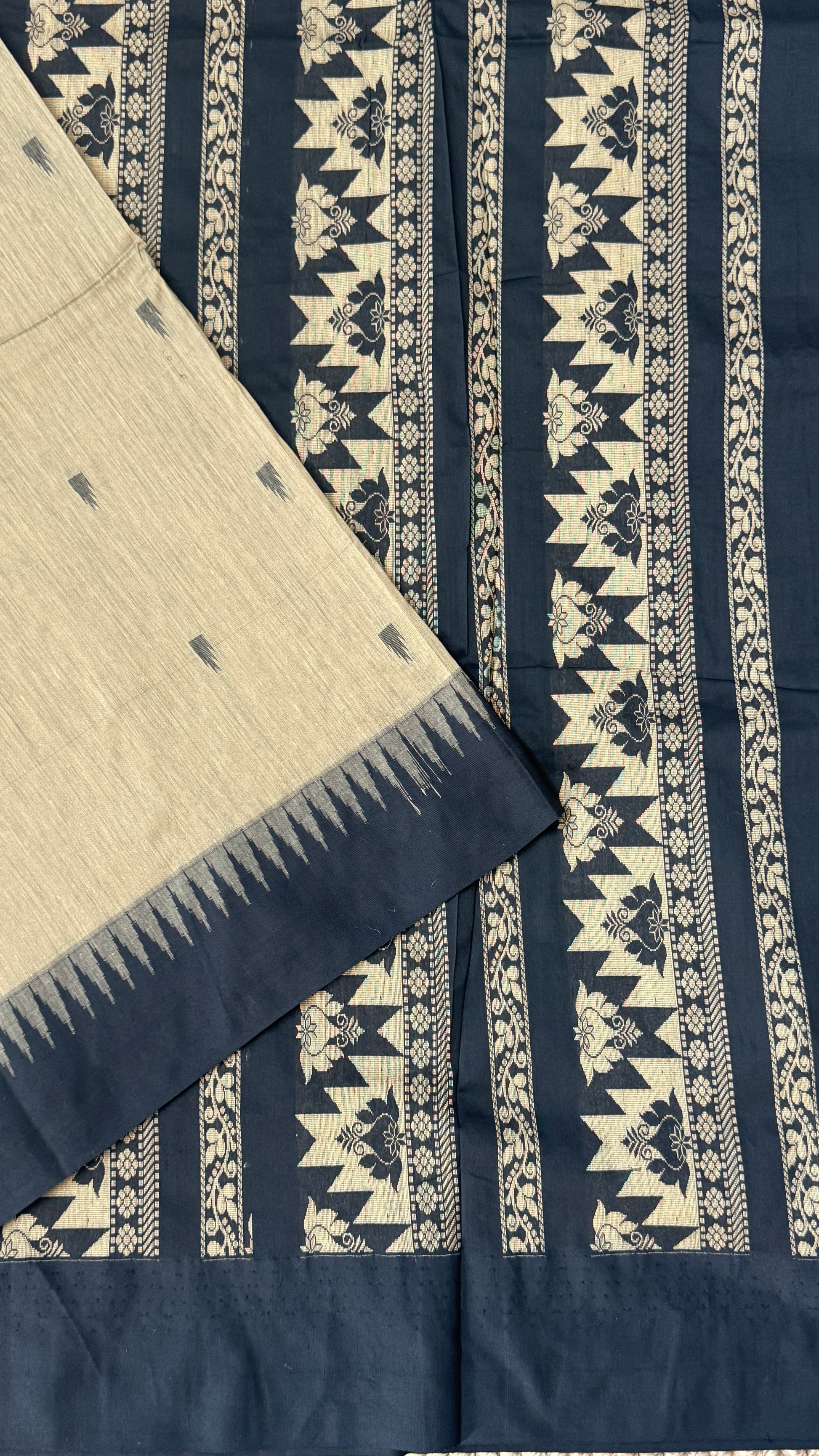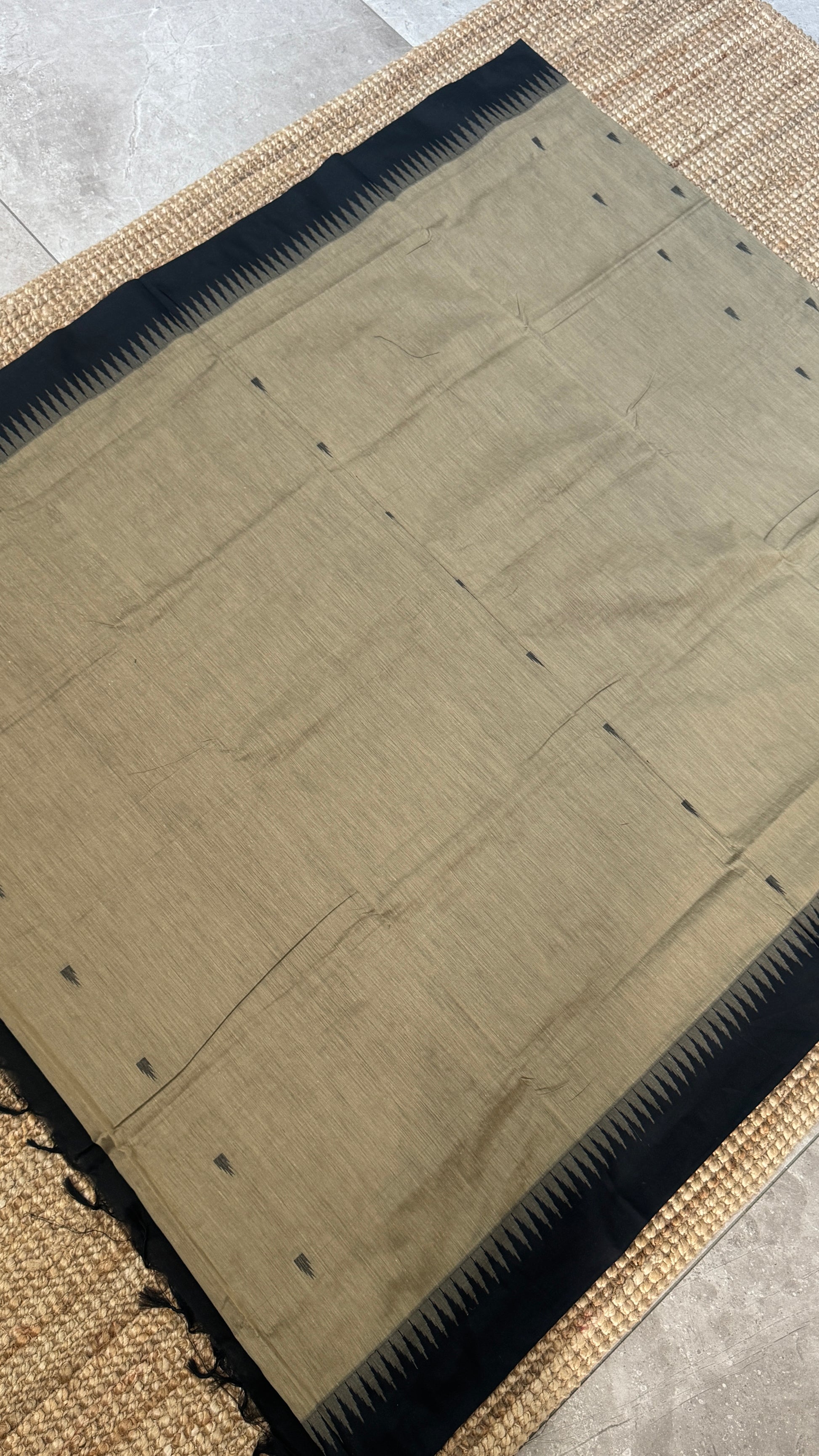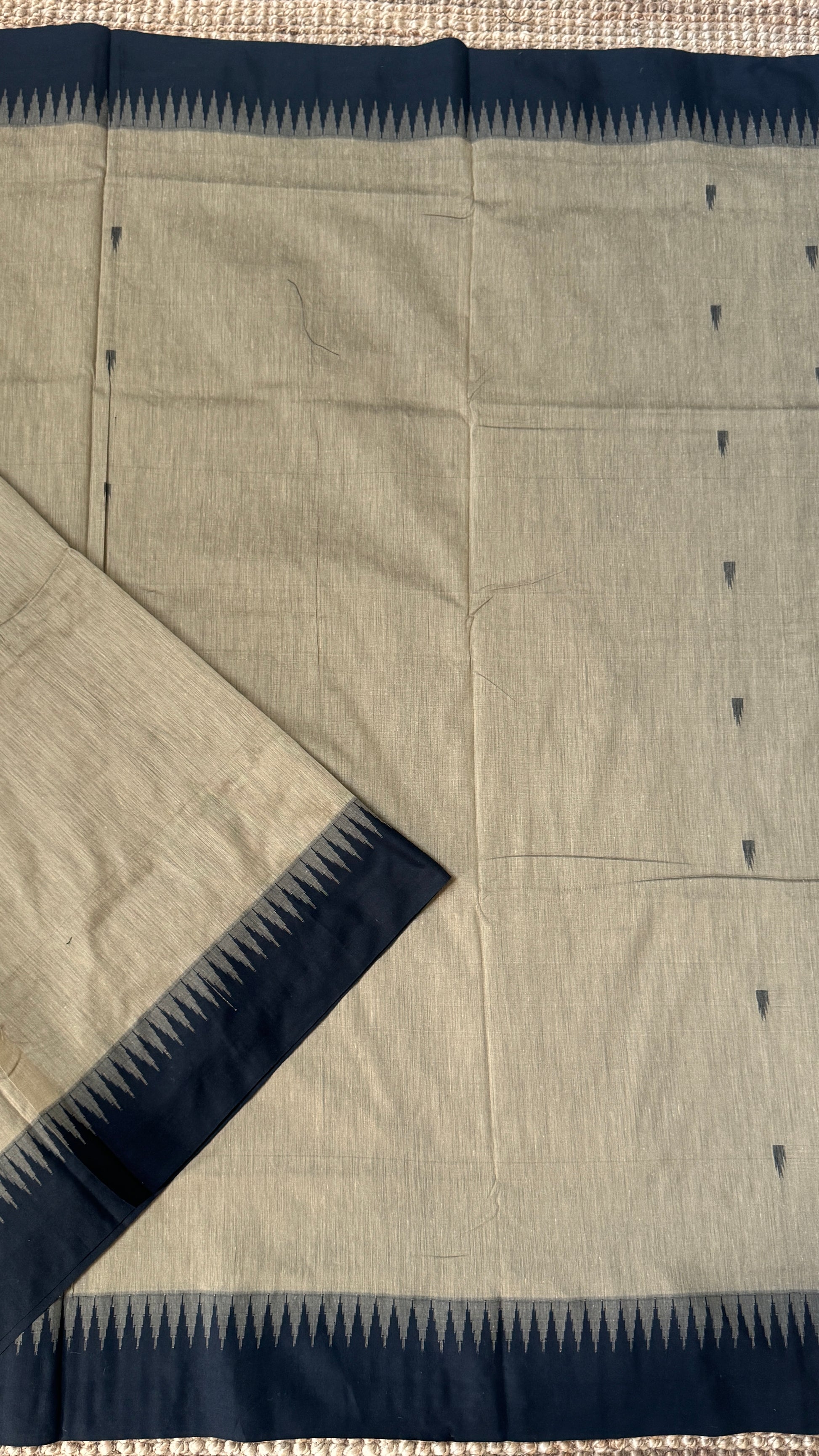 The saree comes with a stunning contrast pallu, intricately hand-woven with black thread on the Grey base. The pallu carries traditional motifs, giving it a rich and festive look while maintaining the lightweight feel of cotton silk.