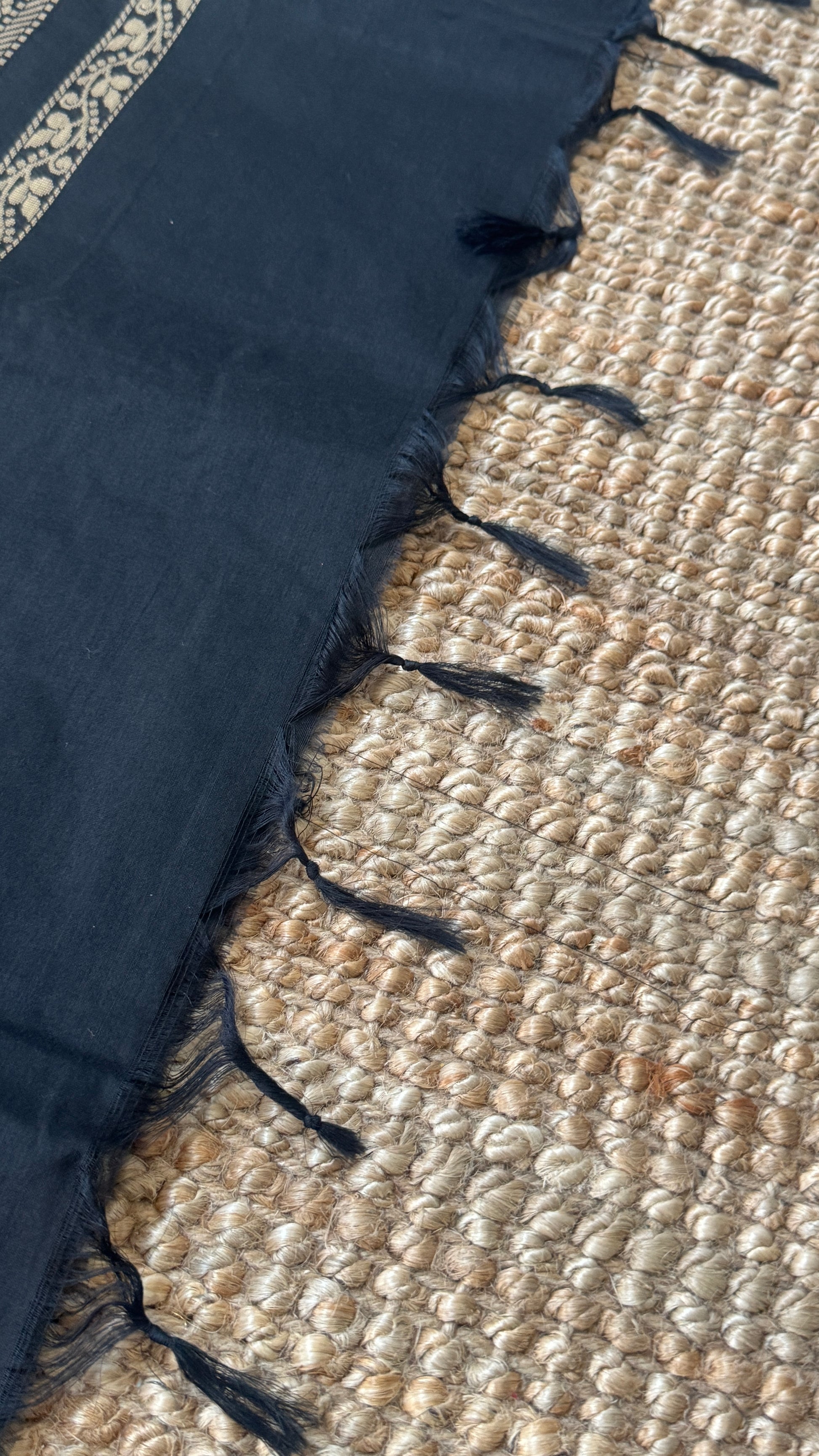 Paired with a matching black contrast blouse, perfectly complementing the border and pallu.