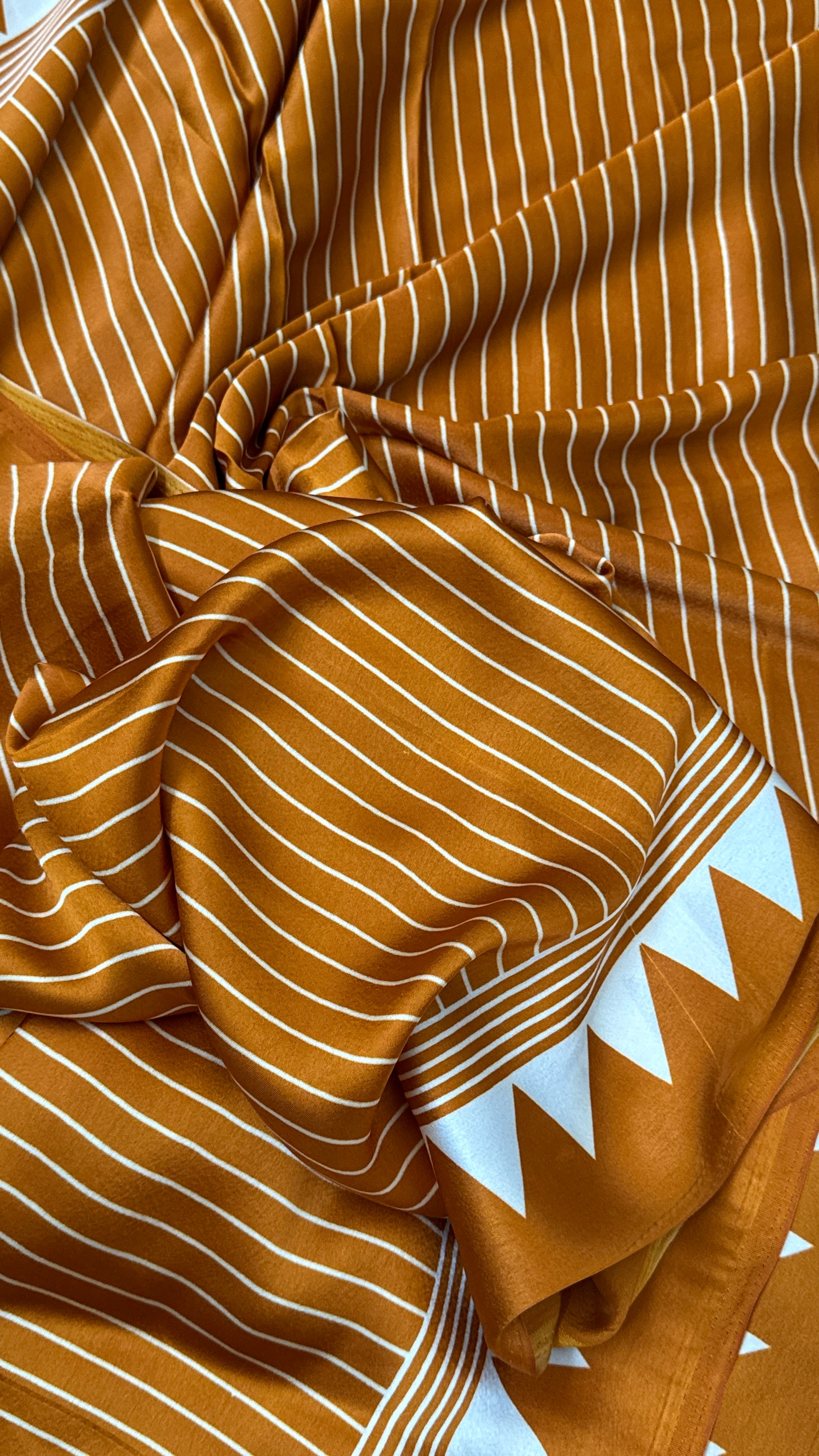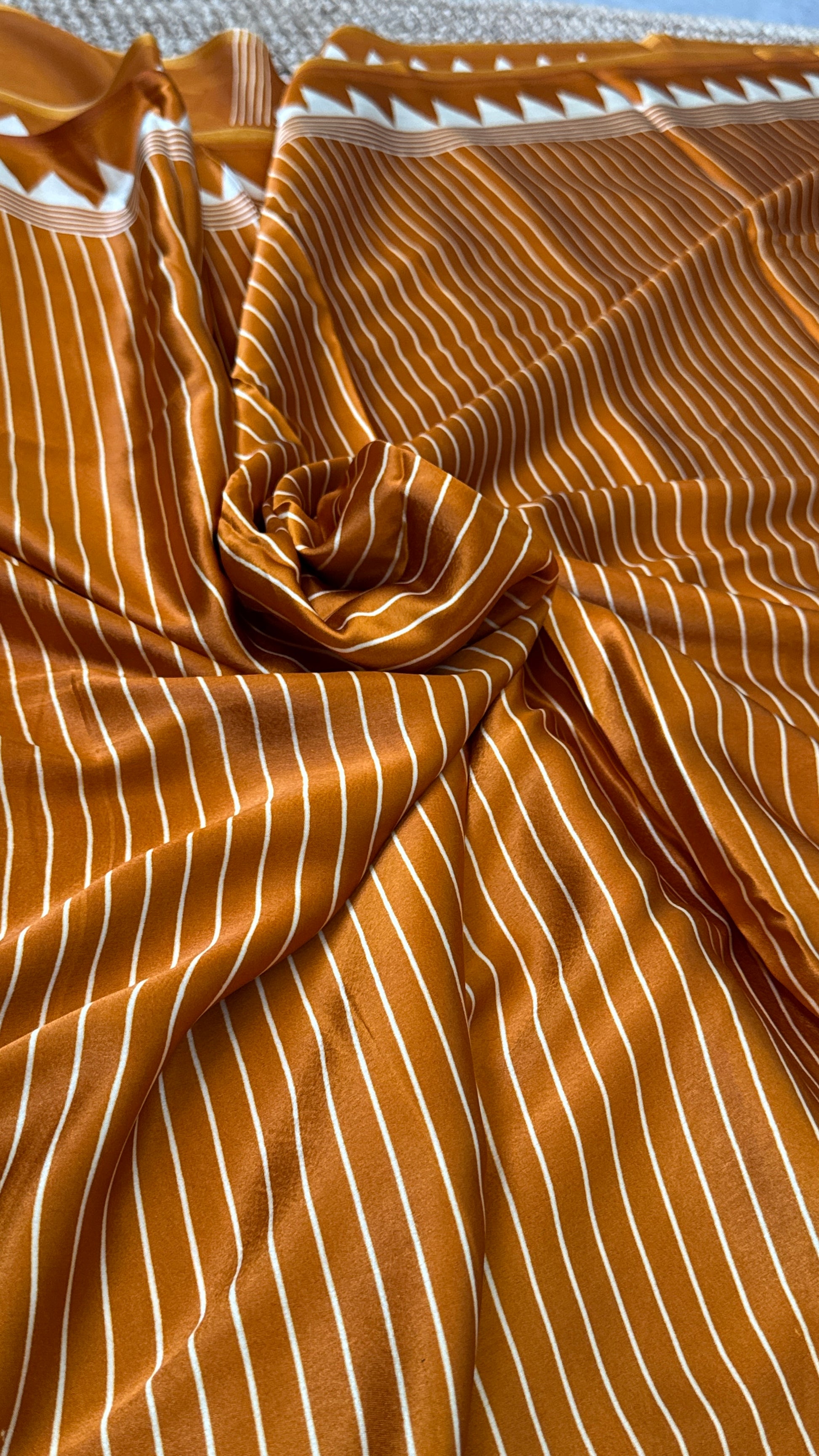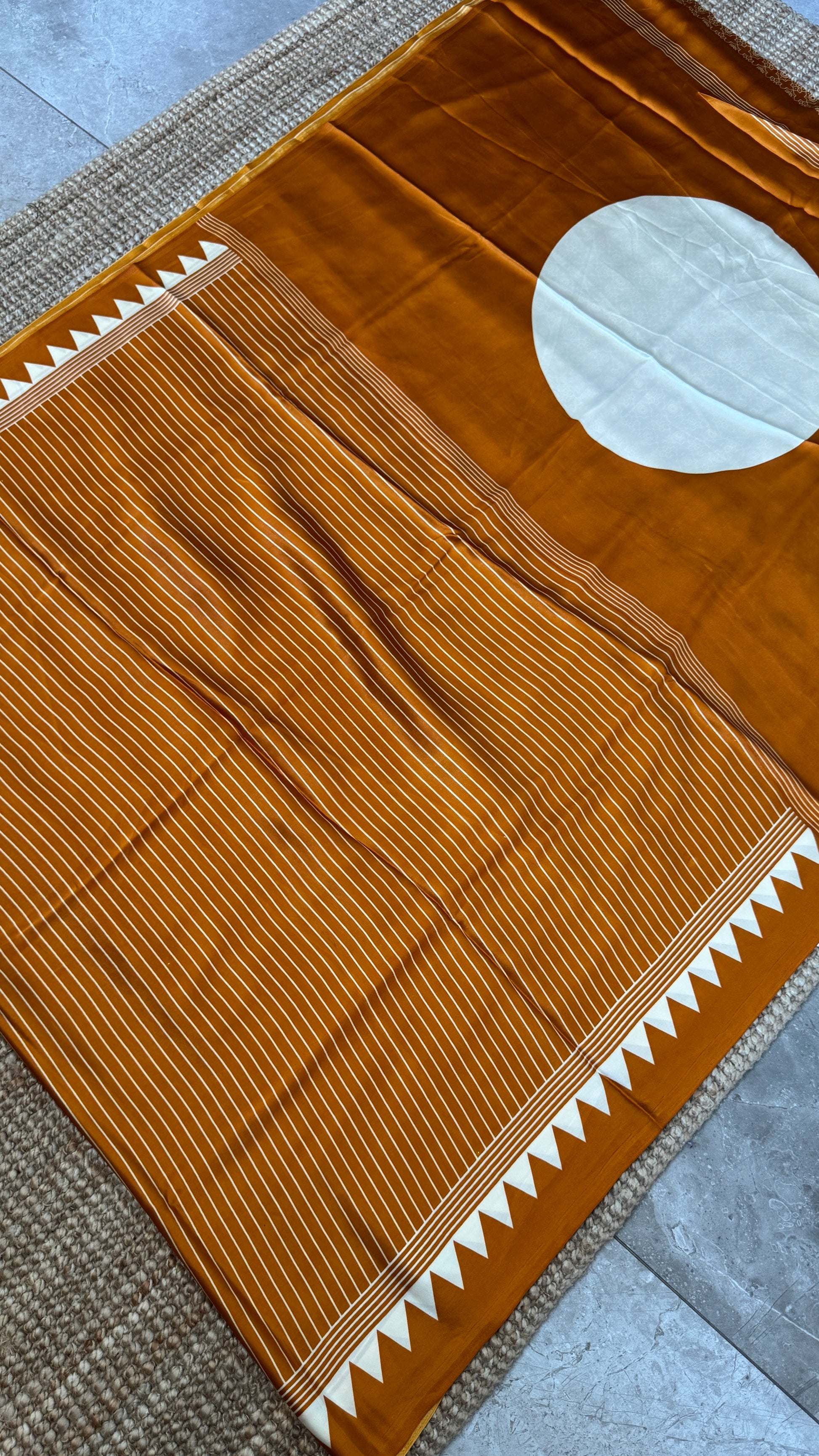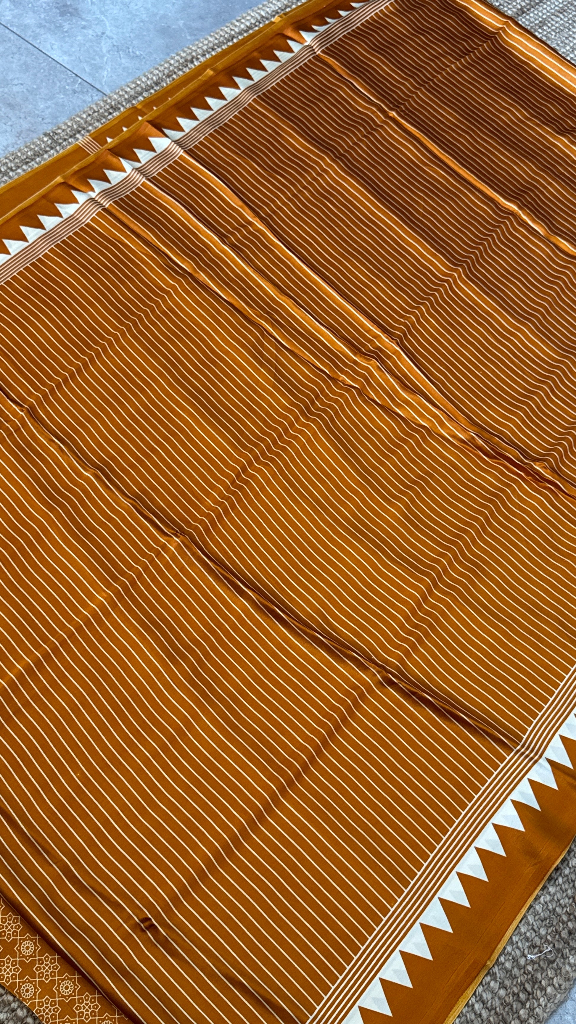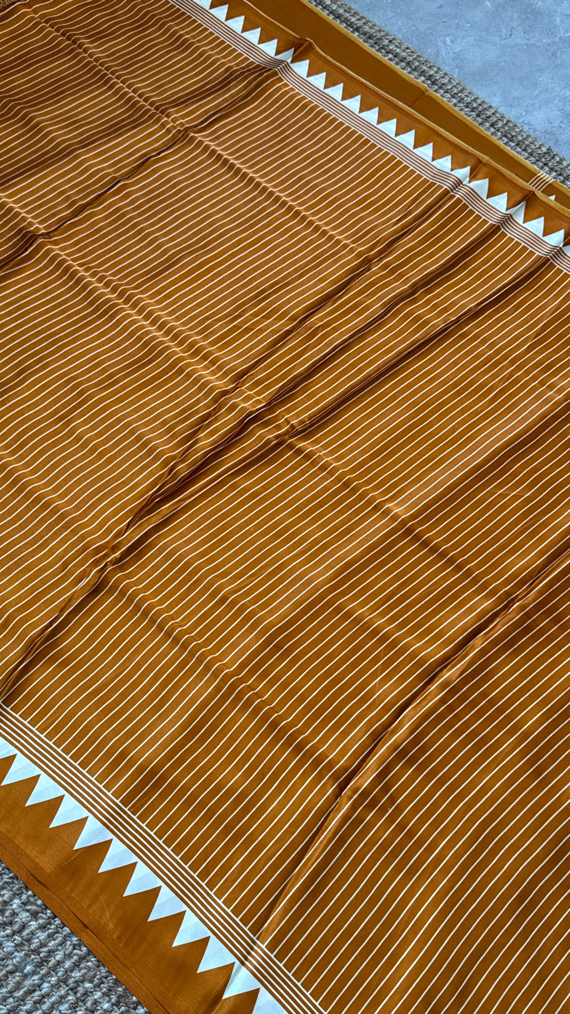 An elegant Mustard modal satin saree featuring subtle vertical lining designs throughout the body. The saree is accentuated with a beautiful temple-style printed border and a striking big circle design pallu, creating a perfect balance of tradition and modern artistry.