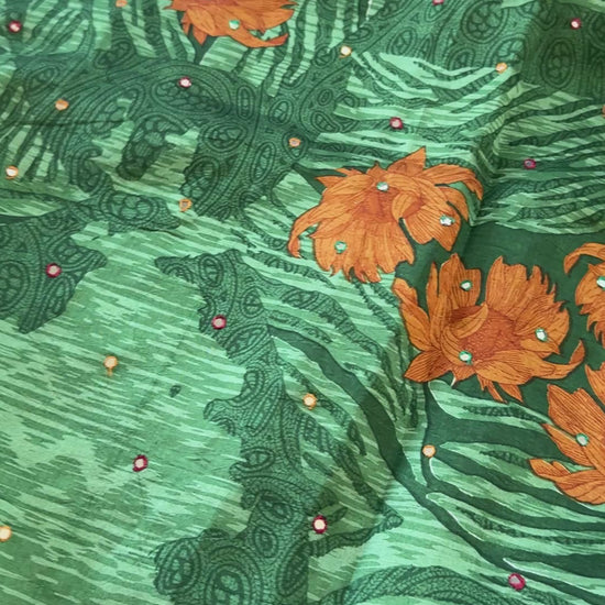 The green body is highlighted by a Orange Foral prints adorned with intricate mirror work, adding a touch of artisanal charm to every fold.