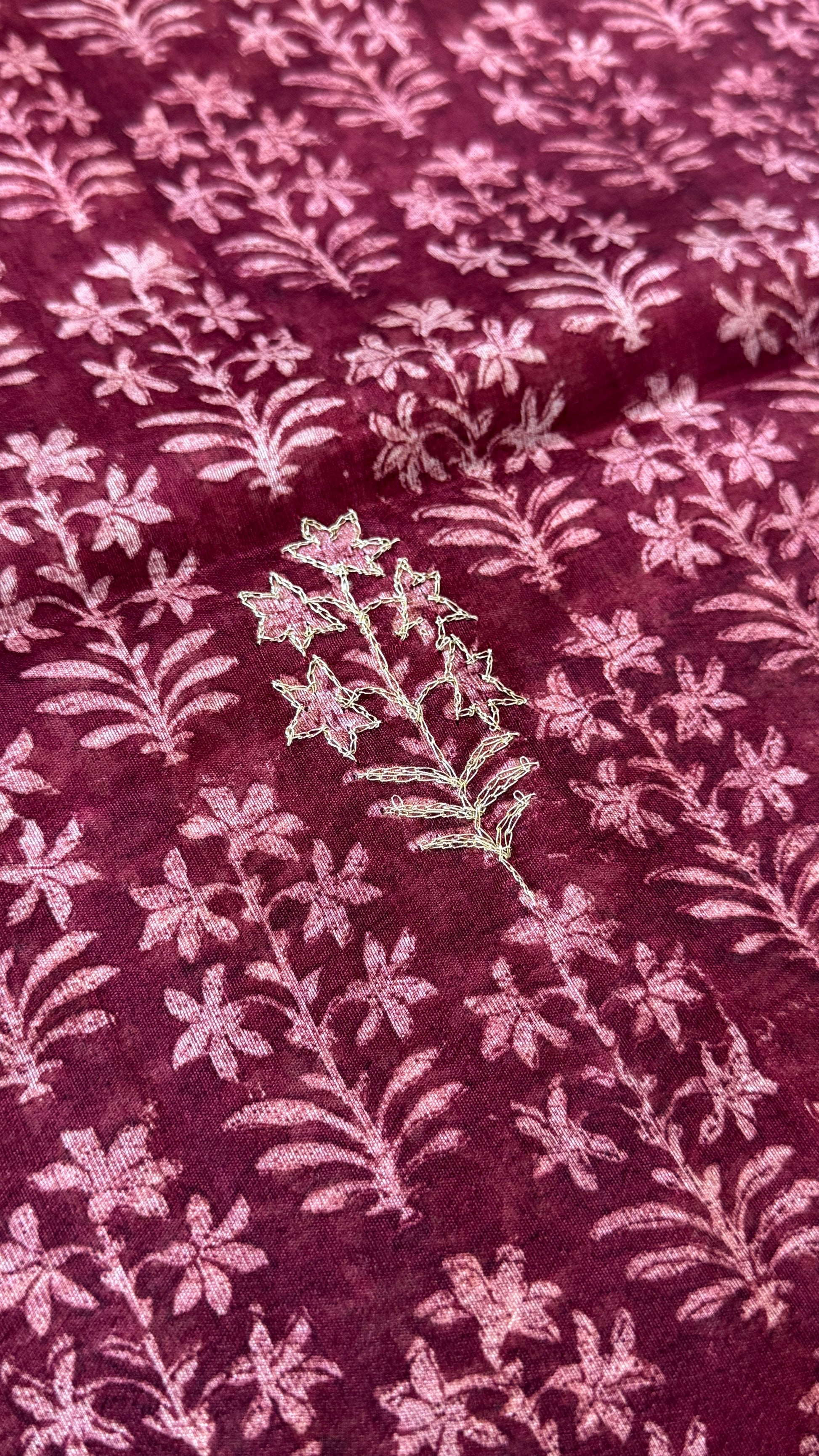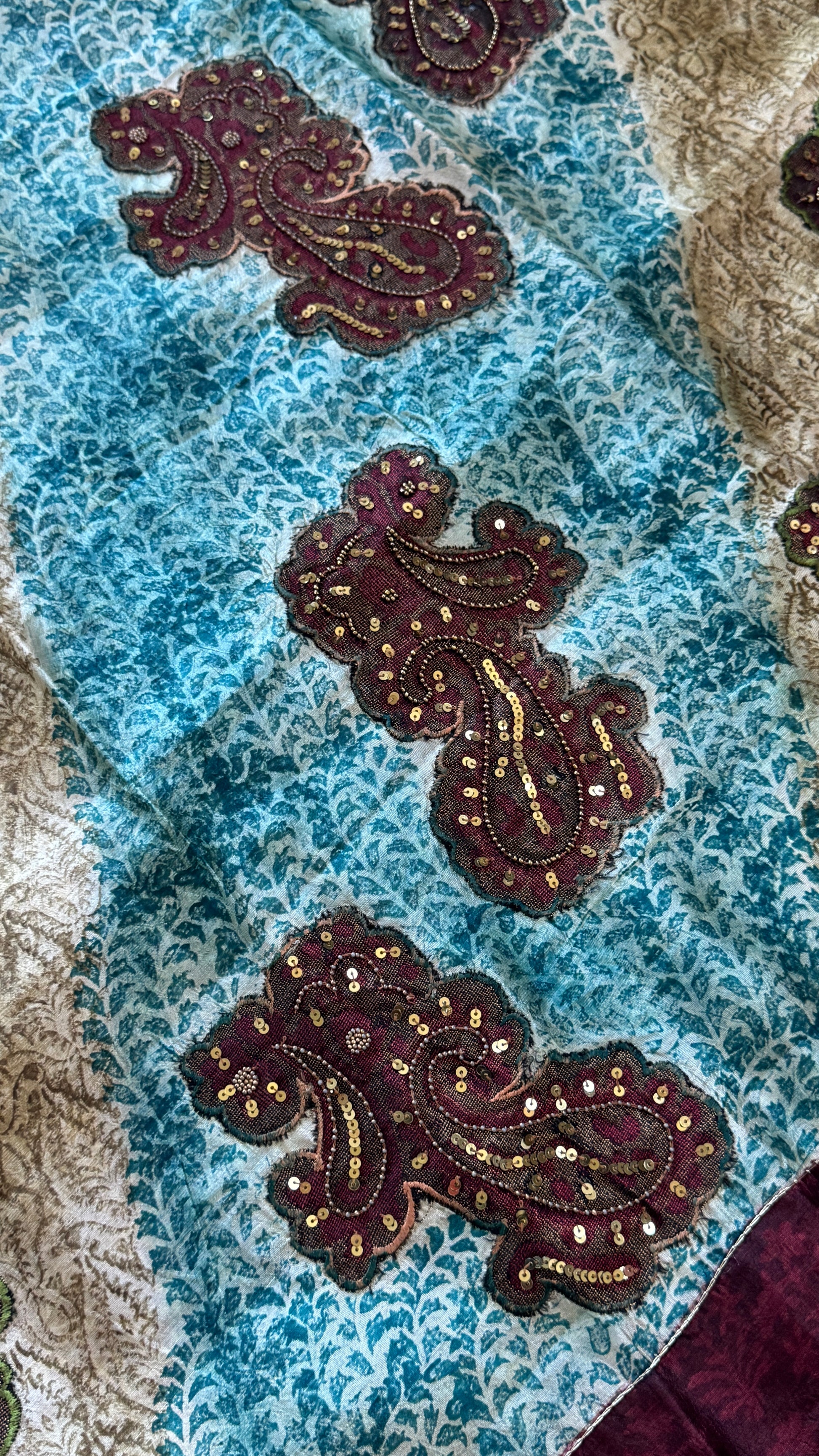The body of the saree showcases a rich maroon Ajrakh print, while the pleats and pallu transition gracefully into contrasting brown and blue Ajrakh patterns, making the drape visually striking and full of character. The pallu is further enriched with beautifully handmade twin mango motifs, adding a touch of timeless charm and intricate craftsmanship.