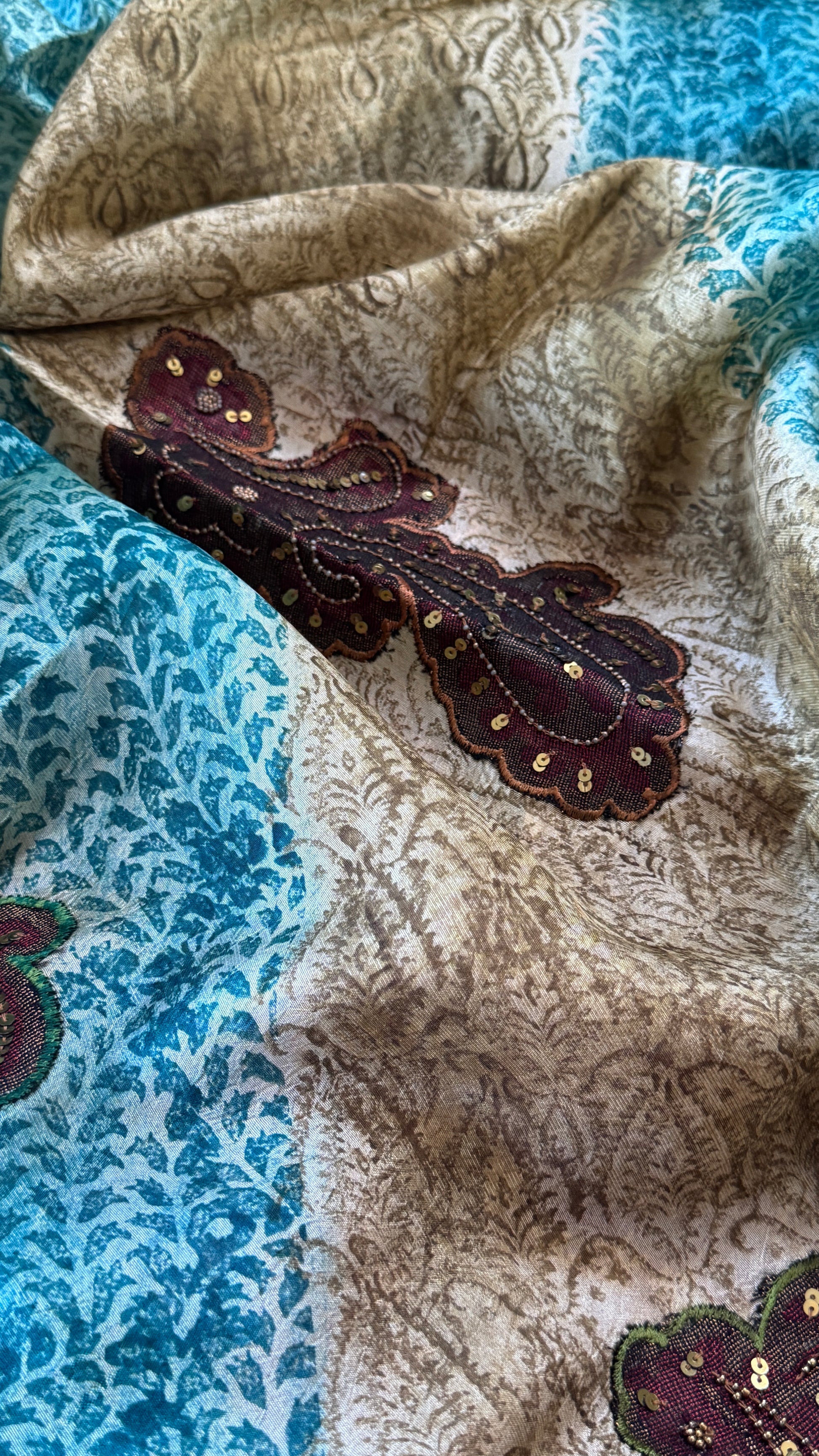 The green base complements the earthy tones perfectly, creating a harmonious balance of colour and design. Paired with a matching handwork blouse, this saree is both regal and distinctive.
