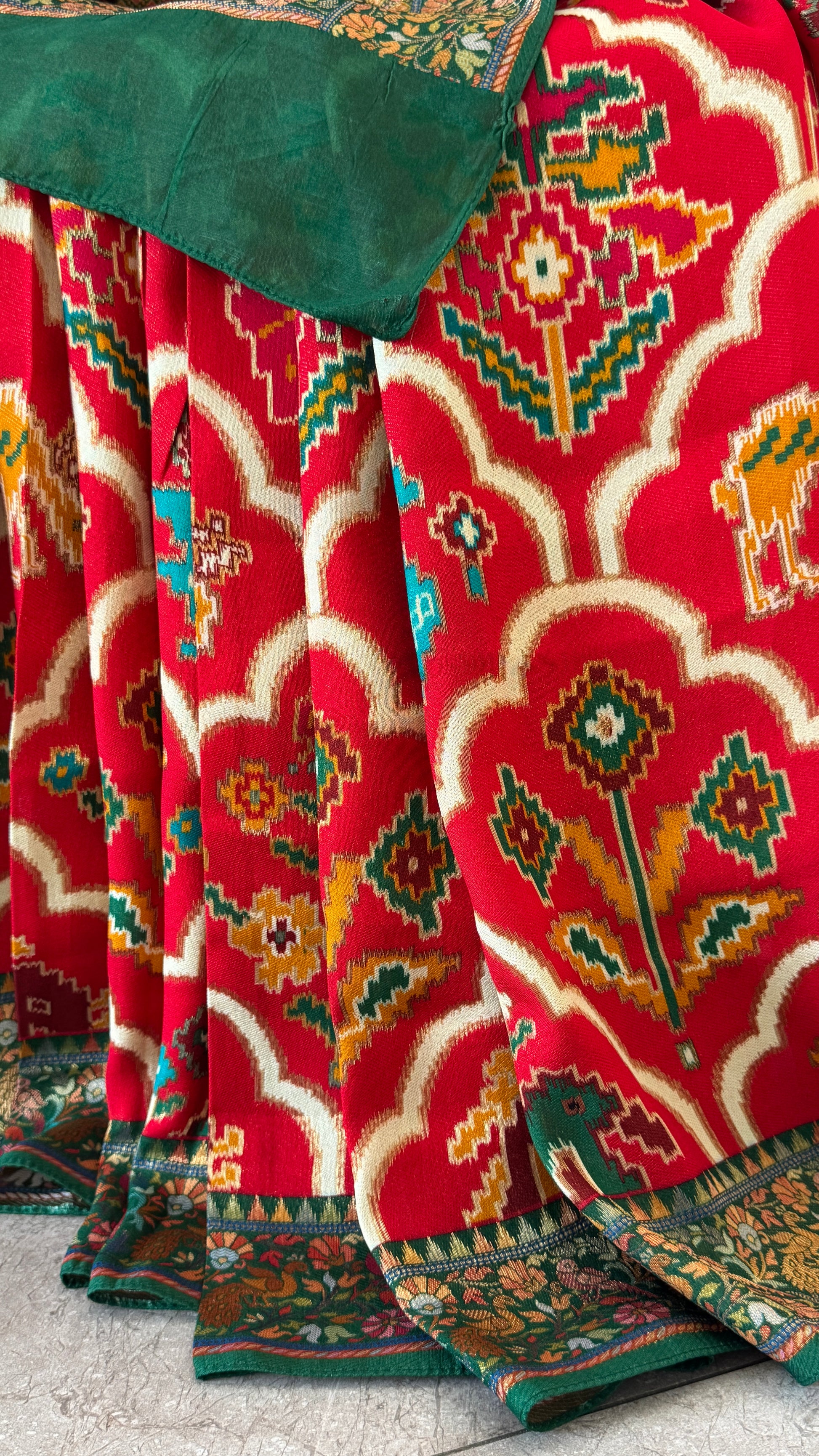 A Kashmiri Pashmina Banarasi Handwoven Sarees with Patola prints - Red with Green
