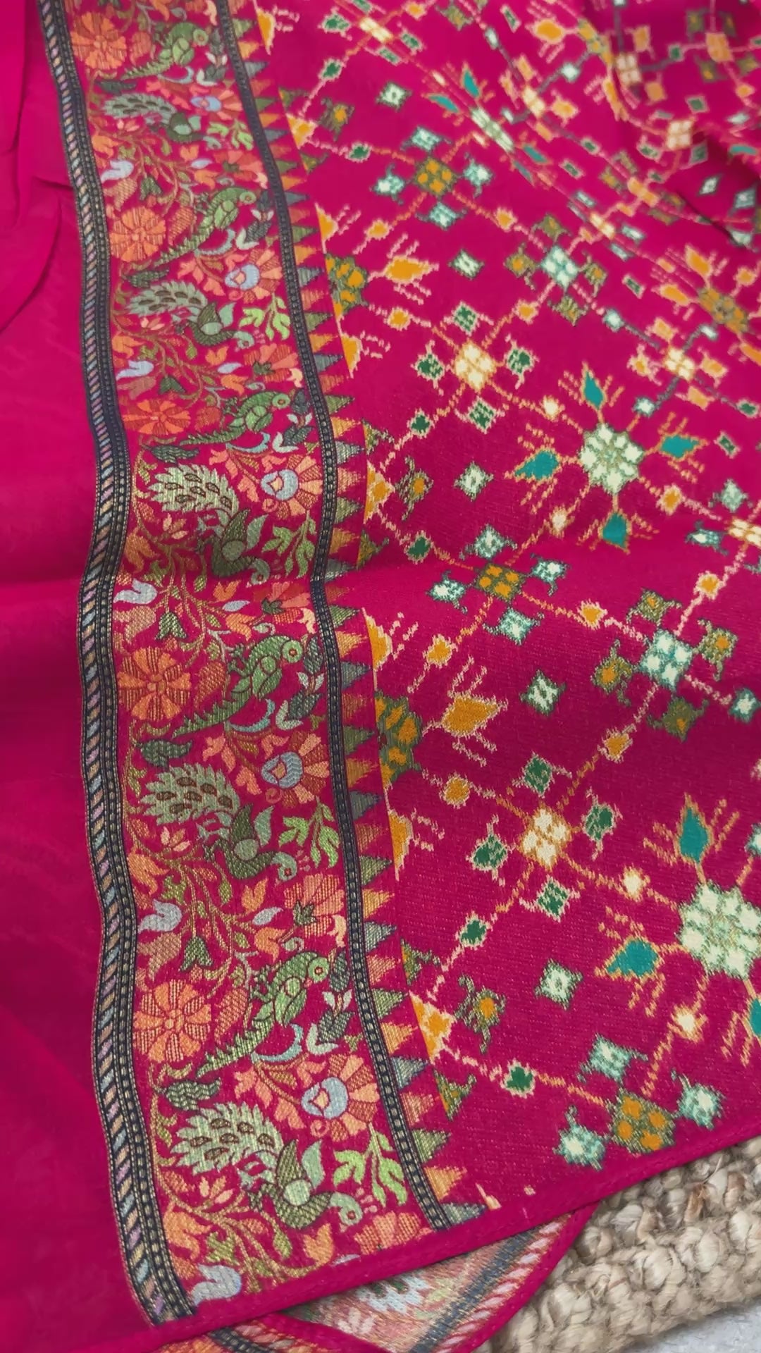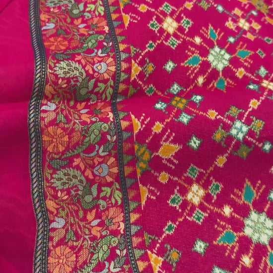 Presenting this exquisite Pure Soft Munga Silk Banarasi Saree, uniquely adorned with a stunning fusion of Patola and Kashmiri Pashmina-inspired work. 🌸 The contrasting Patola-patterned blouse and the elegant silk headpiece complete its timeless charm.