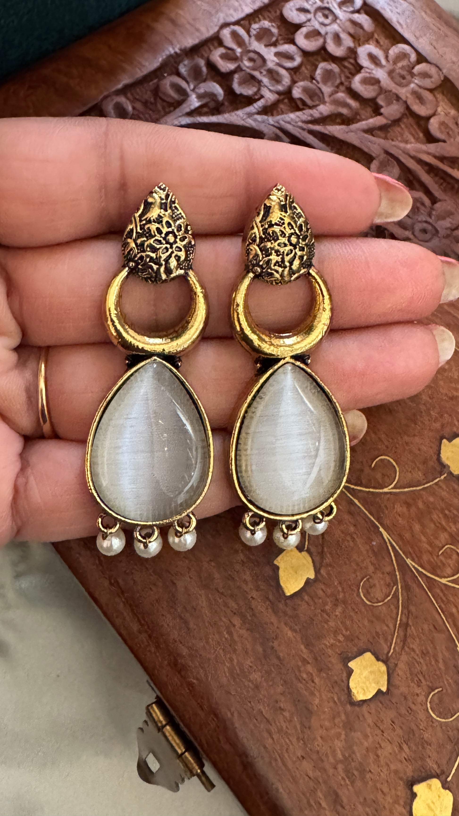 The earrings feature an elegant teardrop-shaped stone at the center, radiating a subtle yet captivating glow. The intricate antique black-gold base showcases fine detailing inspired by temple art, adding a touch of heritage to every ensemble.