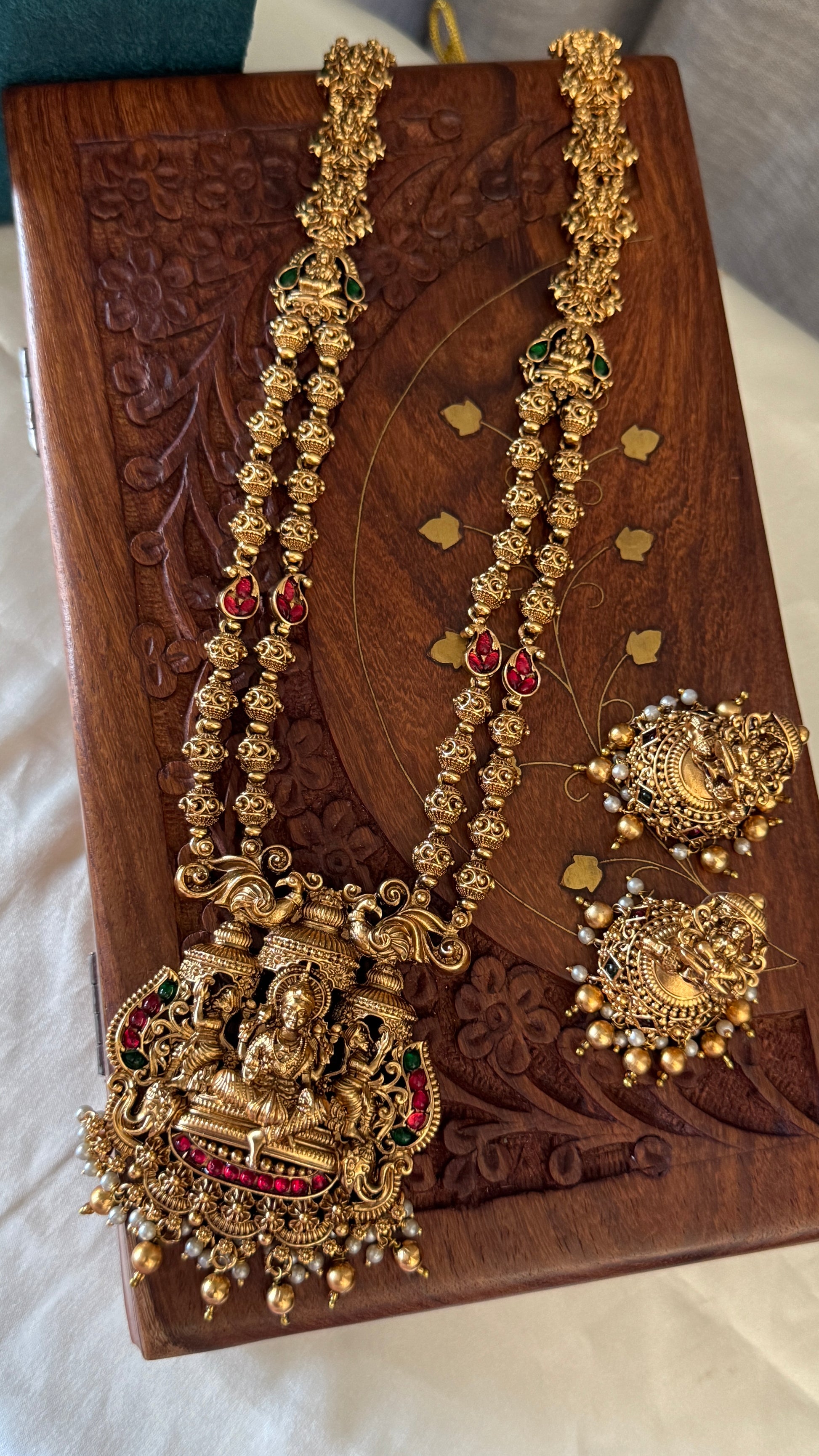 Embrace the grandeur of tradition with this exquisite Antique Gold-Plated Temple Haram Necklace Set, inspired by the divine beauty of South Indian temple art. The long haram is meticulously crafted with intricate motifs reminiscent of temple architecture and adorned with depictions of Goddess Lakshmi and elegant peacock designs, symbolizing prosperity and grace.