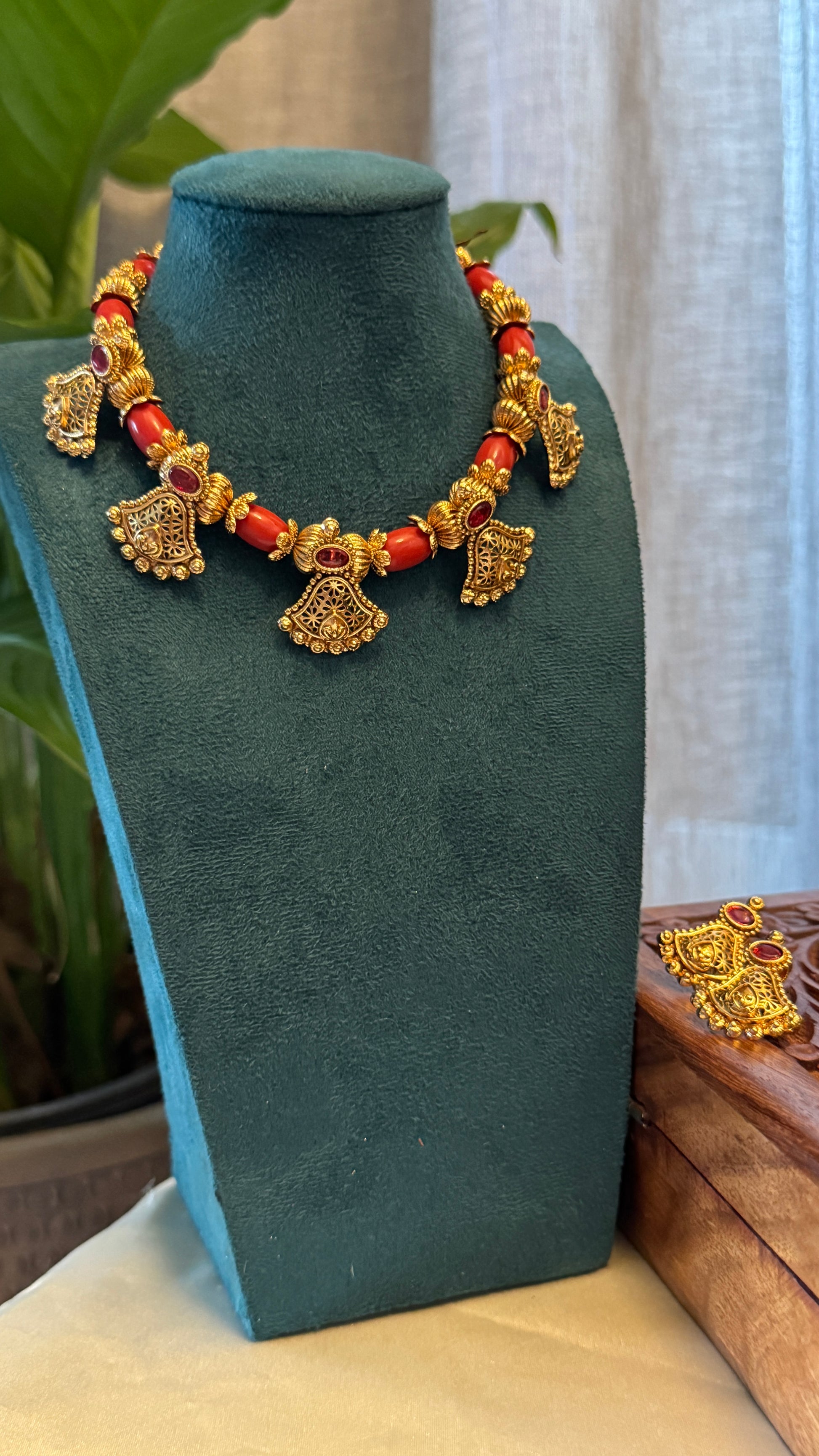 Antique Gold-Plated Temple Necklace Set - Coral Beads