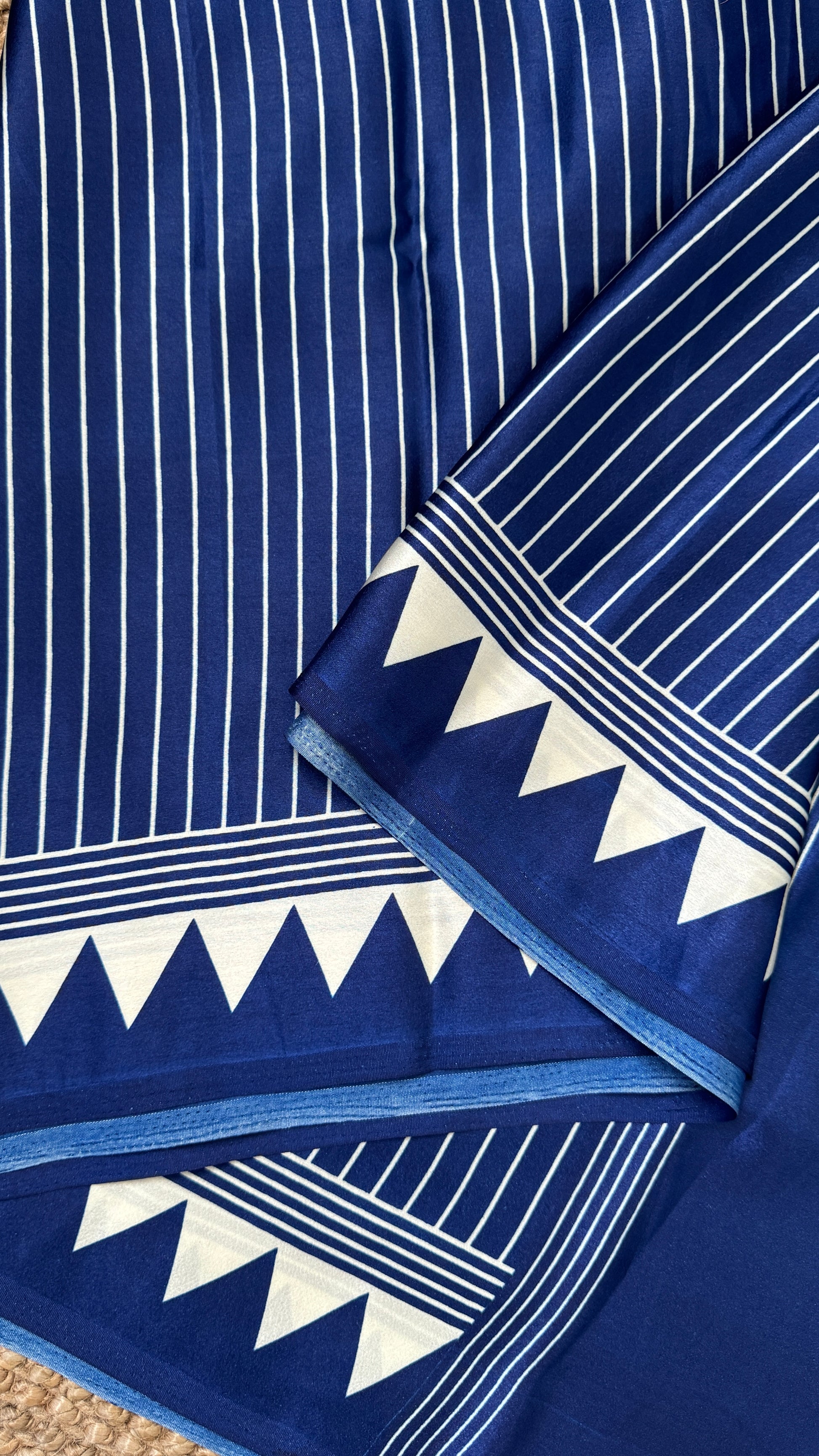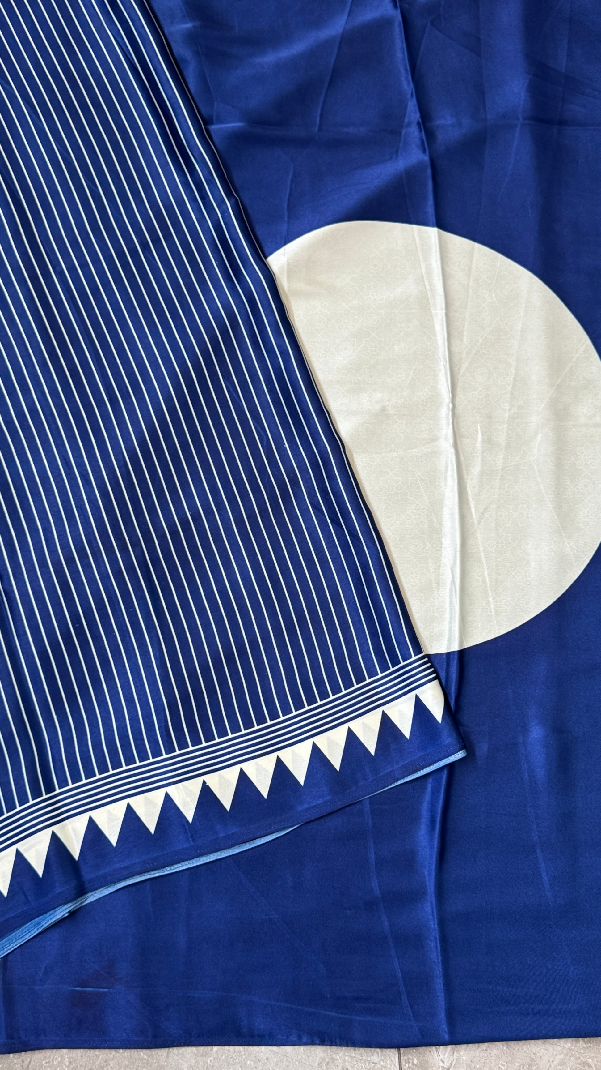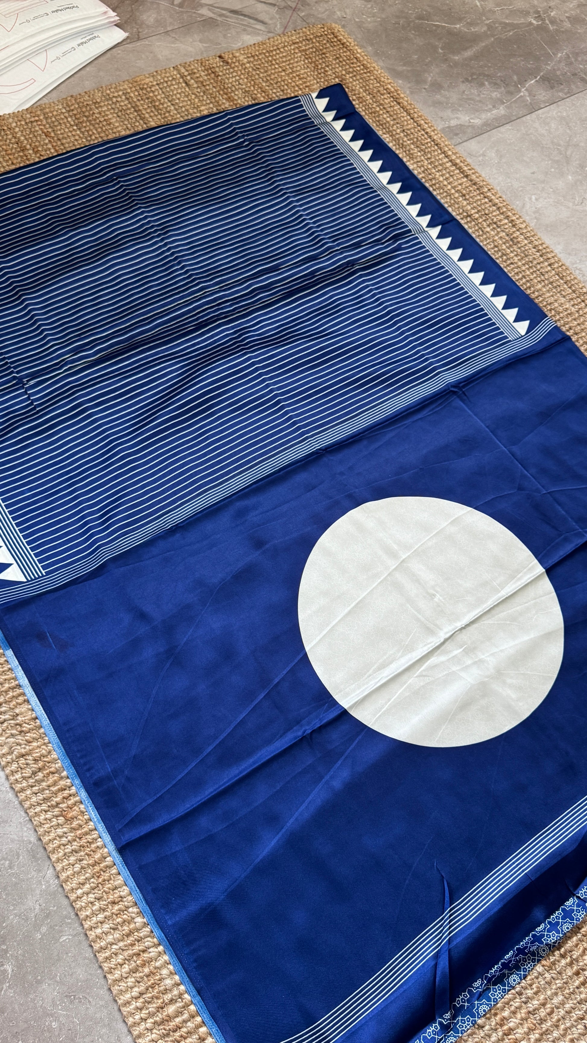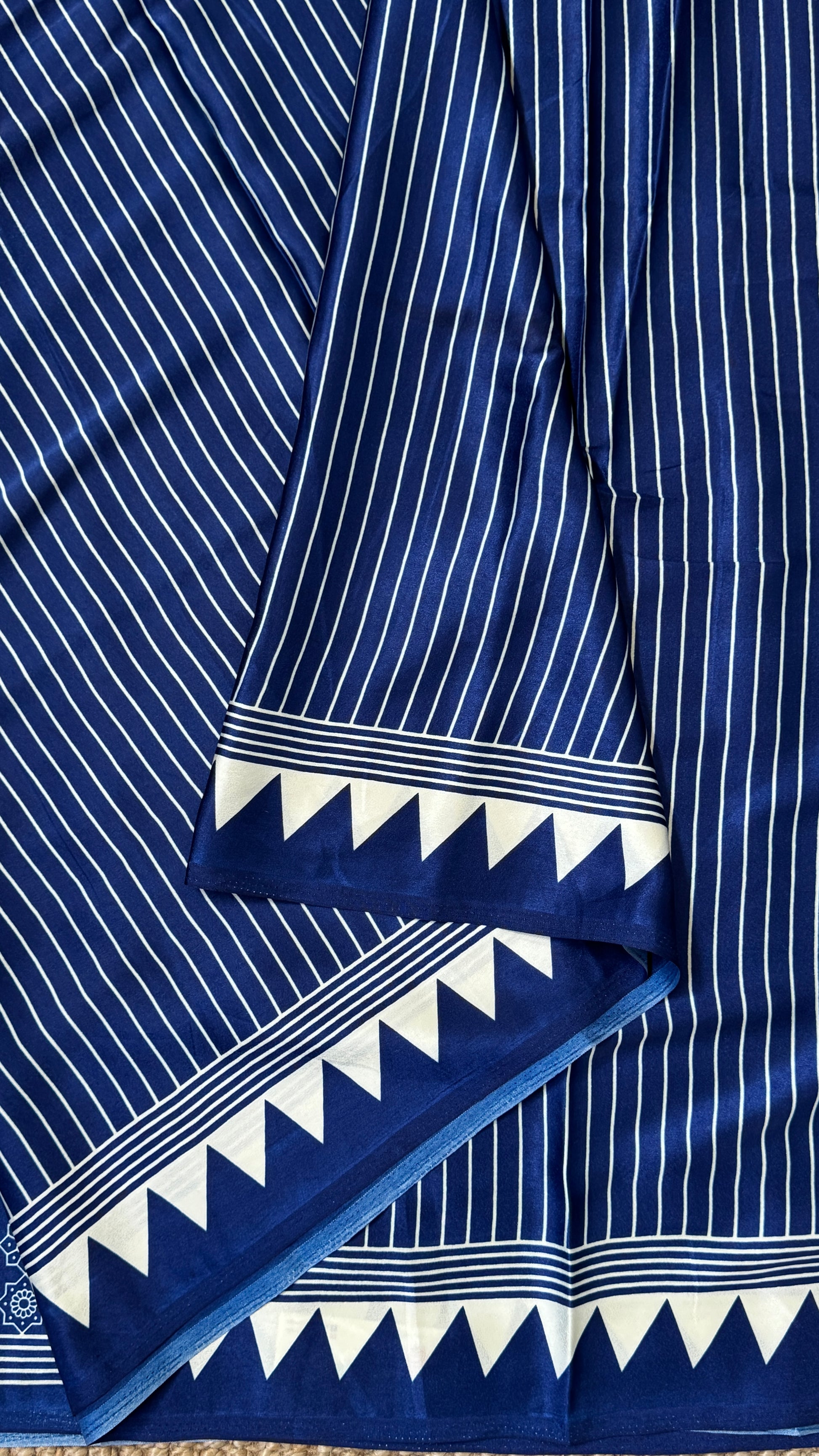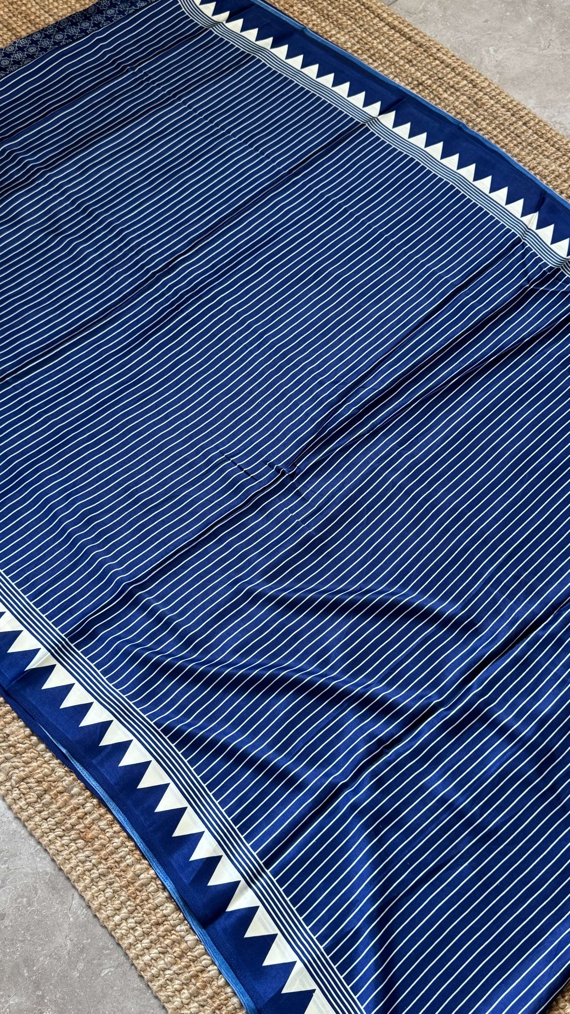 An elegant Blue modal satin saree featuring subtle vertical lining designs throughout the body. The saree is accentuated with a beautiful temple-style printed border and a striking big circle design pallu, creating a perfect balance of tradition and modern artistry.