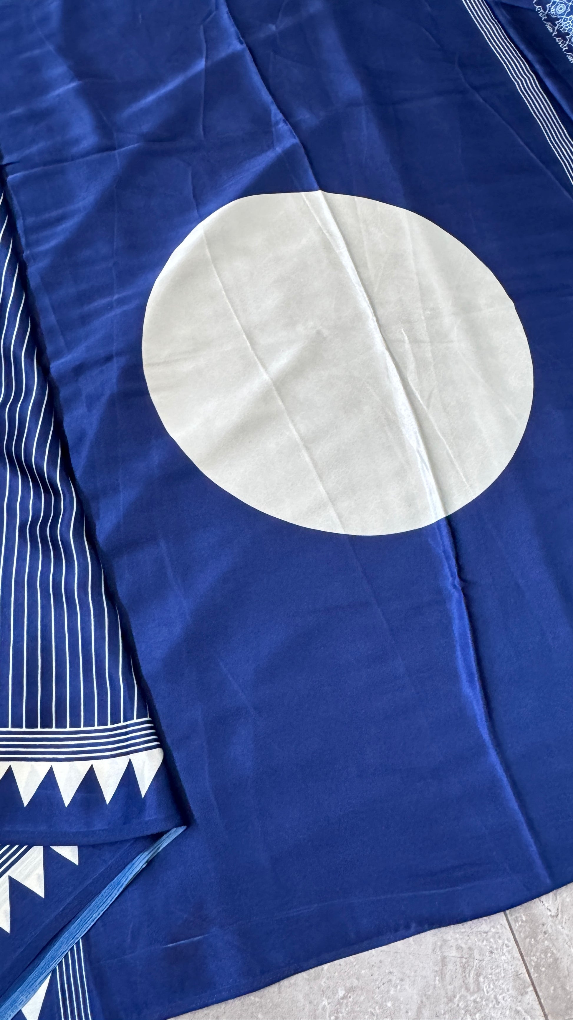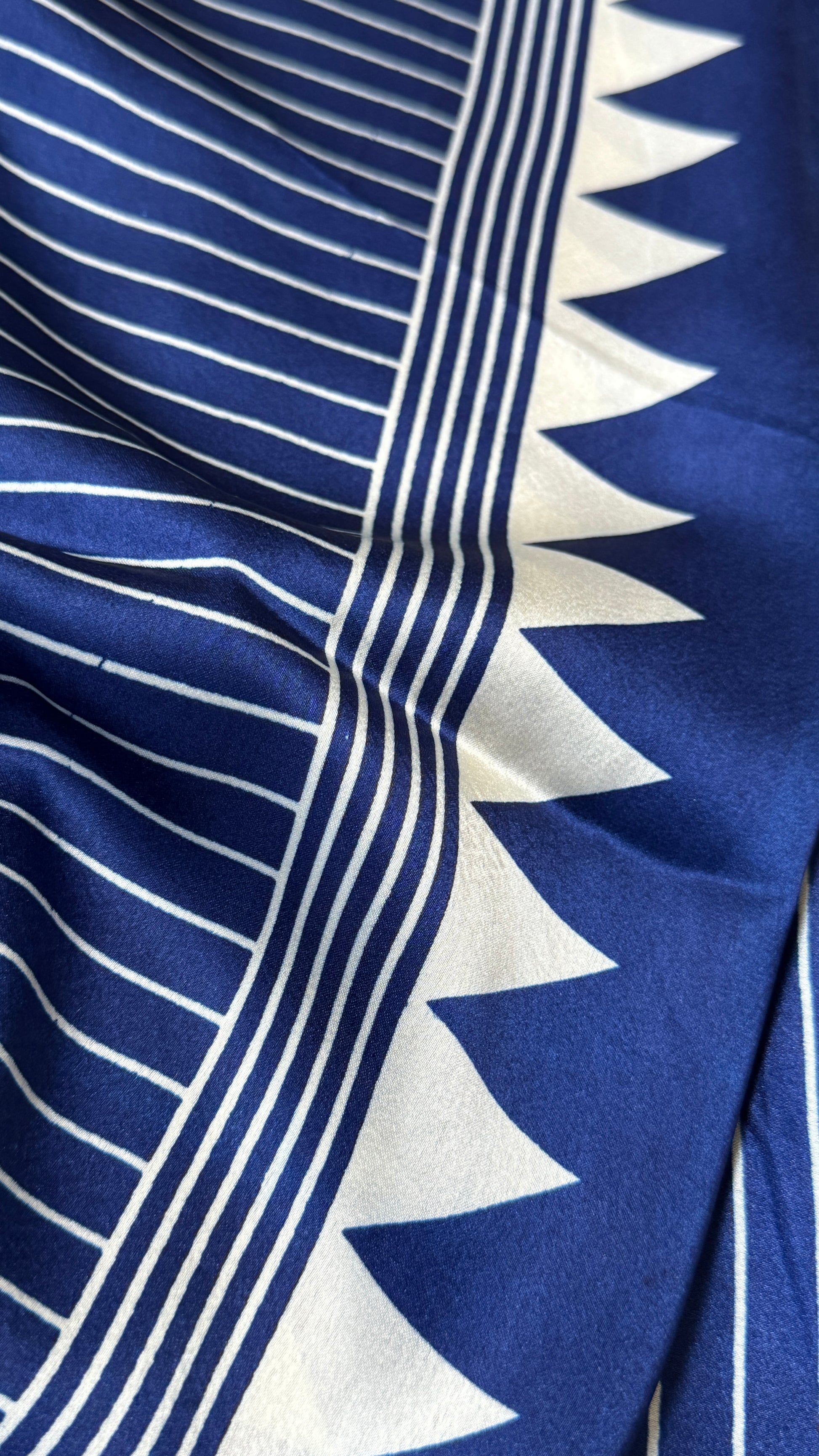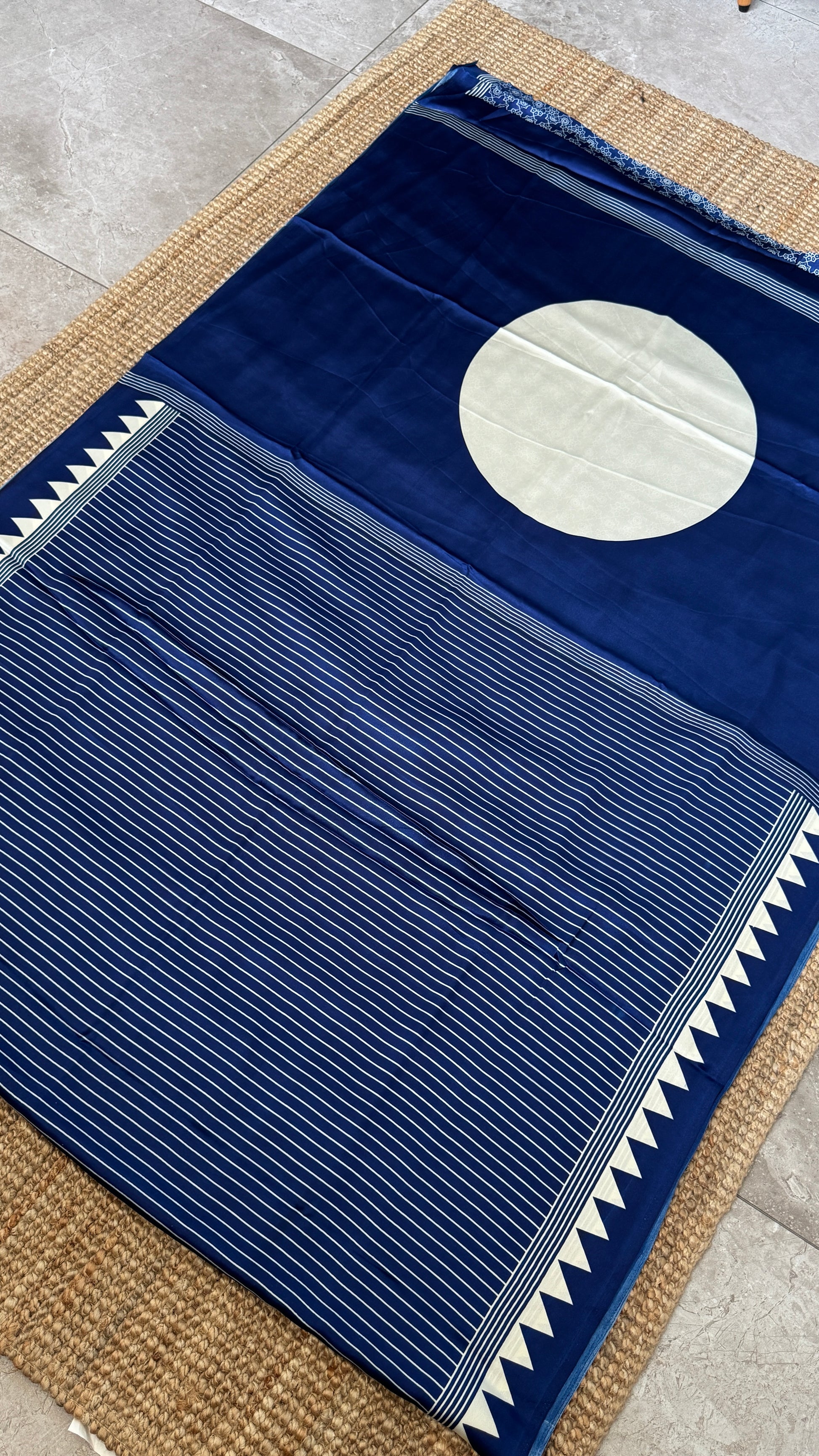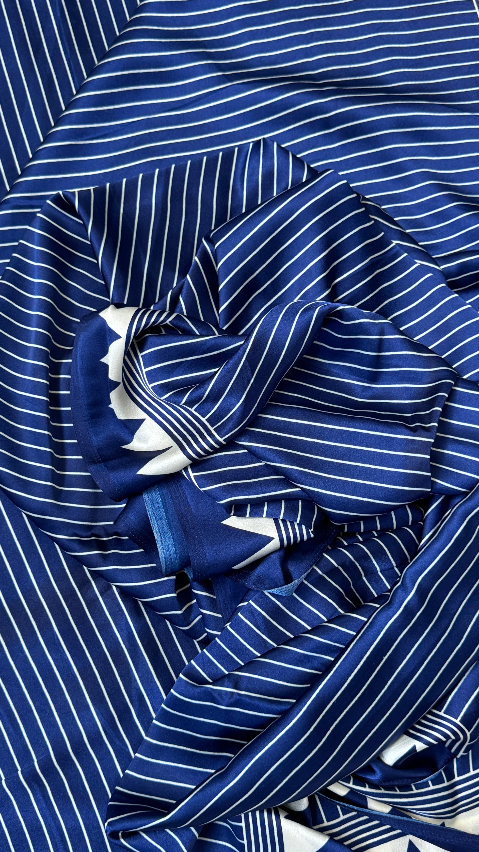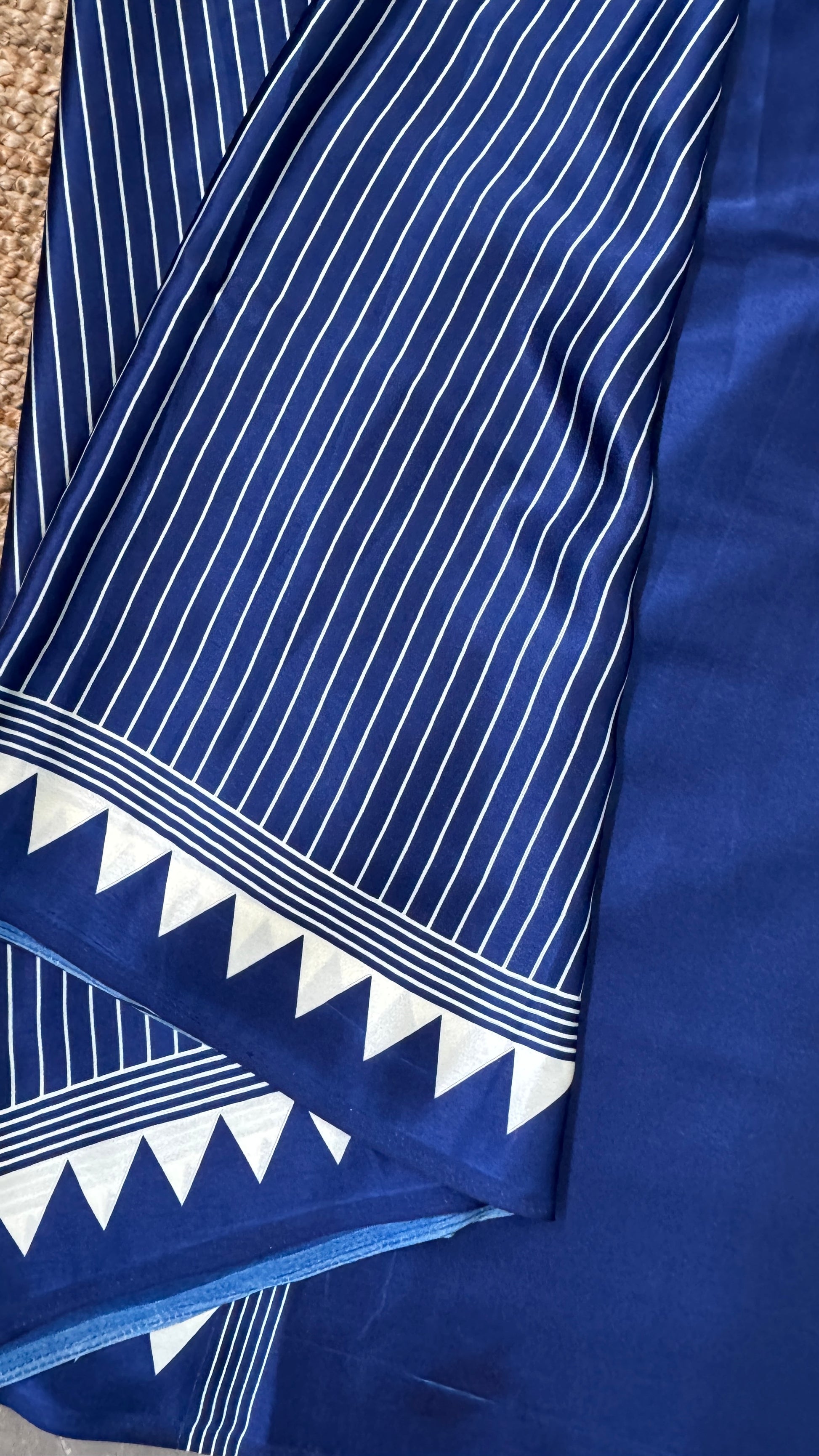 An elegant Blue modal satin saree featuring subtle vertical lining designs throughout the body. The saree is accentuated with a beautiful temple-style printed border and a striking big circle design pallu, creating a perfect balance of tradition and modern artistry.