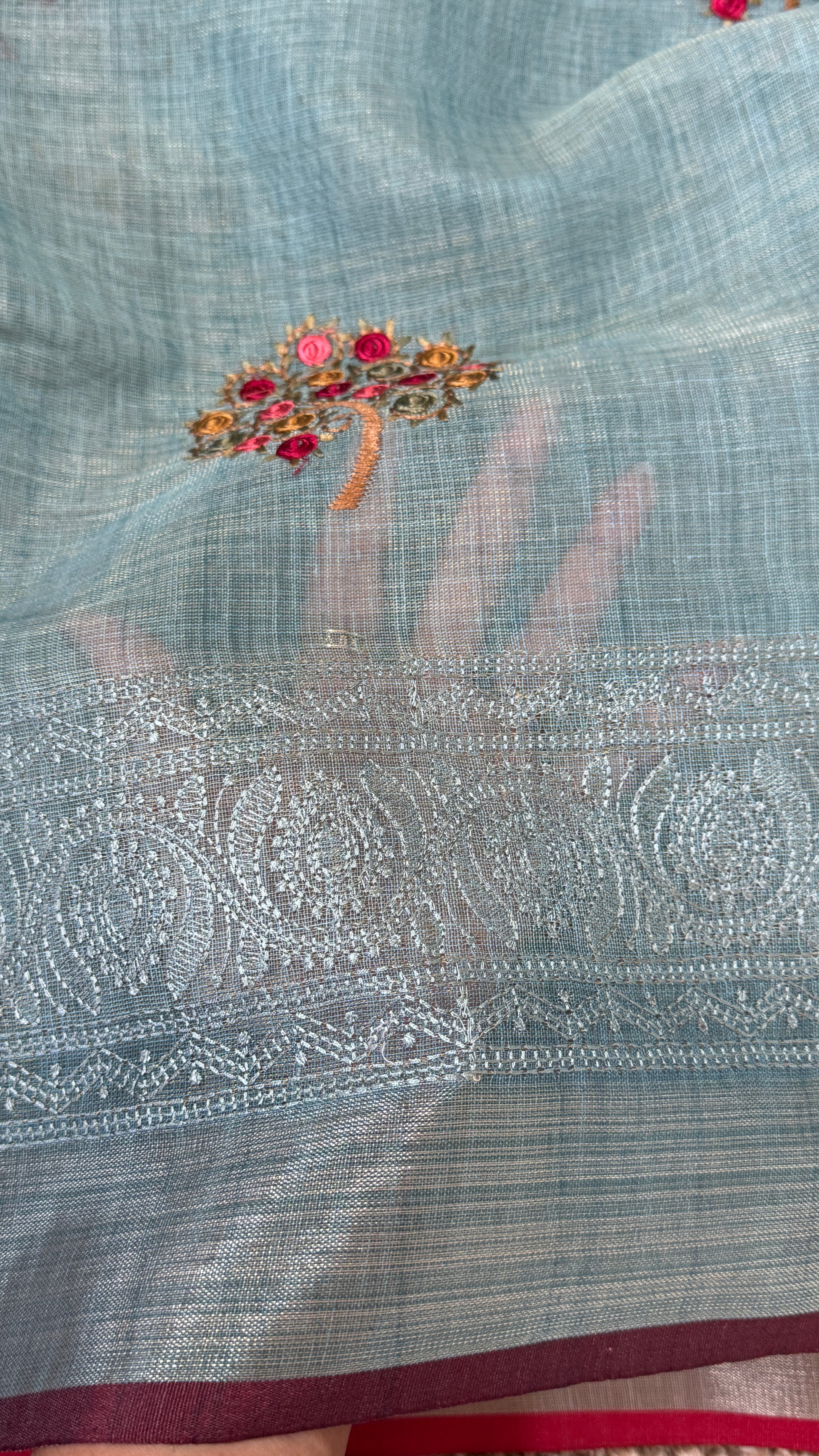 The sarees feature a soft, breathable drape that flows effortlessly, making them ideal for festive occasions, formal gatherings, or elegant day events. The highlight of this collection is the beautifully embroidered border and floral patterns, intricately designed to complement the subtle elegance of the linen body.