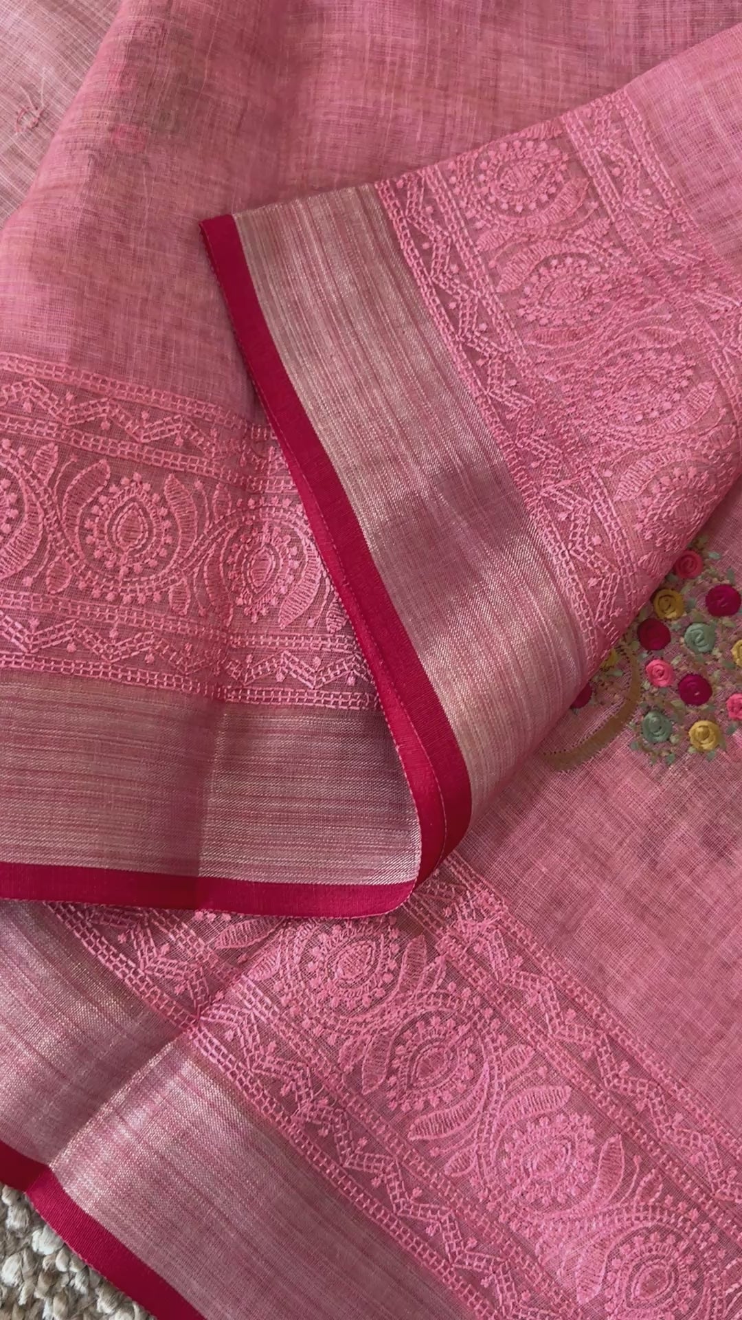 The sarees feature a soft, breathable drape that flows effortlessly, making them ideal for festive occasions, formal gatherings, or elegant day events. The highlight of this collection is the beautifully embroidered border and floral patterns, intricately designed to complement the subtle elegance of the linen body.