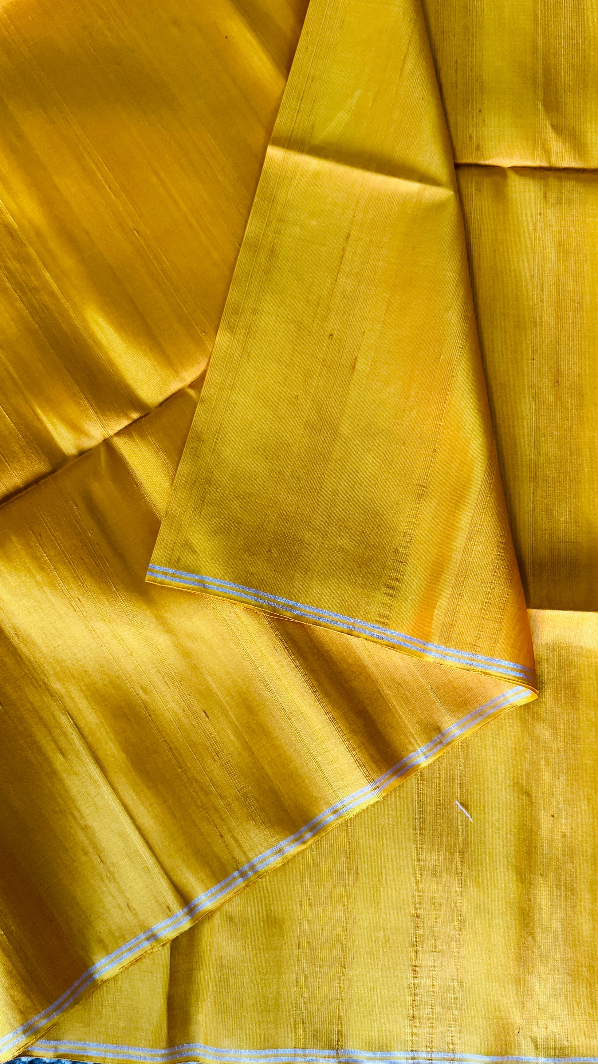 Graceful, refined, and effortlessly elegant — this Kanchivaram Pure Soft Silk Saree embodies timeless craftsmanship in a refreshing color palette. The saree features a mustard yellow body adorned with delicate gold vertical stripes, adding a subtle shimmer and enhancing its luxurious appeal.