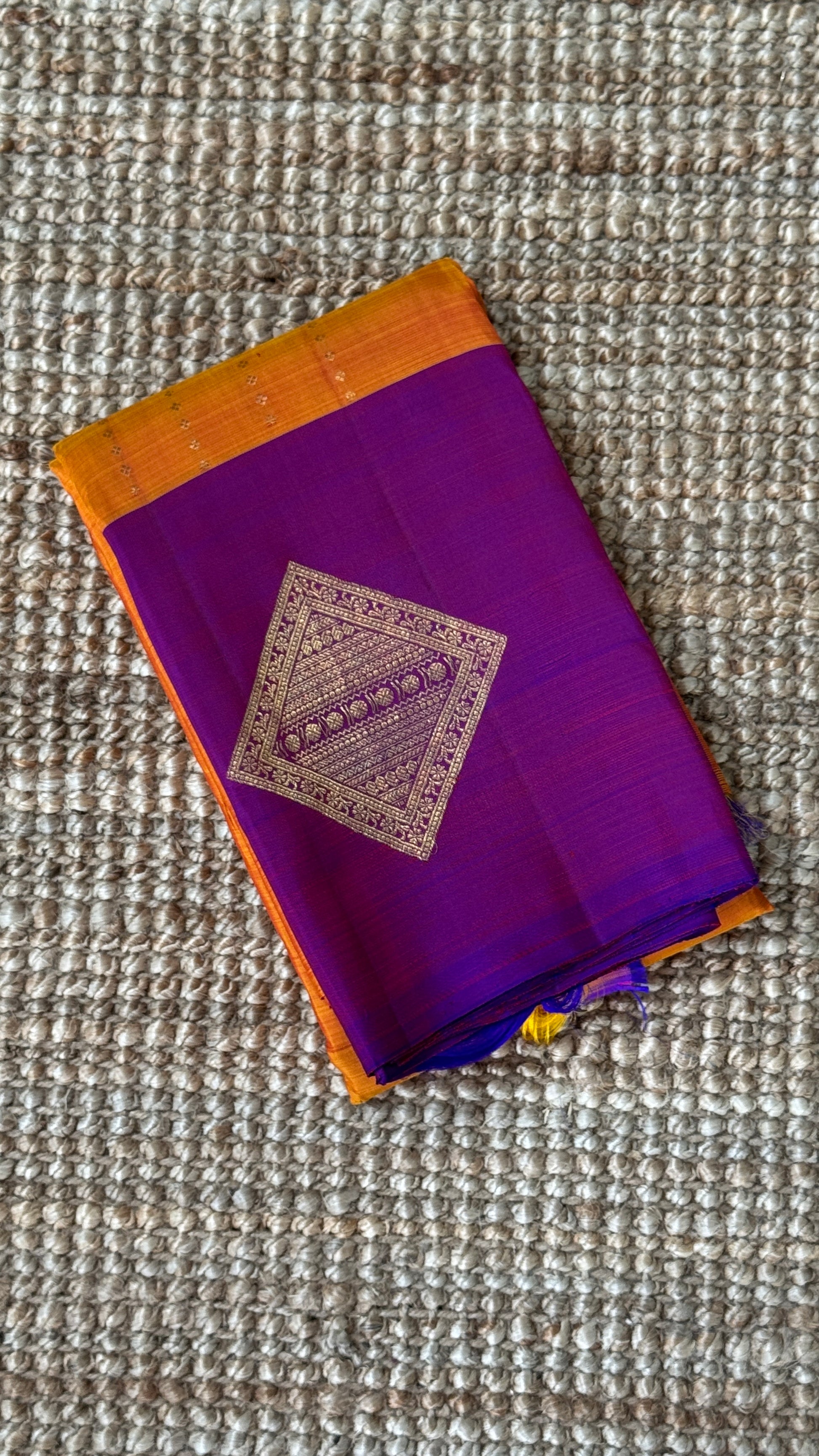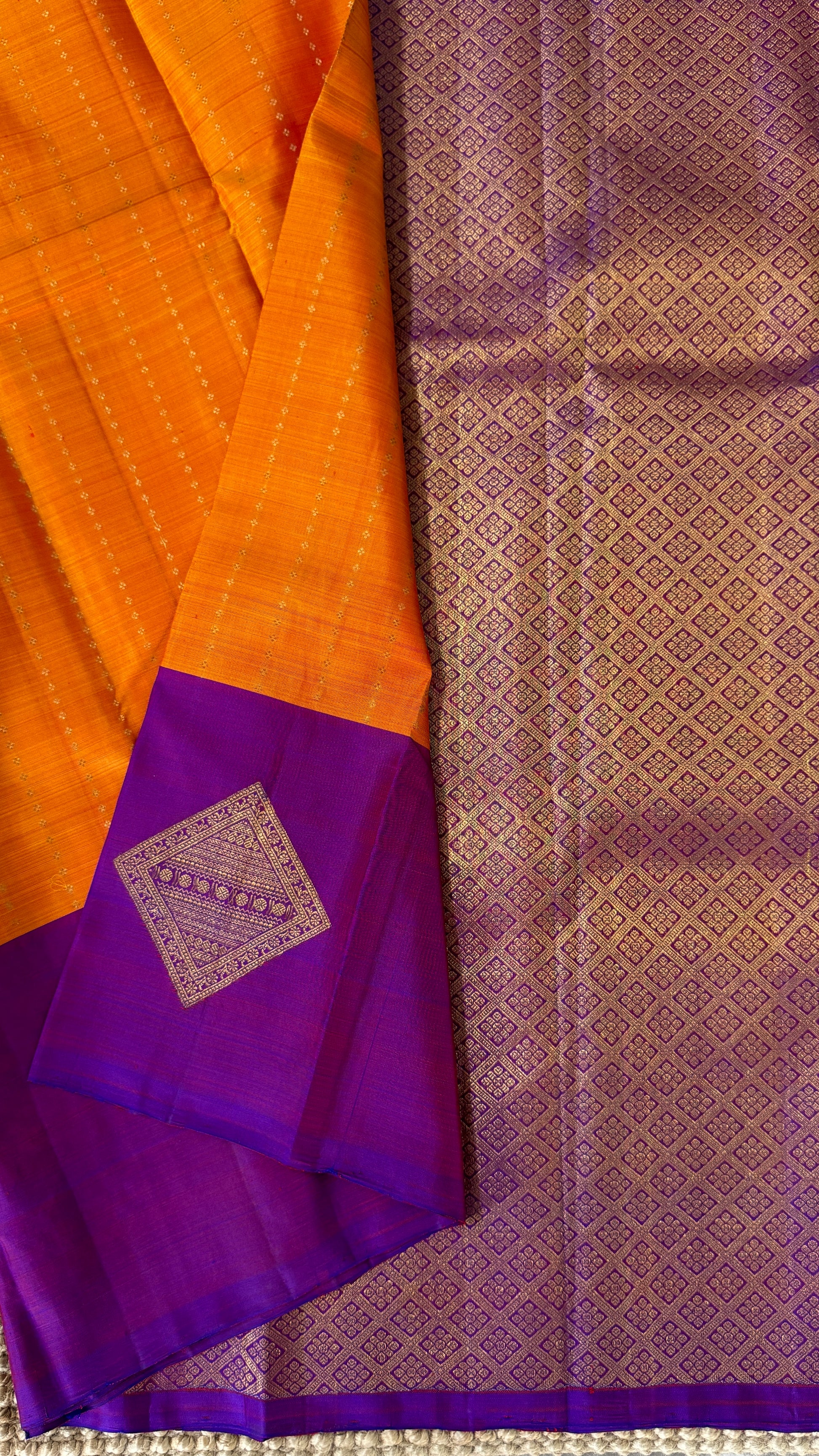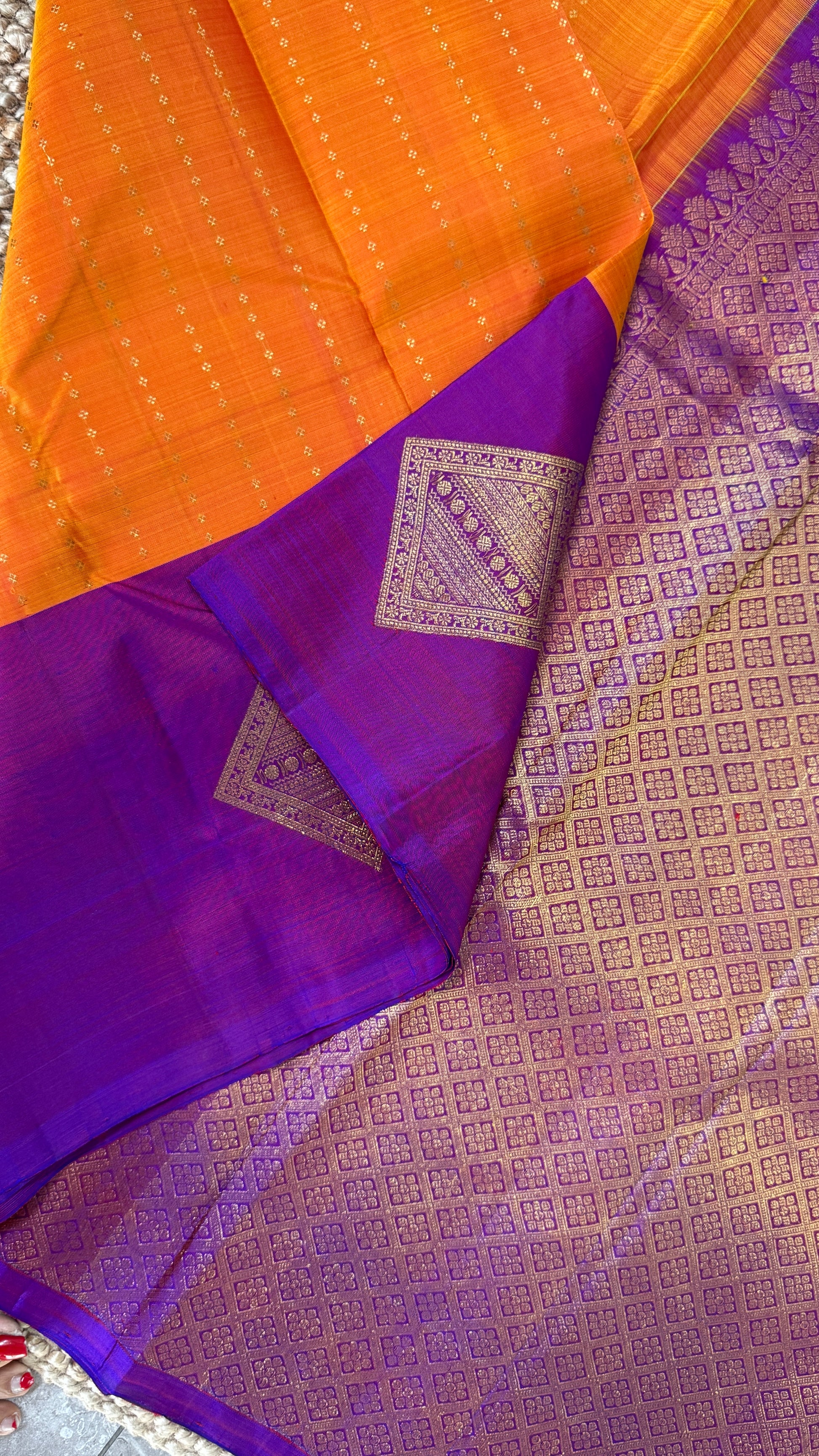 A radiant celebration of tradition and craftsmanship, this Pure Handwoven Kanjivaram Silk Saree features a vibrant orange body paired with a deep purple pallu and a distinctive one-side border, creating a contemporary twist on classic elegance.