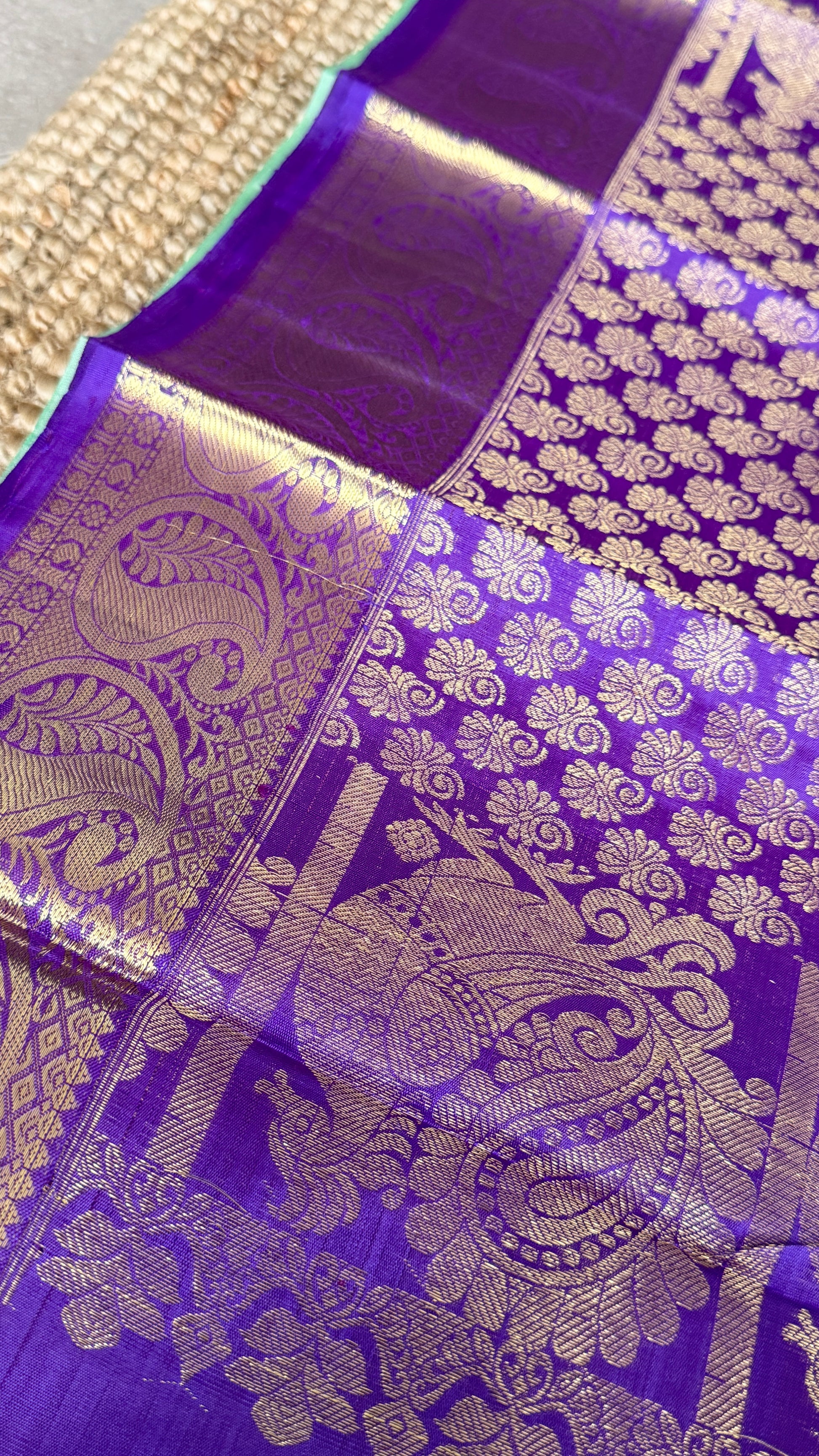 KANJIVARAM PURE SILK HANDLOOM SAREE – AQUAMARINE & PURPLE WITH MANGO AND PEACOCK MOTIFS
