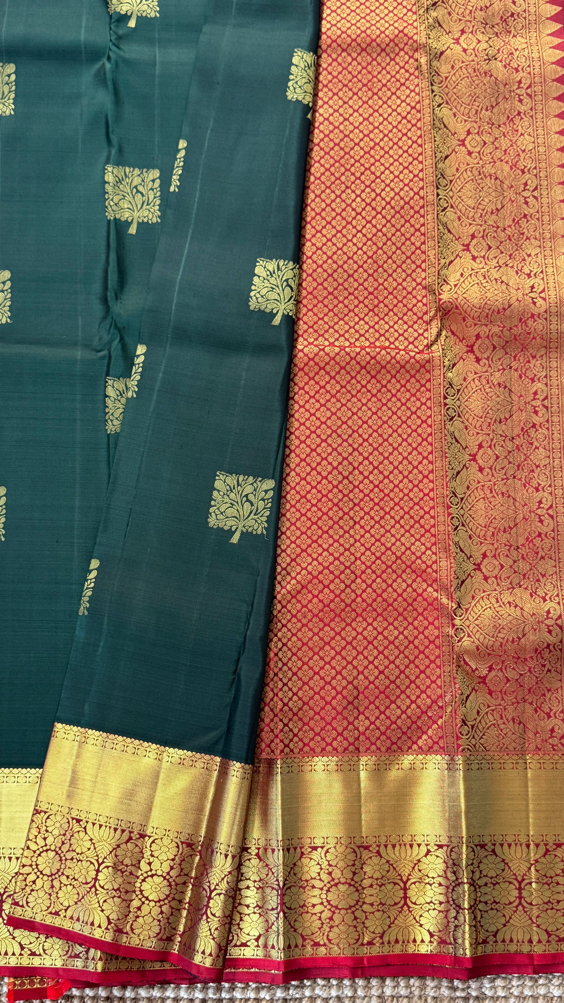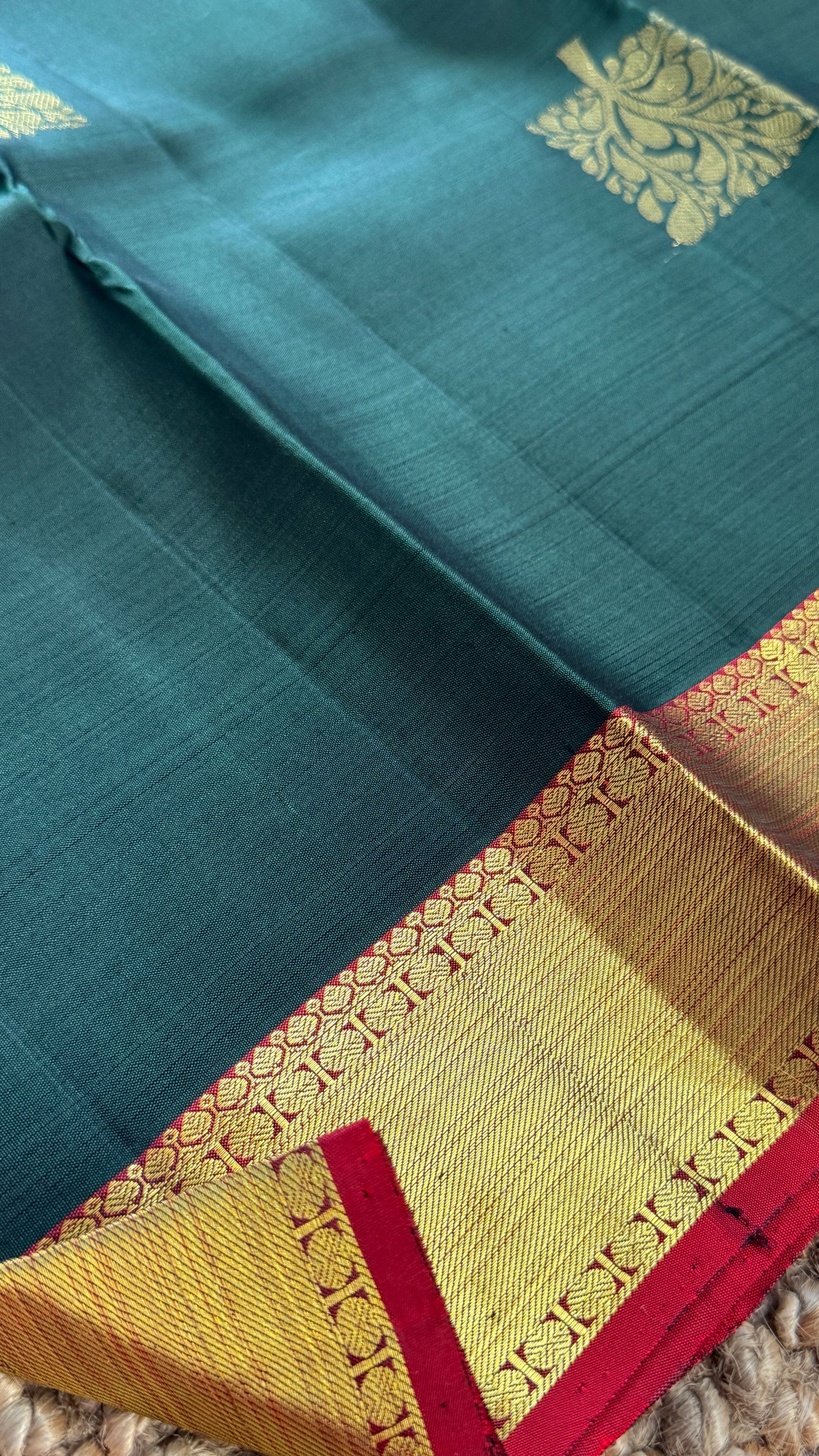 KANJIVARAM PURE SILK HANDLOOM SAREE in Bottle Green and contrast Red Pallu and Border