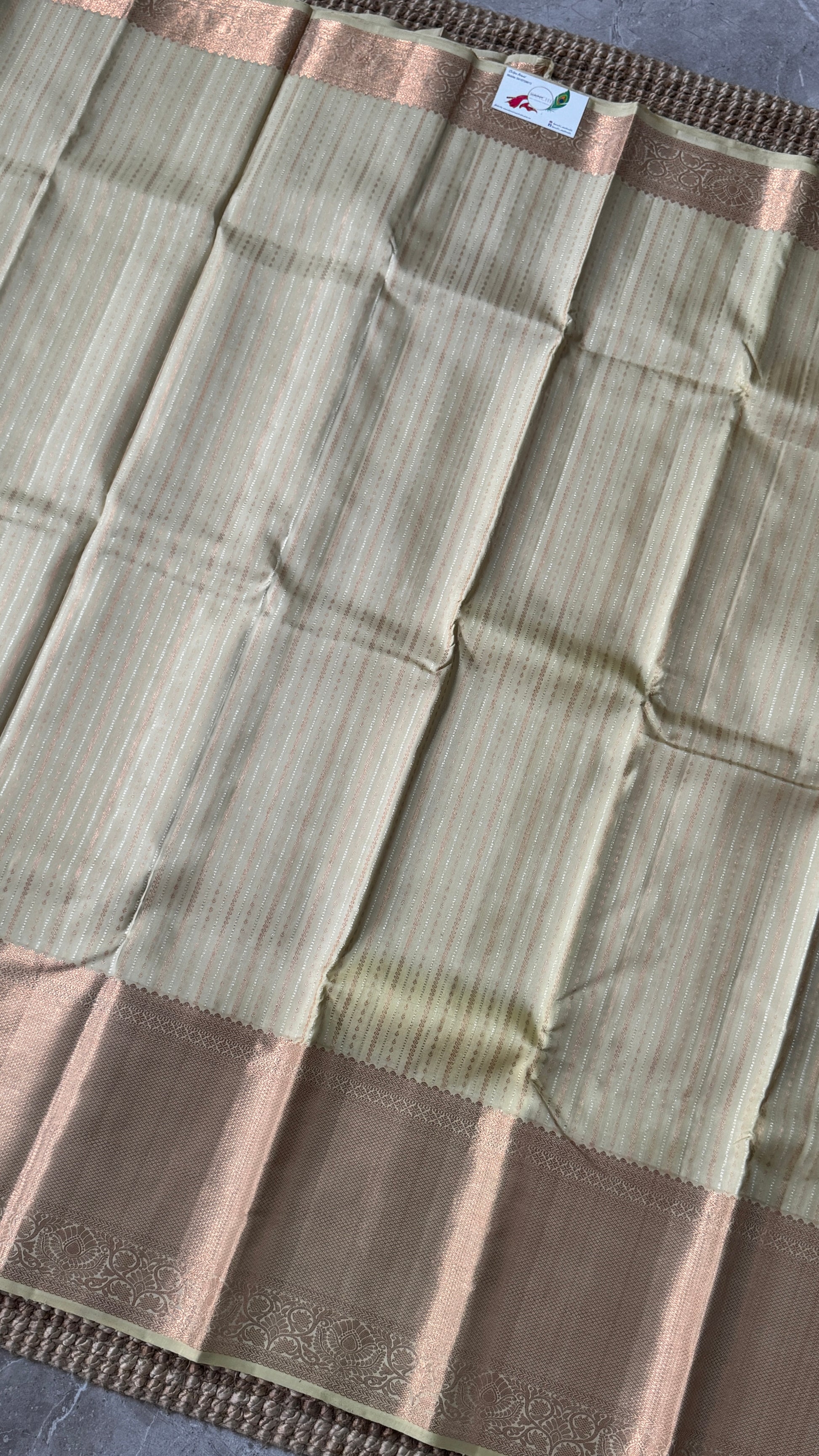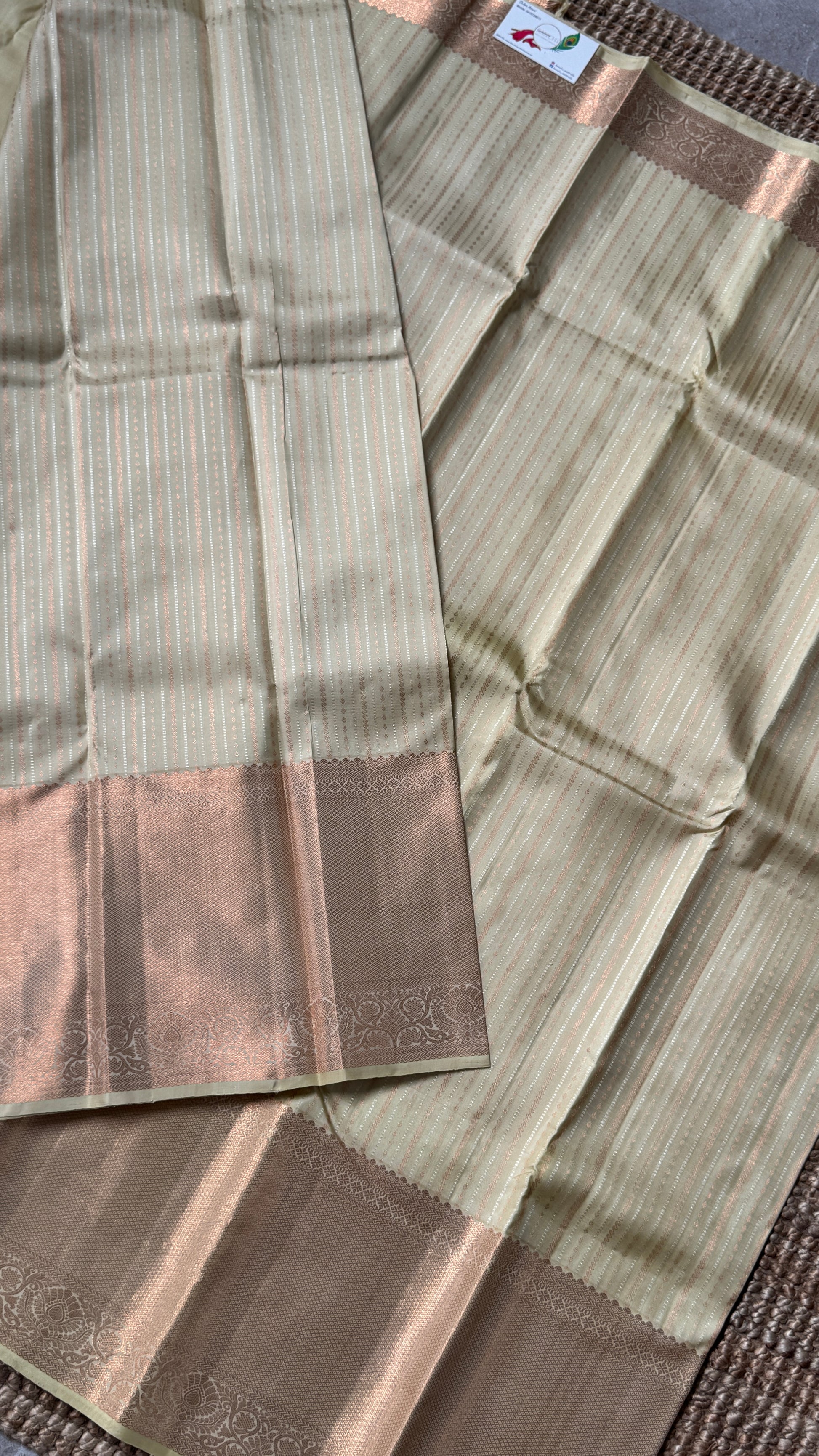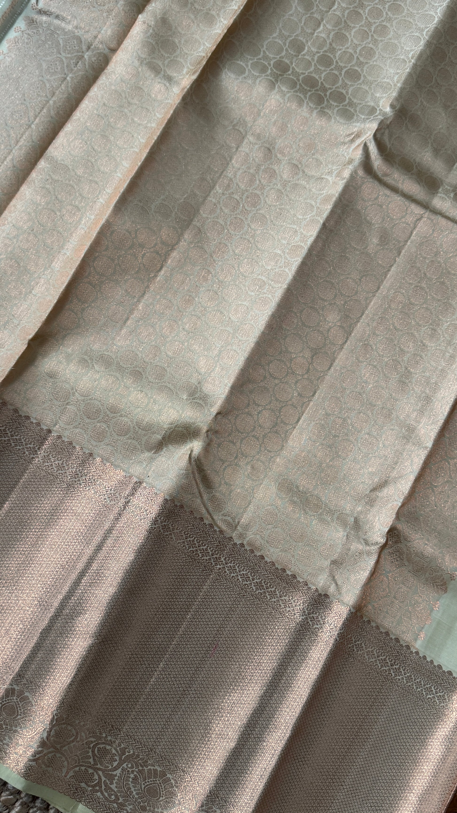 The border and pallu of the saree are adorned with detailed zari motifs—delicate vertical tiny floral vines and ornamental patterns that enhance its grandeur. The shimmering copper zari border, highlighted with a subtle Champagne undertone, perfectly frames the saree, lending it an aura of refinement and tradition. The pallu, luxuriously woven in copper adds a touch of magnificence that completes the ensemble.