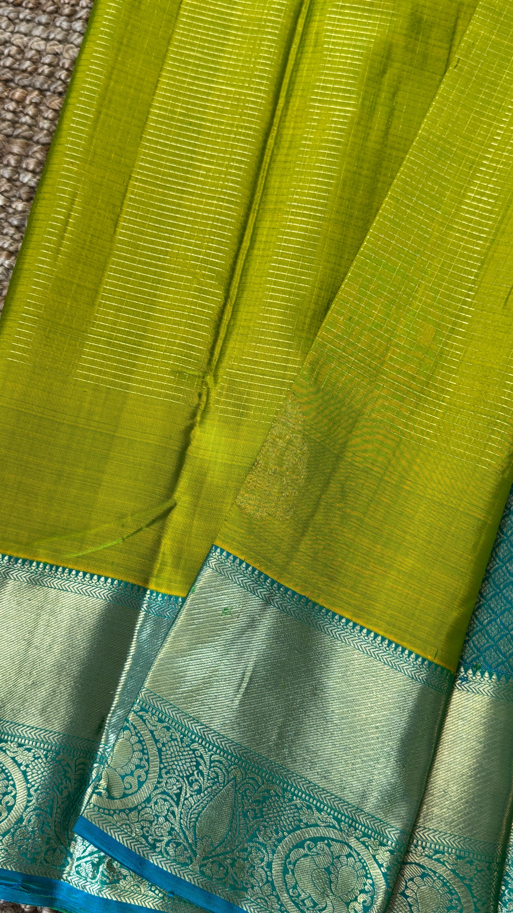 • Border: Elegant peacock motifs with traditional korvai weaving