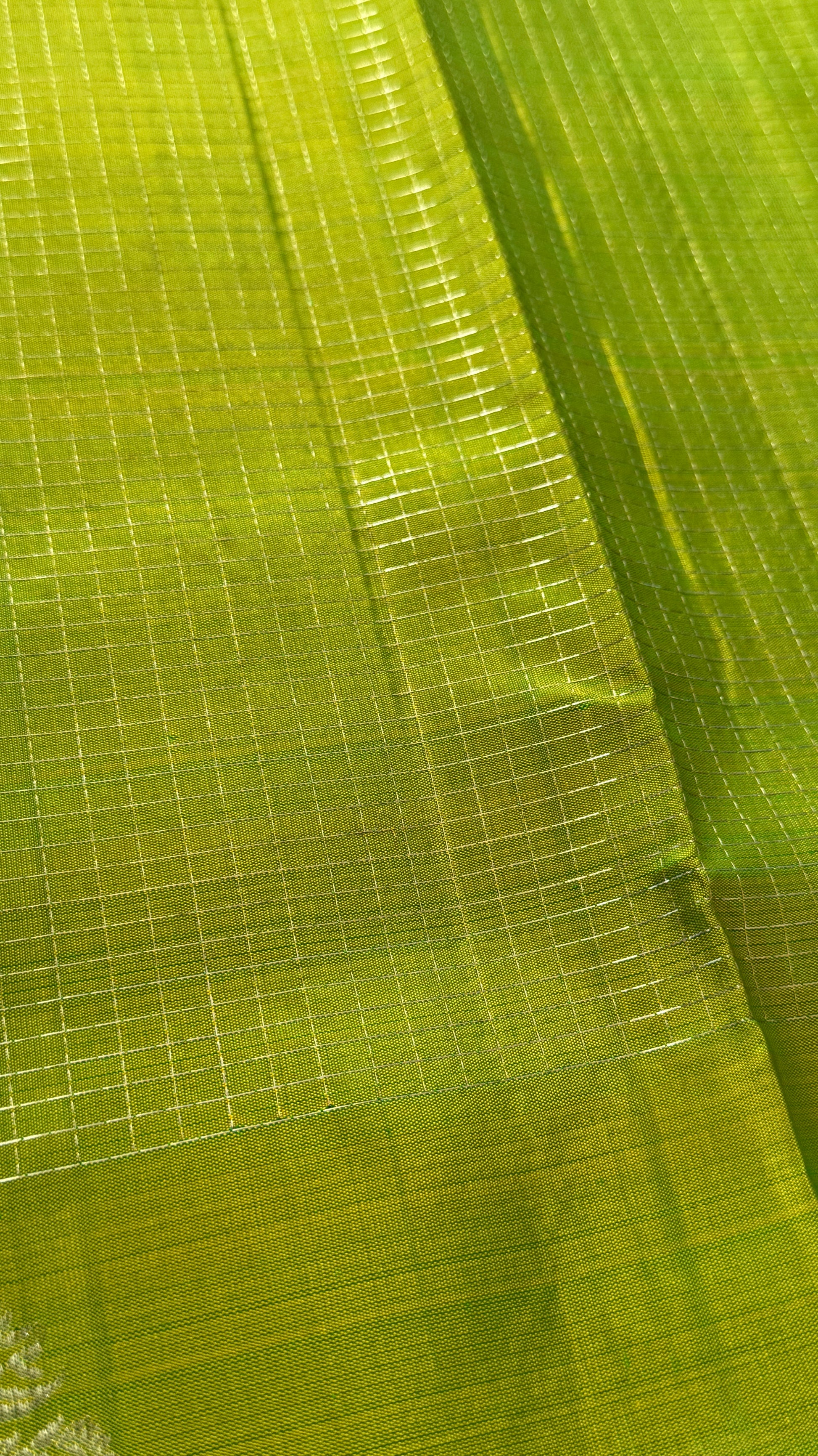 A magnificent expression of traditional artistry and timeless beauty, this Pure Kanchivaram Silk Saree features a vibrant green body paired with a rich Rama blue border and pallu, making it a truly captivating piece for every occasion.