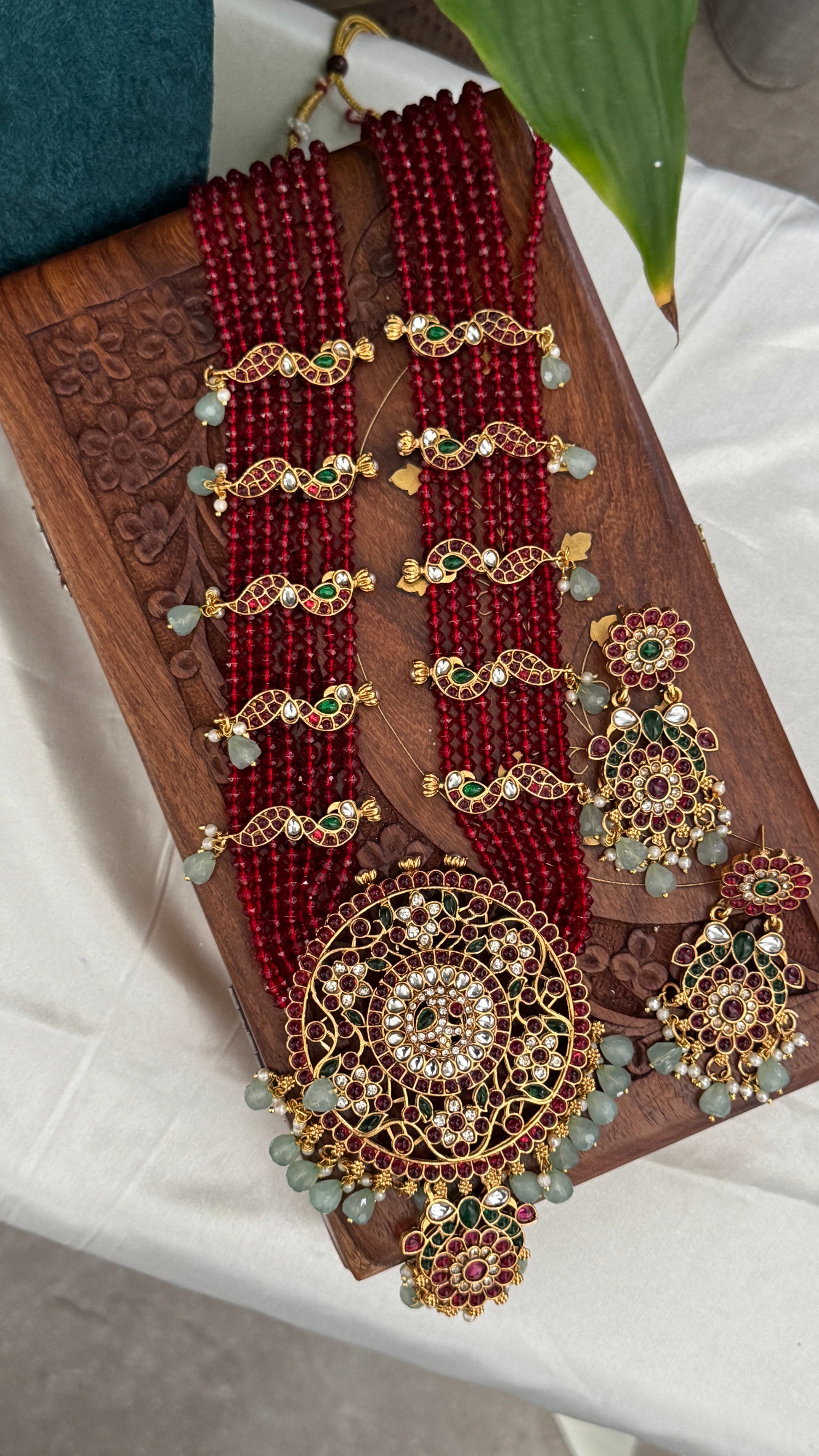 Elevate your bridal look with this stunning Red Beaded Temple Long Haar Necklace Set, exquisitely handcrafted with gold-plated brass, Ruby and Emarald stones, and delicate white stones. Designed with intricate detailing, this necklace embodies the richness of Indian heritage jewellery while offering modern elegance.