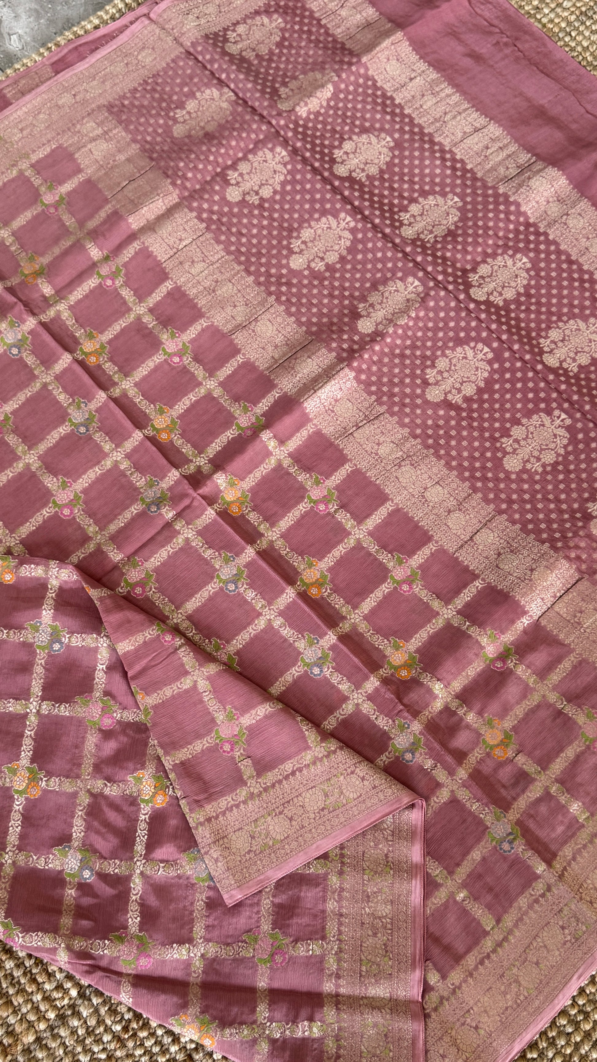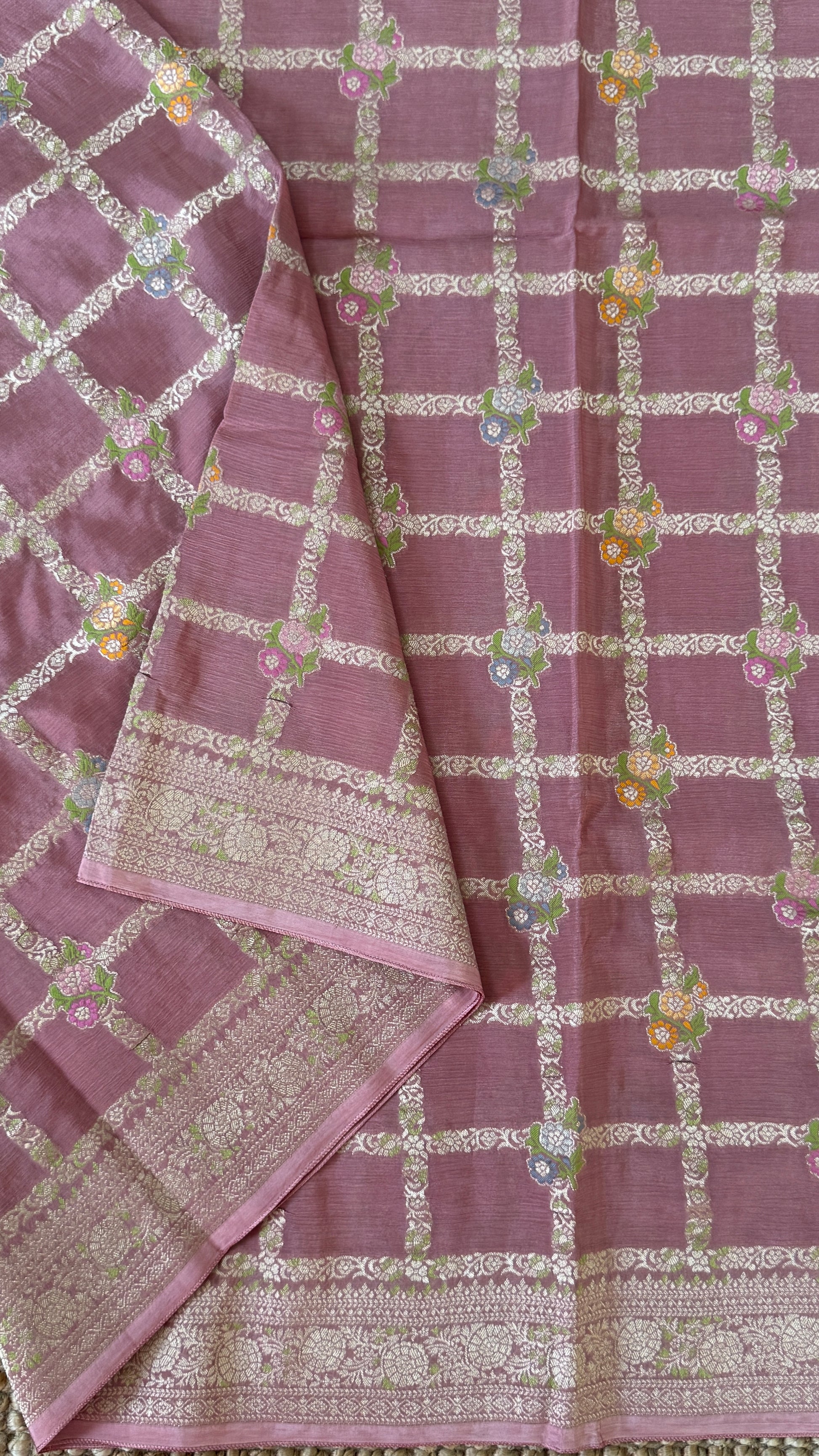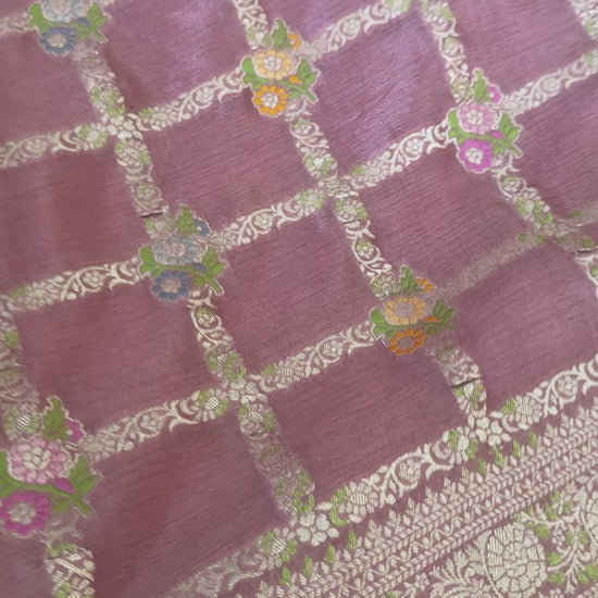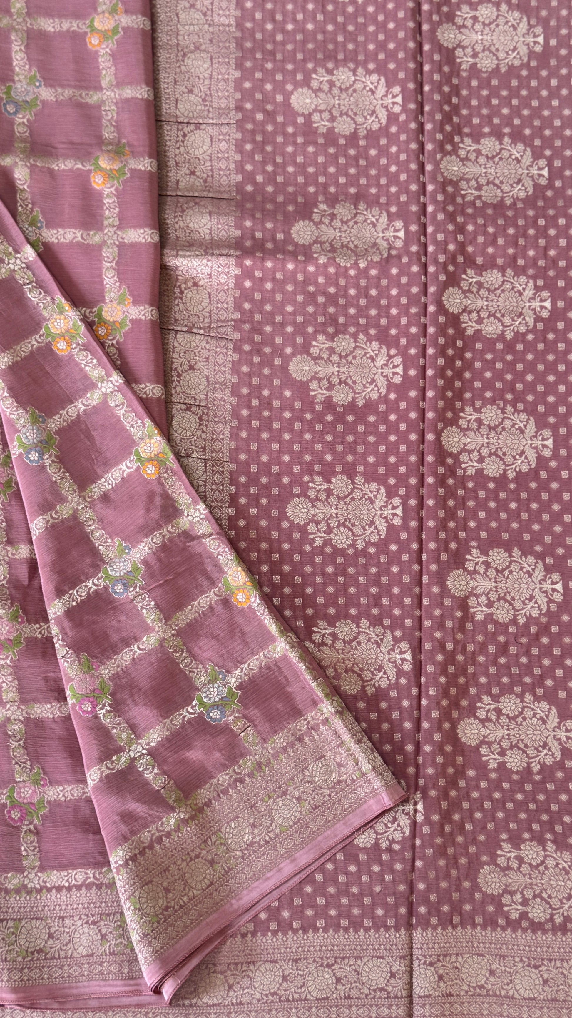 A stunning fusion of traditional artistry and timeless sophistication, this Crushed Munga Silk Banarasi Saree in Mauve is a true masterpiece of craftsmanship.