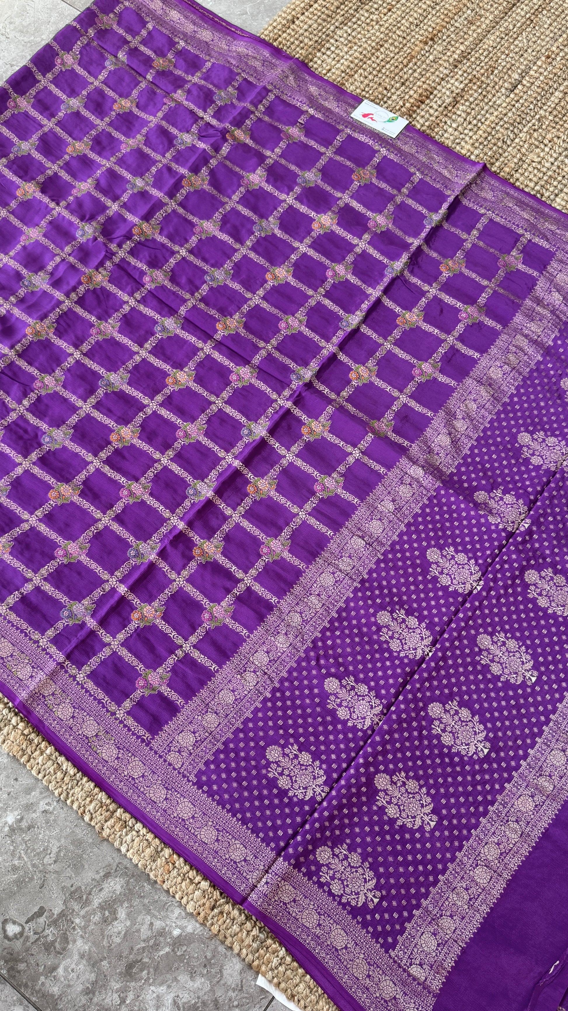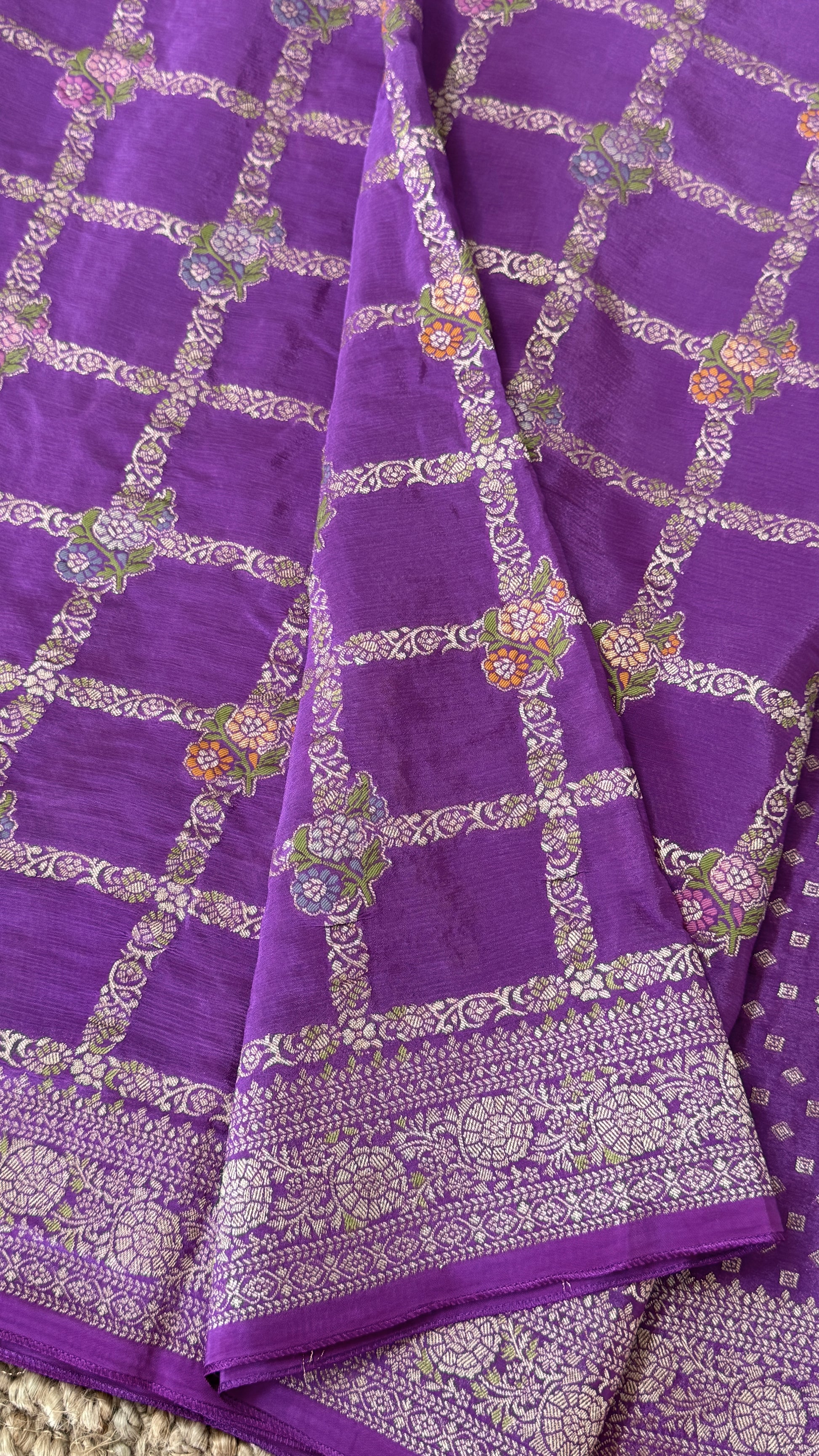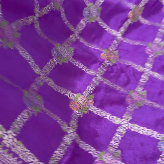 Adding to its charm, the saree showcases a contrast grid-style floral pattern in soft hues of yellow, lilac, green, and peach — giving it a touch of vibrancy without overpowering its regal Purple tone.