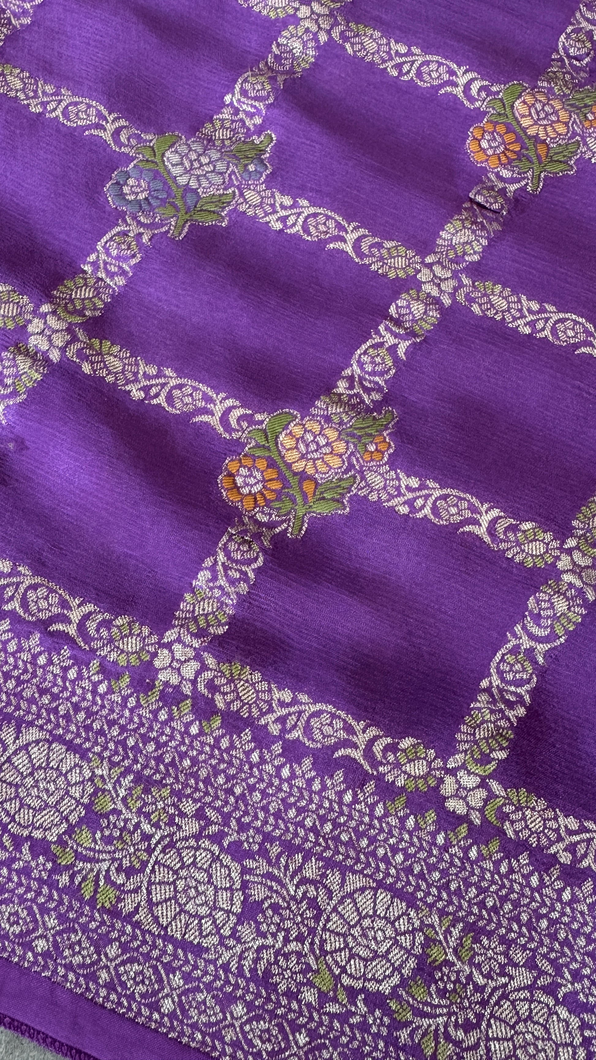 A stunning fusion of traditional artistry and timeless sophistication, this Crushed Munga Silk Banarasi Saree in Purple is a true masterpiece of craftsmanship.