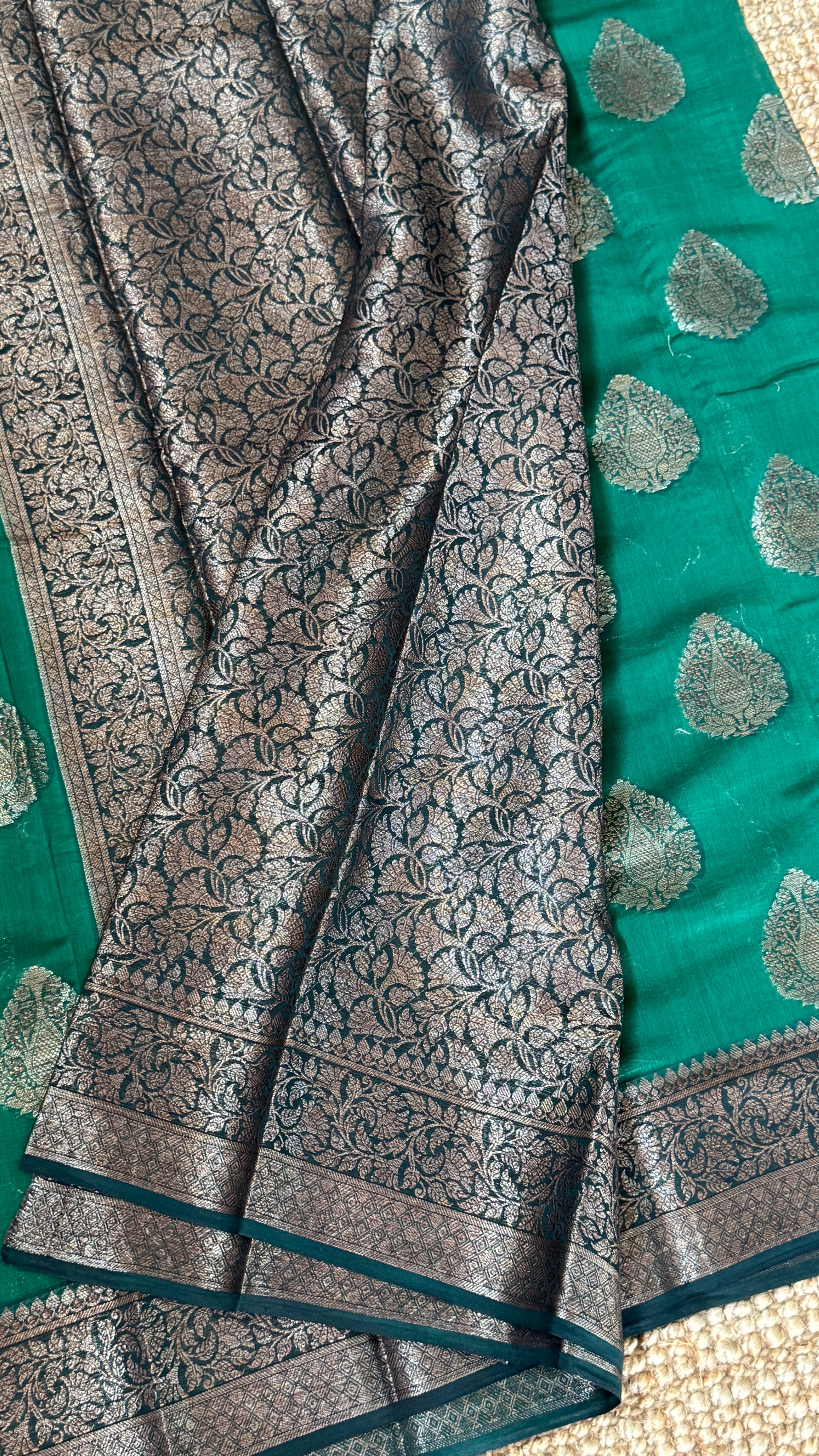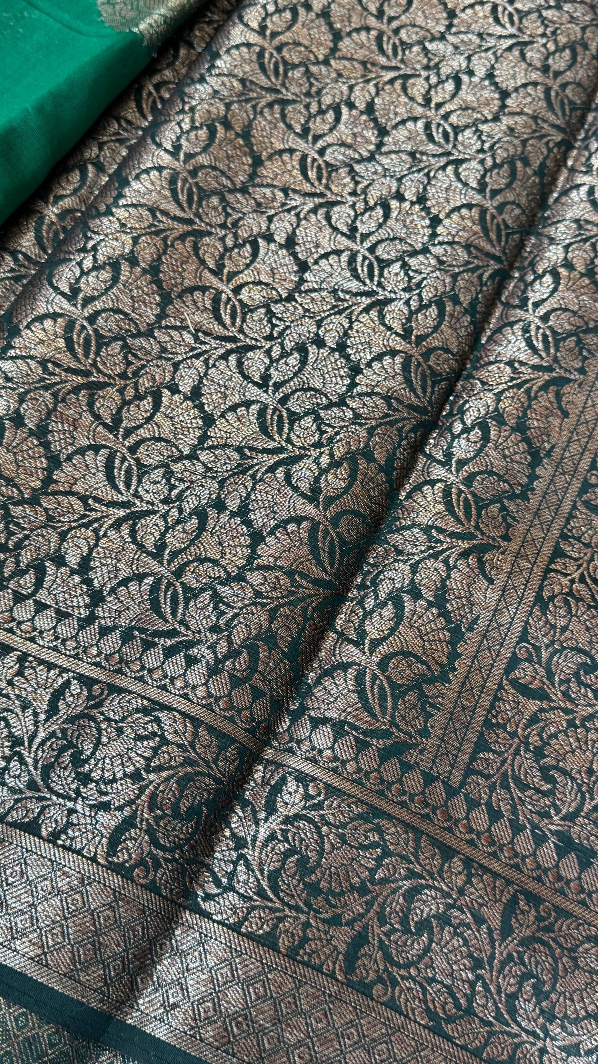 The saree is beautifully finished with antique-style zari borders, adding a regal charm that enhances its graceful drape. To complete the look, it comes with a fully brocade blouse in antique zari, crafted to perfectly complement the saree’s traditional appeal.