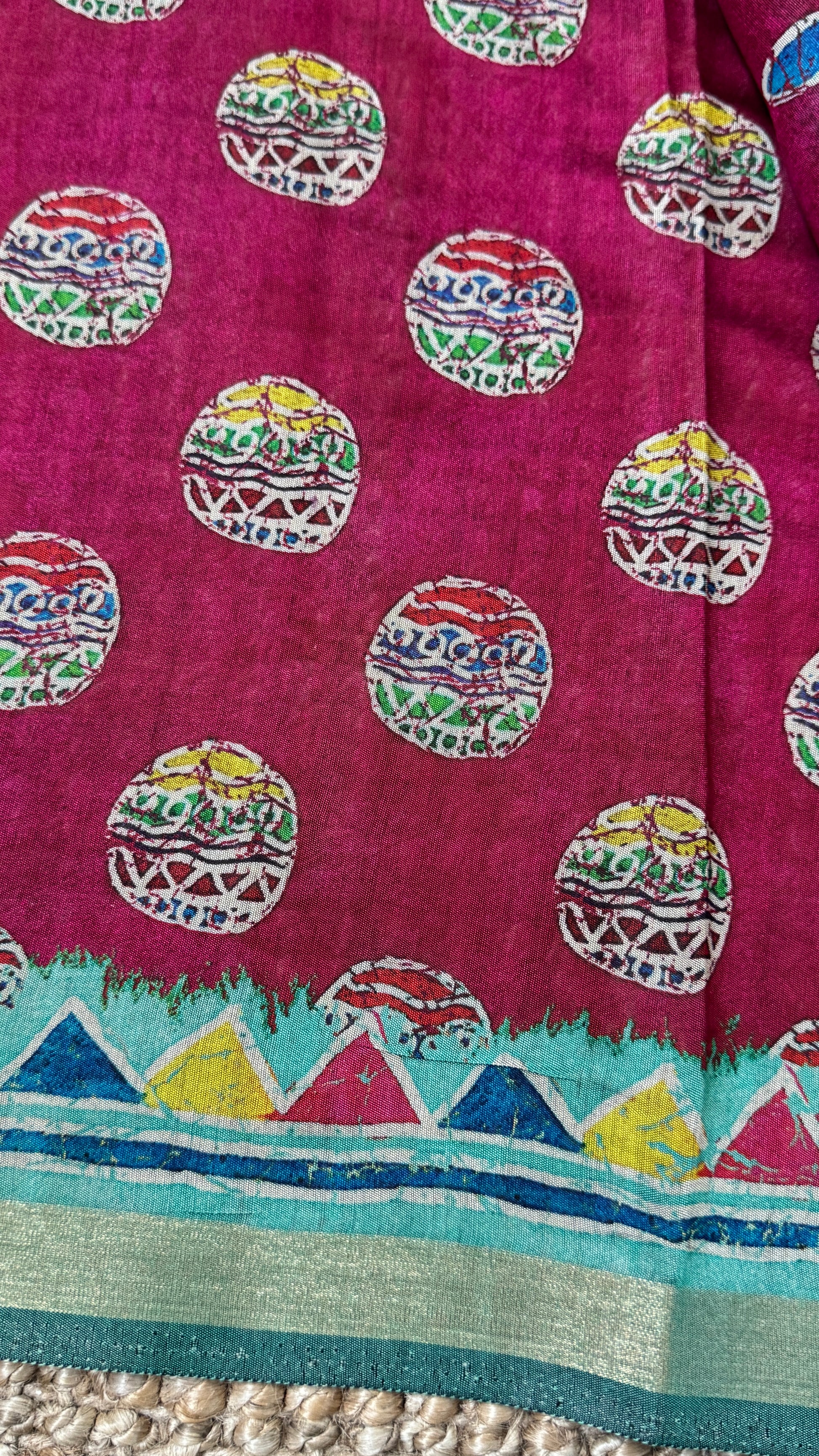 Pure Chanderi Cotton Silk Saree – Digital Batik Floral Print with Zari Border