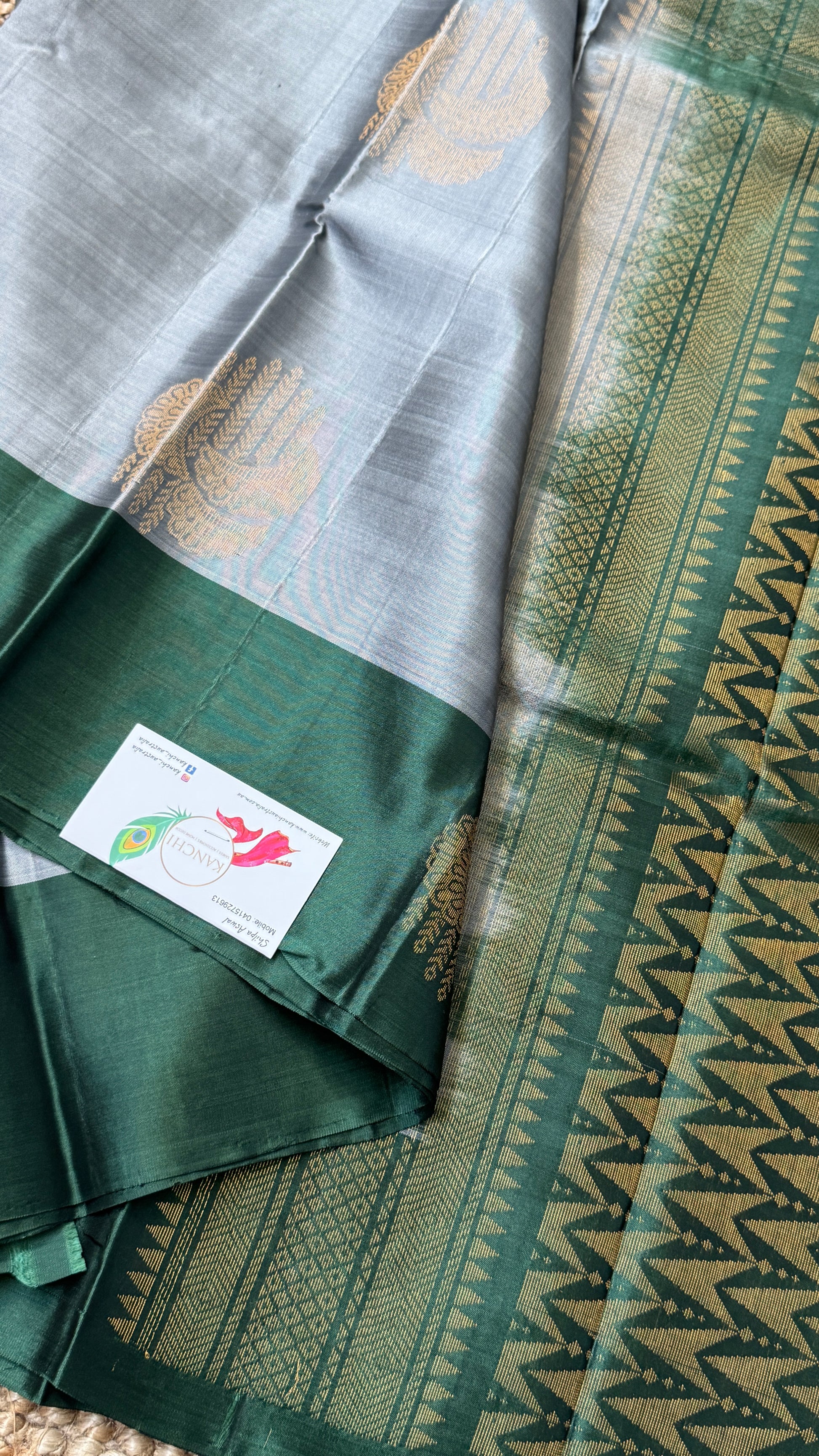The Grey body is adorned with intricate motifs woven throughout, exuding understated charm and classic elegance. Complementing the body is a dark green pallu and plain Bottle Green blouse, each carrying fine border detailing that enhances the traditional aesthetic. The saree features thin double borders on both sides, giving it a minimal yet sophisticated finish that drapes beautifully.