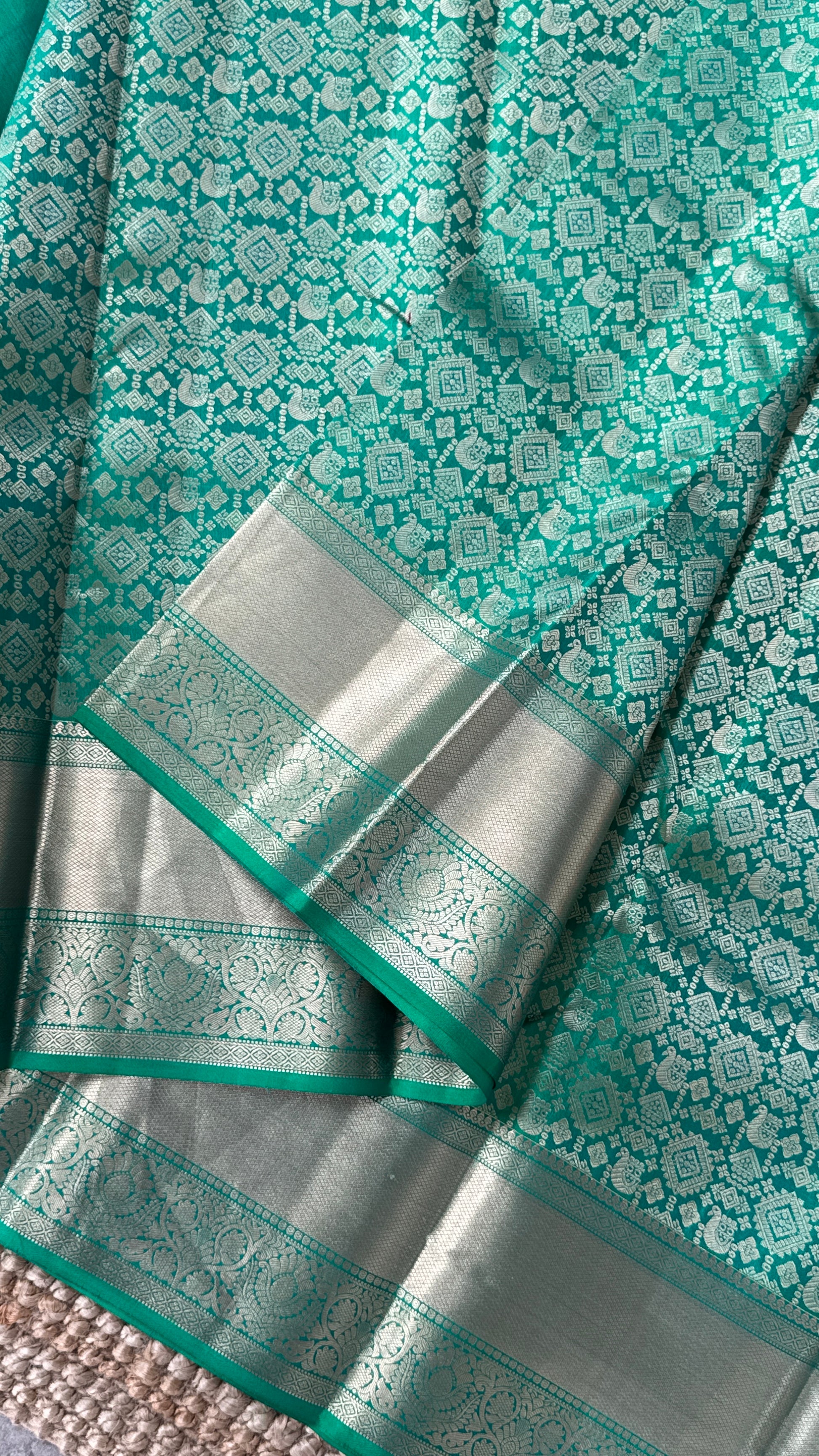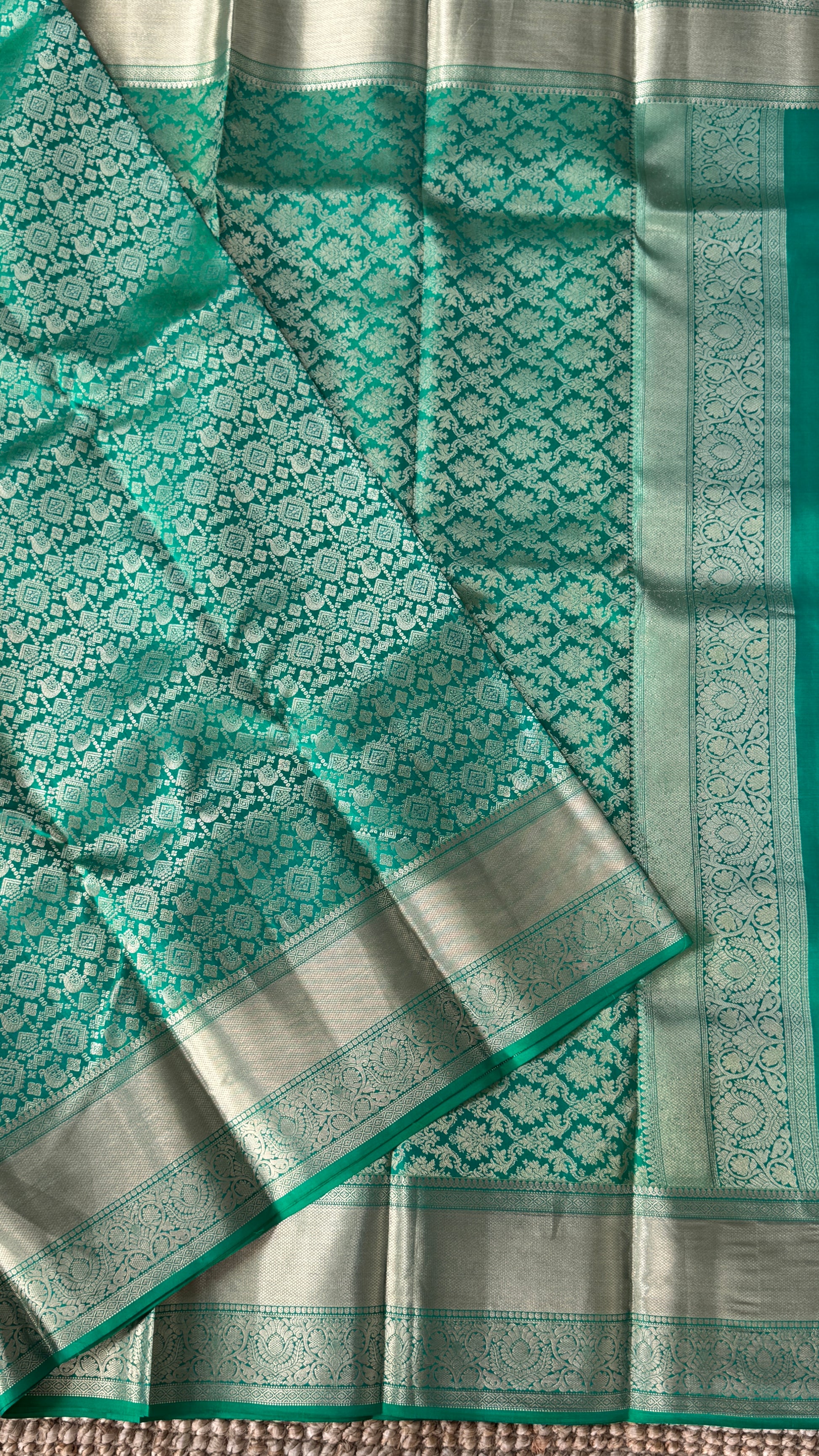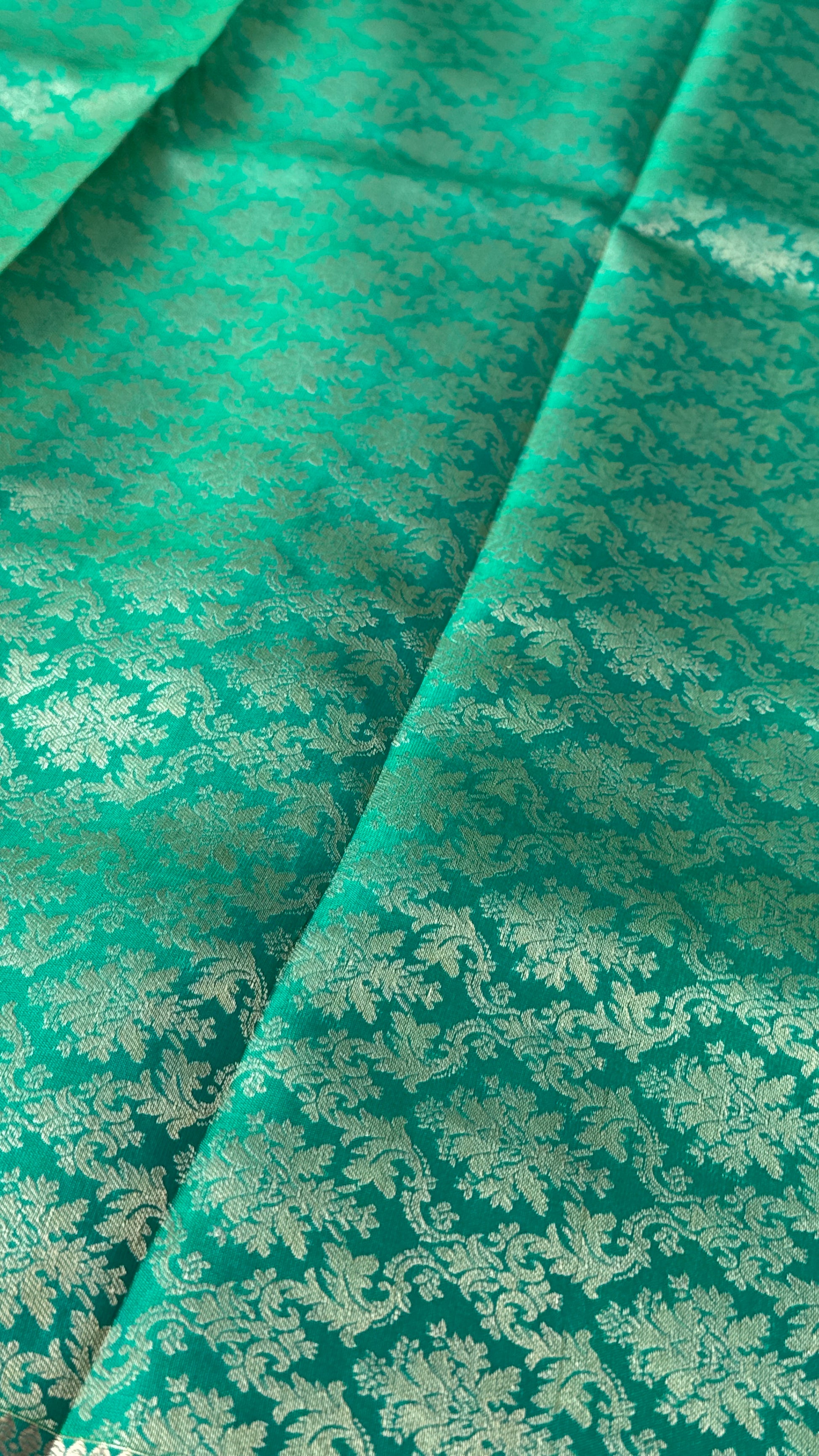 The saree features a mesmerizing green hue, beautifully complemented by opulent gold zari brocade intricately woven throughout the body. The floral jaal pattern, rendered in gleaming zari, adds depth and richness, creating an enchanting texture that glows under any light. Every inch of this drape speaks of regal splendor, making it an heirloom-worthy piece for the discerning connoisseur.