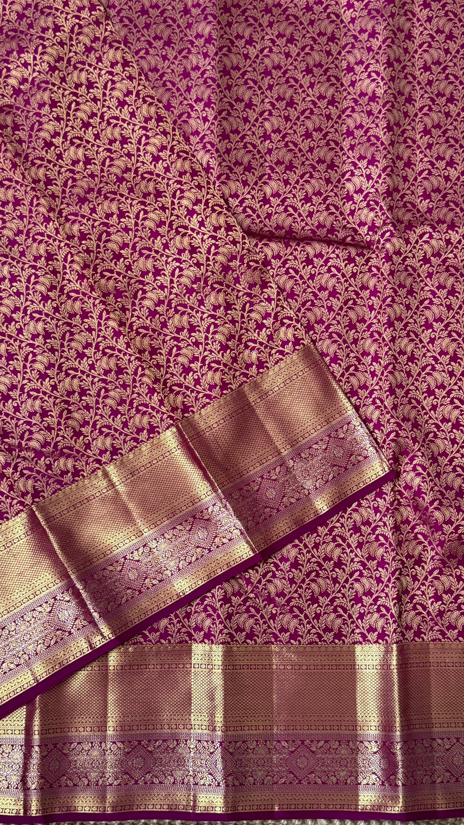 The border and pallu of the saree are adorned with detailed zari motifs—delicate floral vines and ornamental patterns that enhance its grandeur. The shimmering gold zari border, highlighted with a subtle pink undertone, perfectly frames the saree, lending it an aura of refinement and tradition. The pallu, luxuriously woven in gold, adds a touch of magnificence that completes the ensemble.