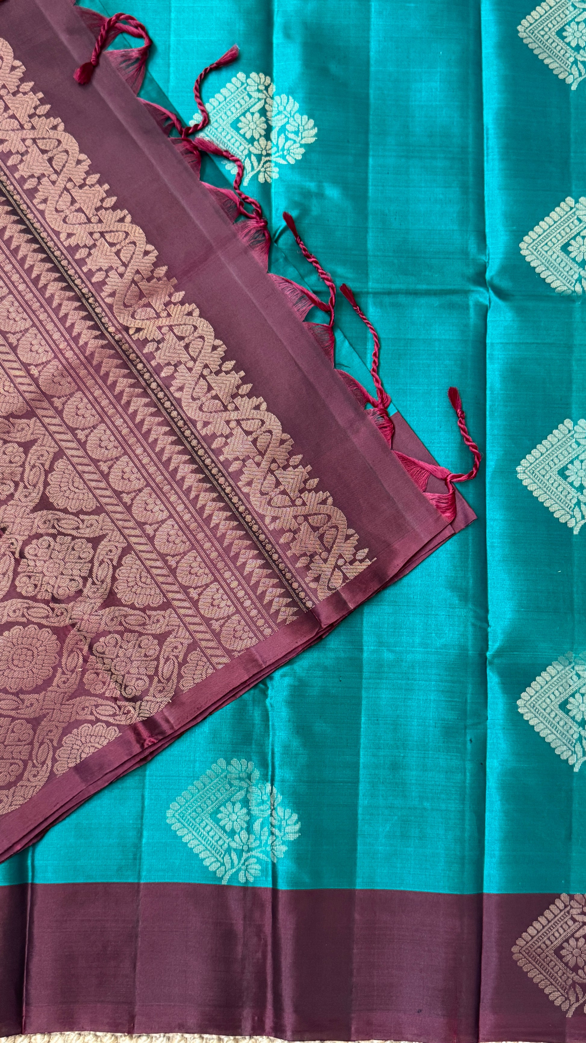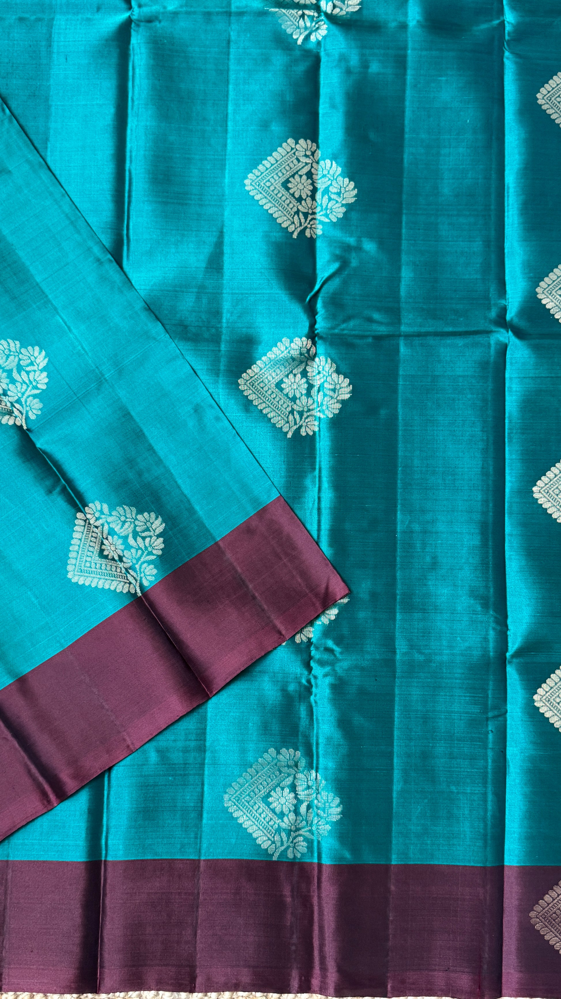 The Rama Blue body is adorned with intricate motifs woven throughout, exuding understated charm and classic elegance. Complementing the body is a dark maroon pallu and plain maroon blouse, each carrying fine border detailing that enhances the traditional aesthetic. The saree features thin double borders on both sides, giving it a minimal yet sophisticated finish that drapes beautifully.