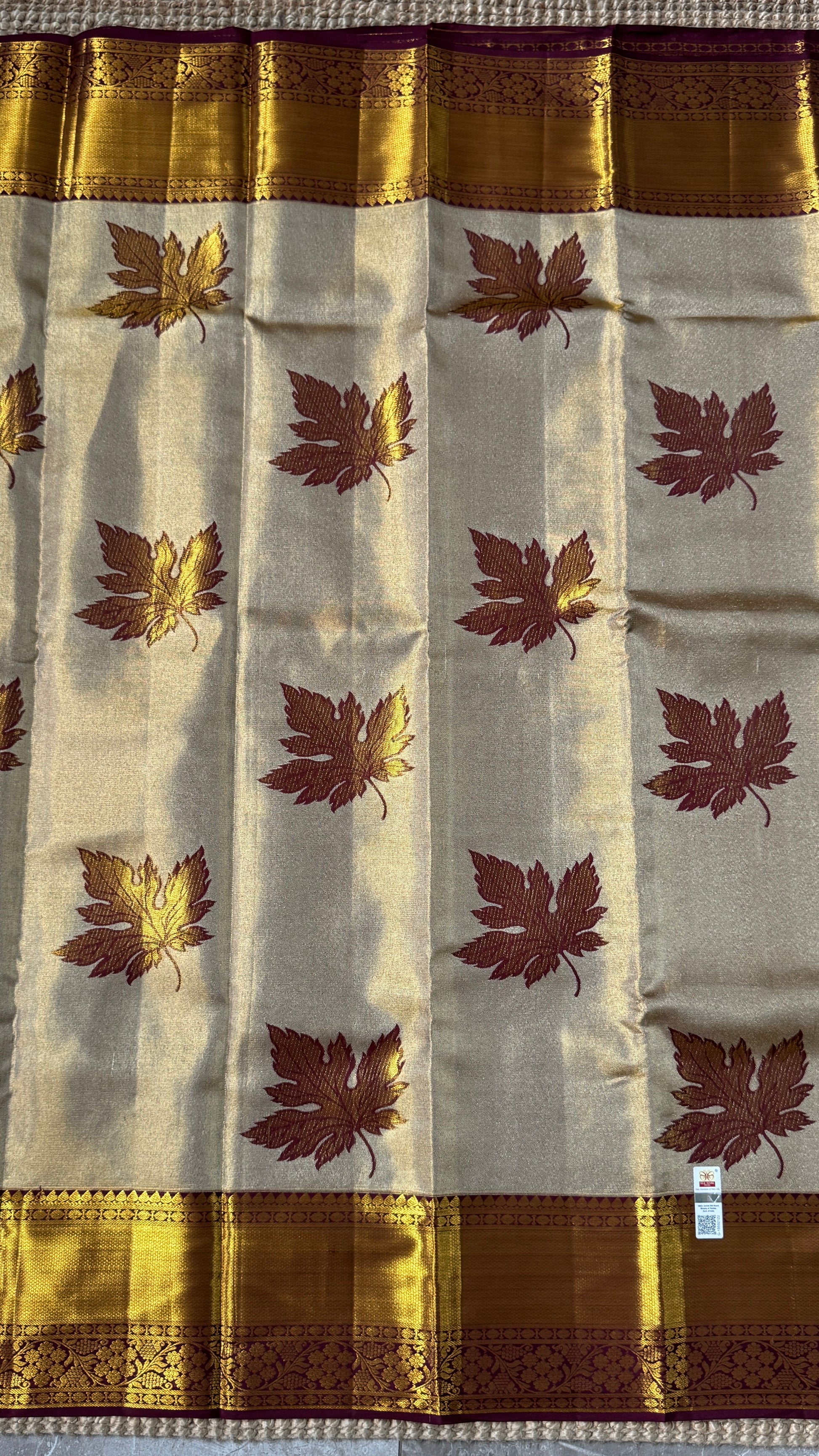 PURE TISSUE KANJIVARAM SILK HANDLOOM SAREE – LIGHT GOLD WITH MAROON border