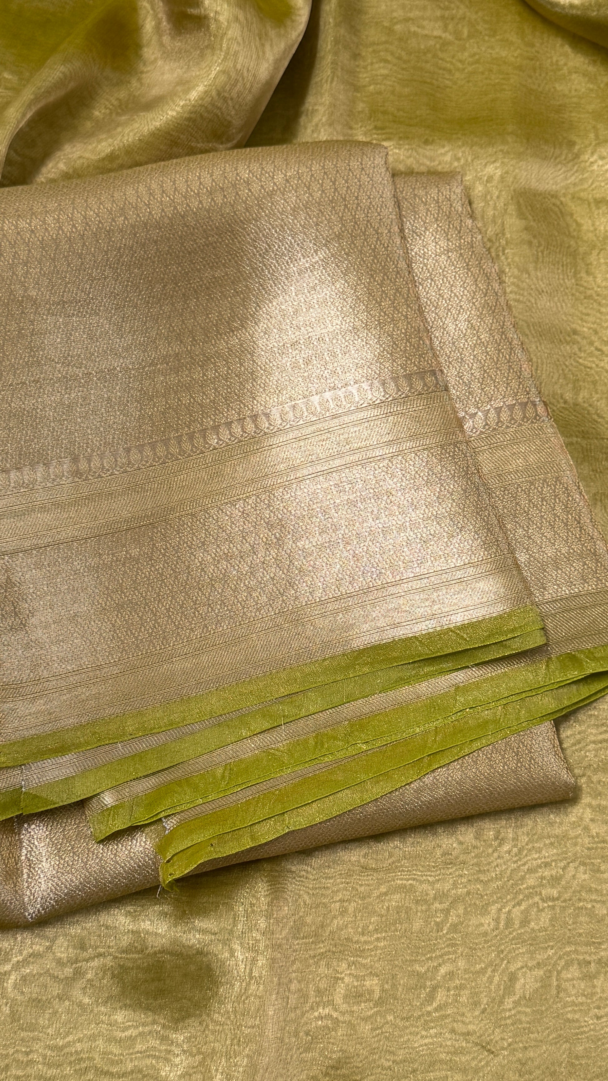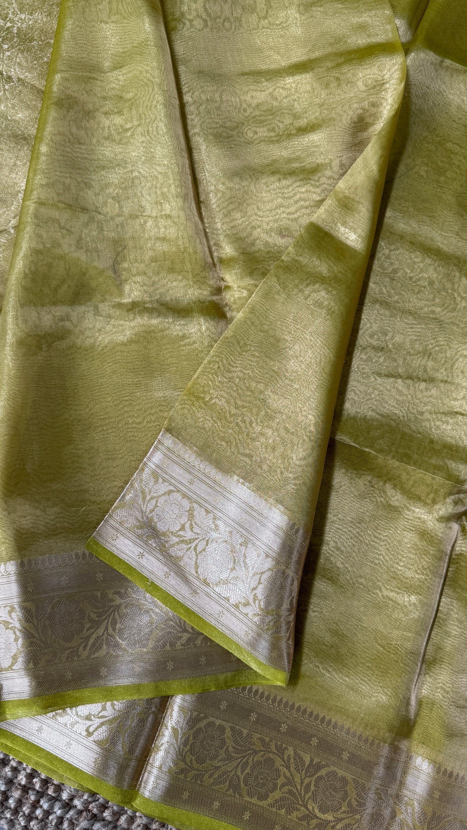 This Pure Tissue Silk Saree in a rare and beautiful Light Olive Green shade. Crafted from premium pure silk, this saree radiates a soft, natural sheen that enhances its luxurious feel and refined drape.