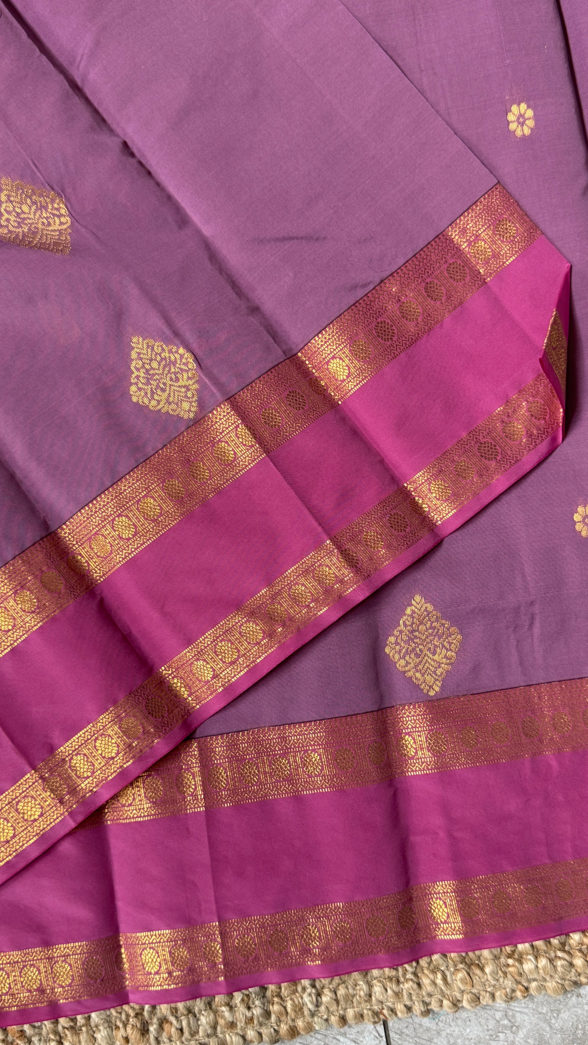 The body features a soft mauve shade, a colour that exudes sophistication, warmth, and auspiciousness. Its subtle sheen catches the light gently, giving the saree an understated yet luxurious glow. The light tone makes it perfect for temple visits, festive mornings, cultural ceremonies, and traditional family gatherings, offering a refined and graceful appearance in any setting.