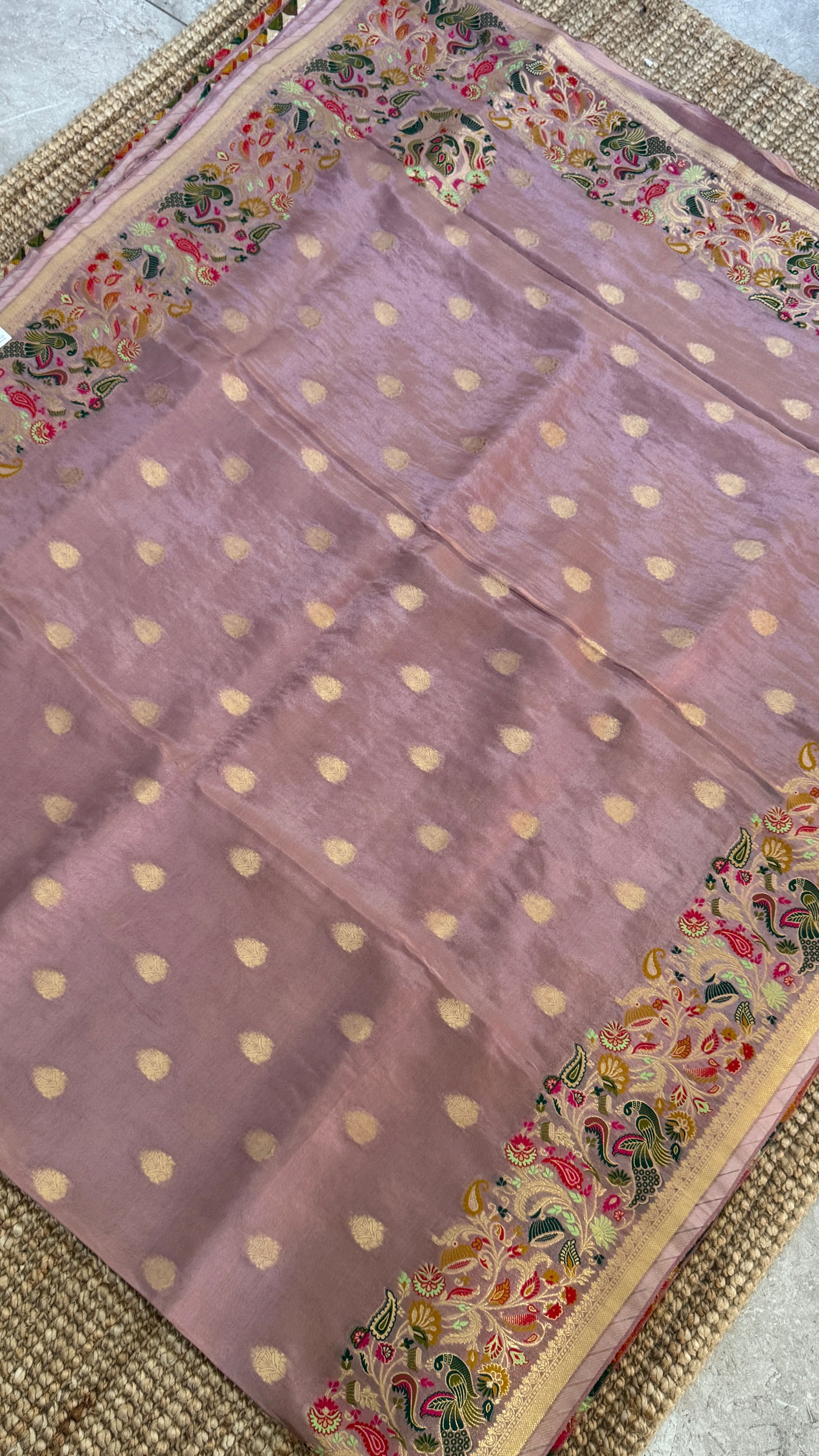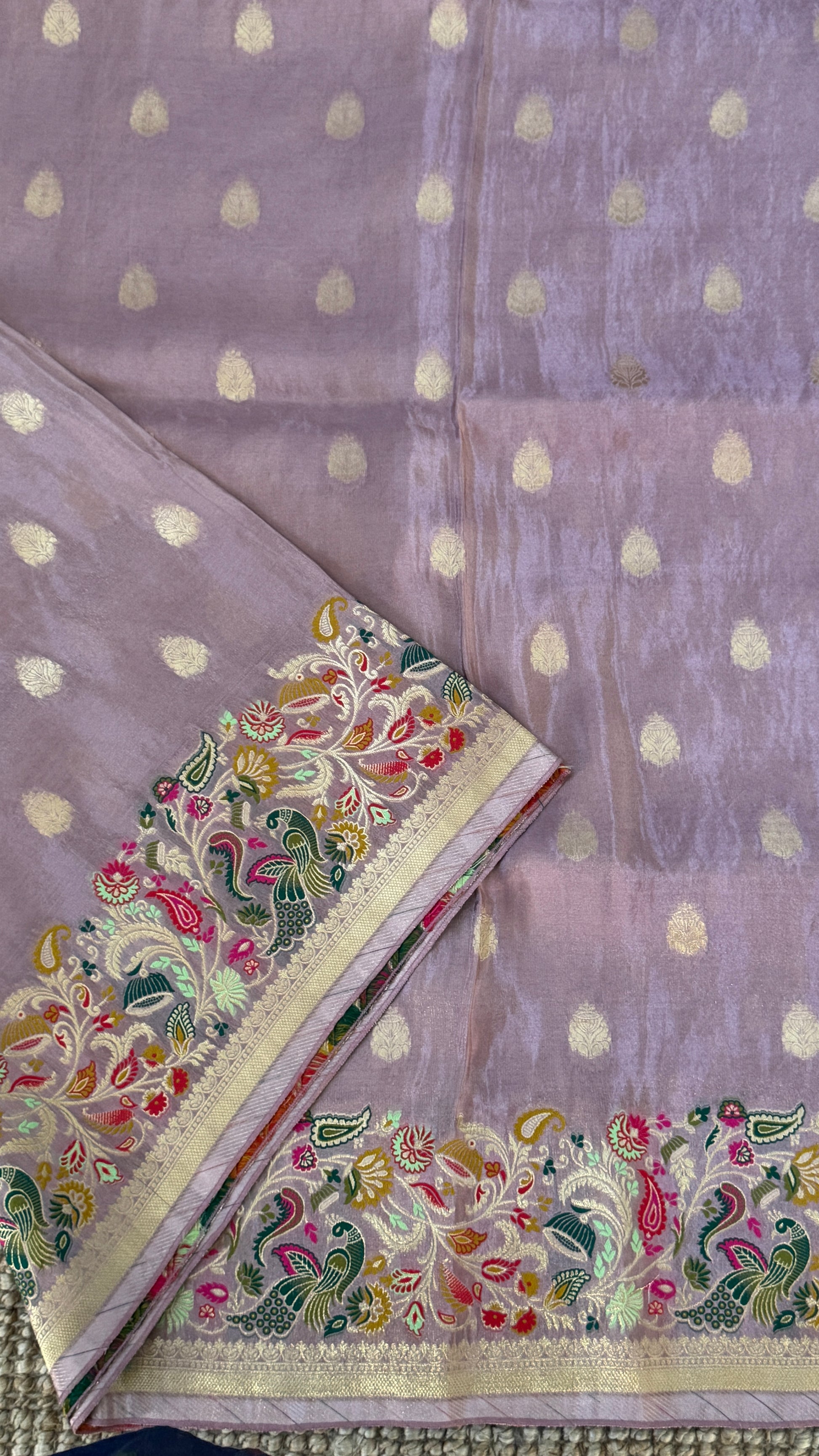 Design: Heavy thread weaving border features beautiful peacock & floral patterns